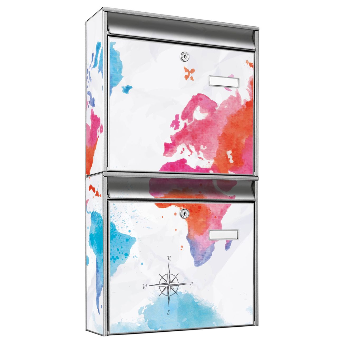FUNKTION: Die Burg-Wächter Briefkastenanlage mit Motiv Weltkarte pastell bietet Ihnen ausreichend Fassungsvermögen um auch A4 und C4 Sendungen zu empfangen. Das integrierte Namensschild lässt sich individuell beschriften. Wählen Sie aus den Grundfarben weiß, silber und schwarz. DESIGN: Die 2 Briefkästen haben ein ansprechendes und zeitloses Design, ohne dabei auf Funktionalität zu verzichten. Das Material ist sehr stabil, wetterfest und rostfrei. Durch das Motiv Weltkarte pastell werden die Postkästen zu einem Blickfang. DETAILS: Die Postkästen bestehen aus verzinktem Stahl der zusätzlich mit Klarlack versiegelt wurde. Die Kästen sind gesamt 64,5cm hoch, 36,2cm breit und 10cm tief. Das Motiv besteht aus einer wetter- und UV-festen Folie, die Ihren Briefkasten zusätzlich vor Kratzern schützt. Die Postkästen werden mit Montagematerial, je einem Namensschild und je zwei Schlüsseln geliefert. NUTZEN: Das Briefkastenset eignet sich für die Wandmontage, die Größe bietet genügend Platz für Sendungen aller Art. Das zeitlose Design sowie die stabile Bauart bieten Ihnen einen treuen Begleiter für Ihre Post. BANJADO: