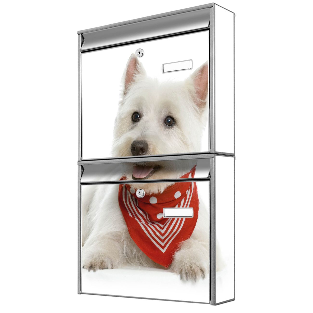 FUNKTION: Die Burg-Wächter Briefkastenanlage mit Motiv Westie bietet Ihnen ausreichend Fassungsvermögen um auch A4 und C4 Sendungen zu empfangen. Das integrierte Namensschild lässt sich individuell beschriften. Wählen Sie aus den Grundfarben weiß, silber und schwarz. DESIGN: Die 2 Briefkästen haben ein ansprechendes und zeitloses Design, ohne dabei auf Funktionalität zu verzichten. Das Material ist sehr stabil, wetterfest und rostfrei. Durch das Motiv Westie werden die Postkästen zu einem Blickfang. DETAILS: Die Postkästen bestehen aus verzinktem Stahl der zusätzlich mit Klarlack versiegelt wurde. Die Kästen sind gesamt 64,5cm hoch, 36,2cm breit und 10cm tief. Das Motiv besteht aus einer wetter- und UV-festen Folie, die Ihren Briefkasten zusätzlich vor Kratzern schützt. Die Postkästen werden mit Montagematerial, je einem Namensschild und je zwei Schlüsseln geliefert. NUTZEN: Das Briefkastenset eignet sich für die Wandmontage, die Größe bietet genügend Platz für Sendungen aller Art. Das zeitlose Design sowie die stabile Bauart bieten Ihnen einen treuen Begleiter für Ihre Post. BANJADO: