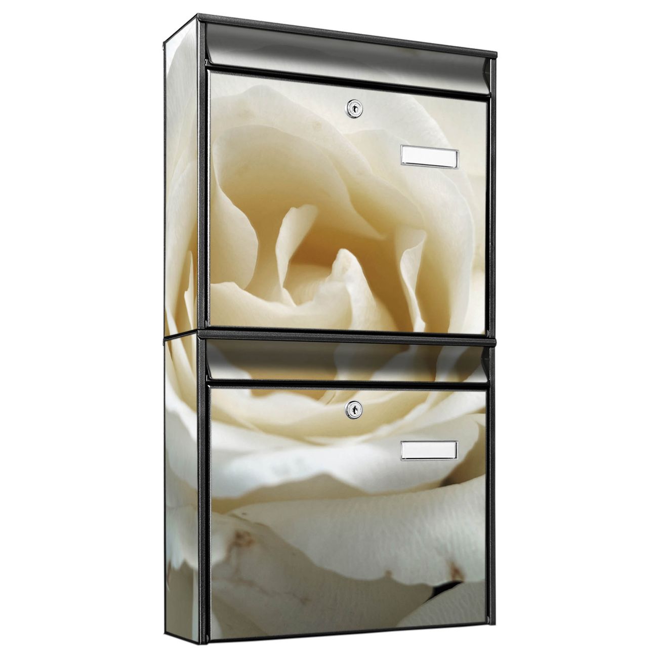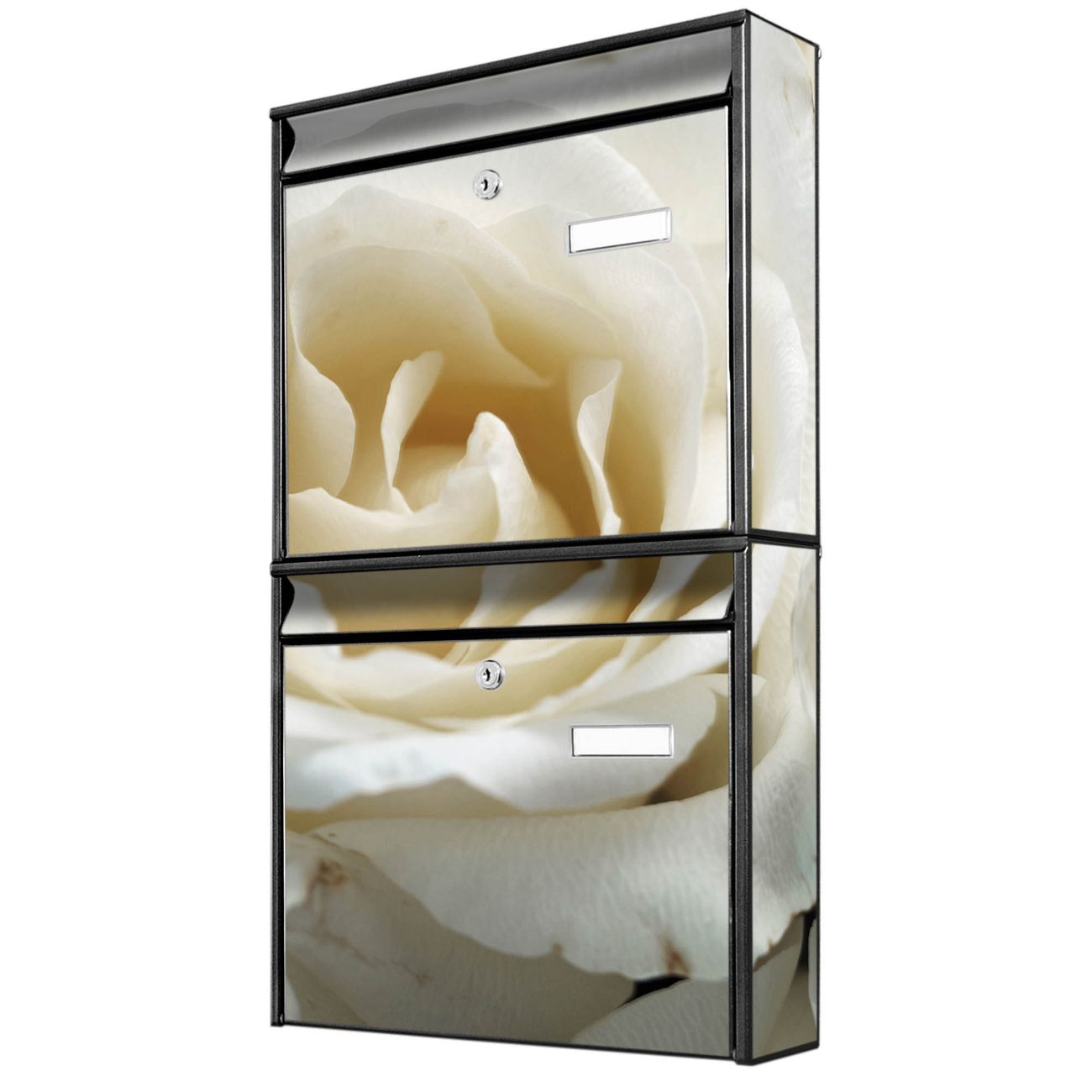 FUNKTION: Die Burg-Wächter Briefkastenanlage mit Motiv White Roses bietet Ihnen ausreichend Fassungsvermögen um auch A4 und C4 Sendungen zu empfangen. Das integrierte Namensschild lässt sich individuell beschriften. Wählen Sie aus den Grundfarben weiß, silber und schwarz. DESIGN: Die 2 Briefkästen haben ein ansprechendes und zeitloses Design, ohne dabei auf Funktionalität zu verzichten. Das Material ist sehr stabil, wetterfest und rostfrei. Durch das Motiv White Roses werden die Postkästen zu einem Blickfang. DETAILS: Die Postkästen bestehen aus verzinktem Stahl der zusätzlich mit Klarlack versiegelt wurde. Die Kästen sind gesamt 64,5cm hoch, 36,2cm breit und 10cm tief. Das Motiv besteht aus einer wetter- und UV-festen Folie, die Ihren Briefkasten zusätzlich vor Kratzern schützt. Die Postkästen werden mit Montagematerial, je einem Namensschild und je zwei Schlüsseln geliefert. NUTZEN: Das Briefkastenset eignet sich für die Wandmontage, die Größe bietet genügend Platz für Sendungen aller Art. Das zeitlose Design sowie die stabile Bauart bieten Ihnen einen treuen Begleiter für Ihre Post. BANJADO: