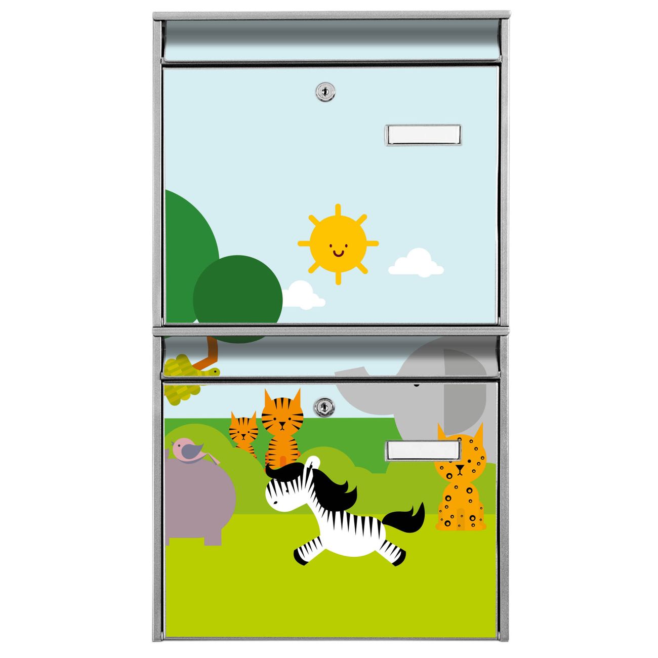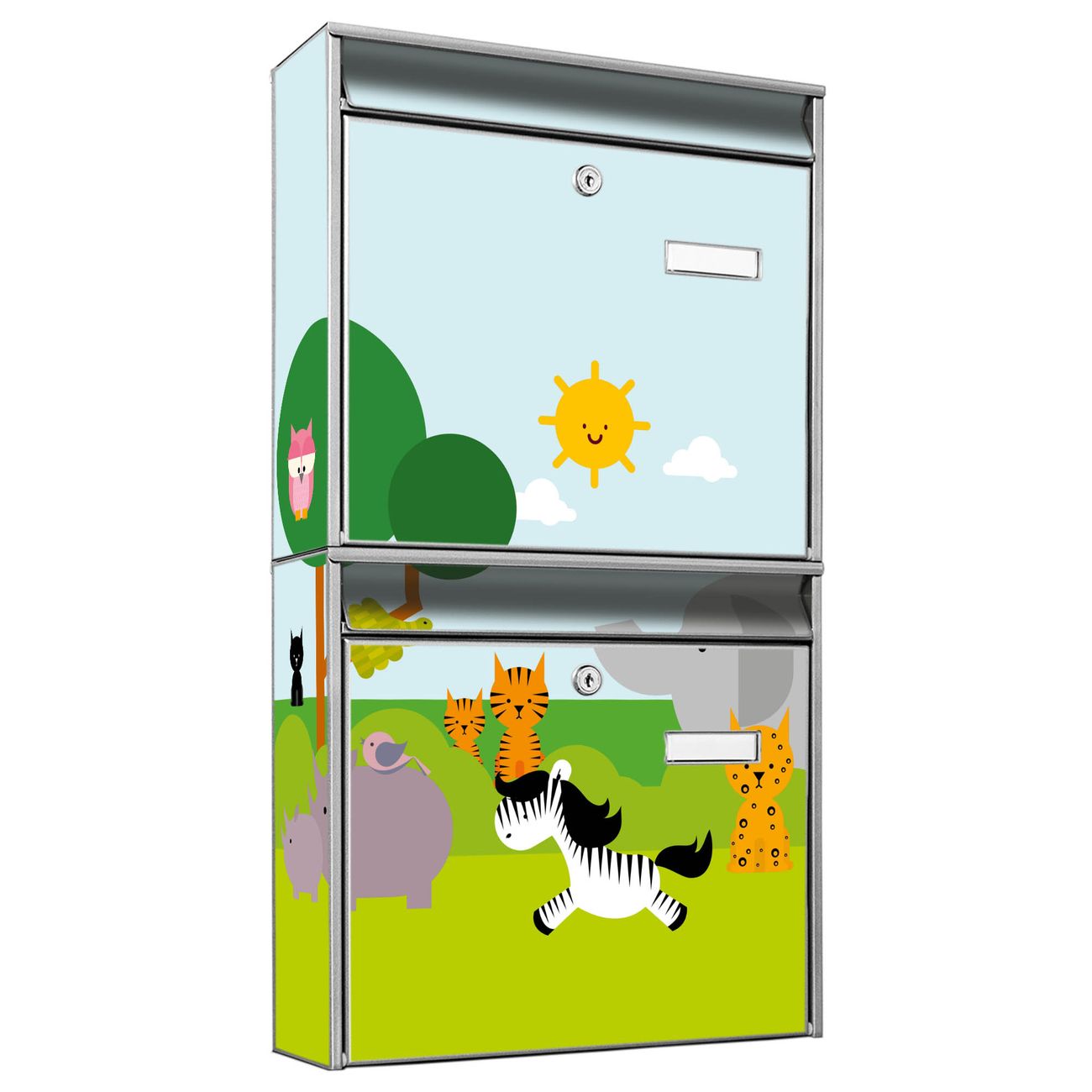 FUNKTION: Die Burg-Wächter Briefkastenanlage mit Motiv Wilde Tiere bietet Ihnen ausreichend Fassungsvermögen um auch A4 und C4 Sendungen zu empfangen. Das integrierte Namensschild lässt sich individuell beschriften. Wählen Sie aus den Grundfarben weiß, silber und schwarz. DESIGN: Die 2 Briefkästen haben ein ansprechendes und zeitloses Design, ohne dabei auf Funktionalität zu verzichten. Das Material ist sehr stabil, wetterfest und rostfrei. Durch das Motiv Wilde Tiere werden die Postkästen zu einem Blickfang. DETAILS: Die Postkästen bestehen aus verzinktem Stahl der zusätzlich mit Klarlack versiegelt wurde. Die Kästen sind gesamt 64,5cm hoch, 36,2cm breit und 10cm tief. Das Motiv besteht aus einer wetter- und UV-festen Folie, die Ihren Briefkasten zusätzlich vor Kratzern schützt. Die Postkästen werden mit Montagematerial, je einem Namensschild und je zwei Schlüsseln geliefert. NUTZEN: Das Briefkastenset eignet sich für die Wandmontage, die Größe bietet genügend Platz für Sendungen aller Art. Das zeitlose Design sowie die stabile Bauart bieten Ihnen einen treuen Begleiter für Ihre Post. BANJADO: