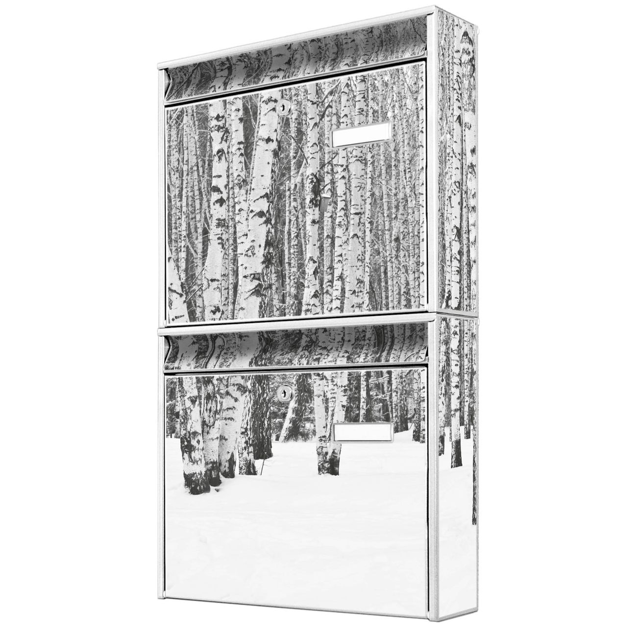 FUNKTION: Die Burg-Wächter Briefkastenanlage mit Motiv Winterlicher Birkenwald bietet Ihnen ausreichend Fassungsvermögen um auch A4 und C4 Sendungen zu empfangen. Das integrierte Namensschild lässt sich individuell beschriften. Wählen Sie aus den Grundfarben weiß, silber und schwarz. DESIGN: Die 2 Briefkästen haben ein ansprechendes und zeitloses Design, ohne dabei auf Funktionalität zu verzichten. Das Material ist sehr stabil, wetterfest und rostfrei. Durch das Motiv Winterlicher Birkenwald werden die Postkästen zu einem Blickfang. DETAILS: Die Postkästen bestehen aus verzinktem Stahl der zusätzlich mit Klarlack versiegelt wurde. Die Kästen sind gesamt 64,5cm hoch, 36,2cm breit und 10cm tief. Das Motiv besteht aus einer wetter- und UV-festen Folie, die Ihren Briefkasten zusätzlich vor Kratzern schützt. Die Postkästen werden mit Montagematerial, je einem Namensschild und je zwei Schlüsseln geliefert. NUTZEN: Das Briefkastenset eignet sich für die Wandmontage, die Größe bietet genügend Platz für Sendungen aller Art. Das zeitlose Design sowie die stabile Bauart bieten Ihnen einen treuen Begleiter für Ihre Post. BANJADO: