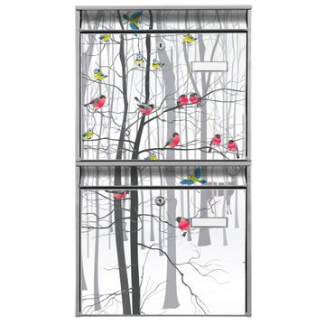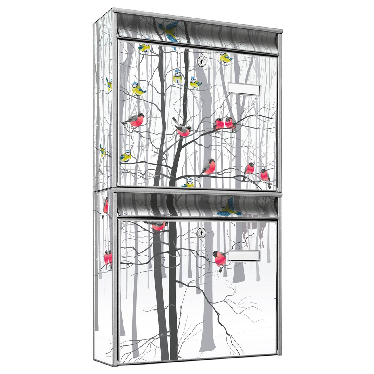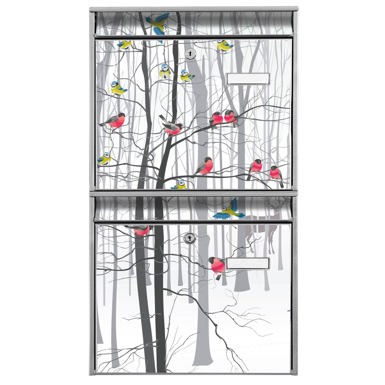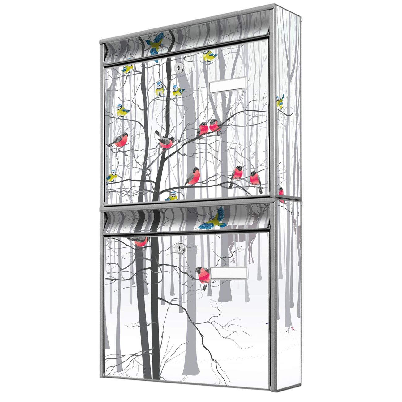 FUNKTION: Die Burg-Wächter Briefkastenanlage mit Motiv Winterwald bietet Ihnen ausreichend Fassungsvermögen um auch A4 und C4 Sendungen zu empfangen. Das integrierte Namensschild lässt sich individuell beschriften. Wählen Sie aus den Grundfarben weiß, silber und schwarz. DESIGN: Die 2 Briefkästen haben ein ansprechendes und zeitloses Design, ohne dabei auf Funktionalität zu verzichten. Das Material ist sehr stabil, wetterfest und rostfrei. Durch das Motiv Winterwald werden die Postkästen zu einem Blickfang. DETAILS: Die Postkästen bestehen aus verzinktem Stahl der zusätzlich mit Klarlack versiegelt wurde. Die Kästen sind gesamt 64,5cm hoch, 36,2cm breit und 10cm tief. Das Motiv besteht aus einer wetter- und UV-festen Folie, die Ihren Briefkasten zusätzlich vor Kratzern schützt. Die Postkästen werden mit Montagematerial, je einem Namensschild und je zwei Schlüsseln geliefert. NUTZEN: Das Briefkastenset eignet sich für die Wandmontage, die Größe bietet genügend Platz für Sendungen aller Art. Das zeitlose Design sowie die stabile Bauart bieten Ihnen einen treuen Begleiter für Ihre Post. BANJADO: