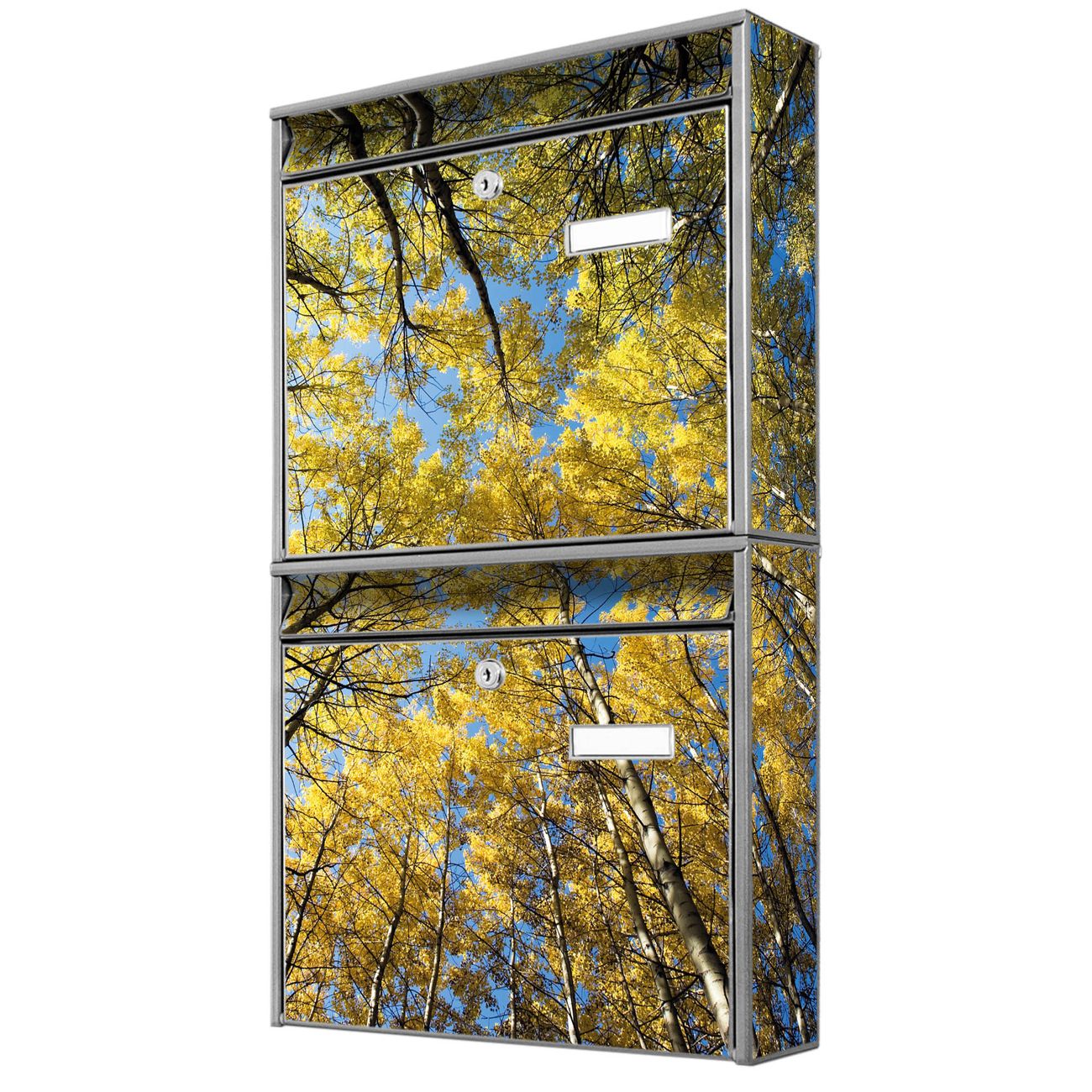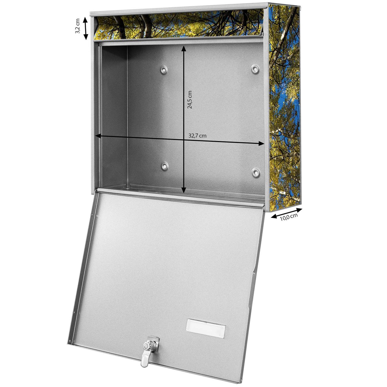 FUNKTION: Die Burg-Wächter Briefkastenanlage mit Motiv Wipfel bietet Ihnen ausreichend Fassungsvermögen um auch A4 und C4 Sendungen zu empfangen. Das integrierte Namensschild lässt sich individuell beschriften. Wählen Sie aus den Grundfarben weiß, silber und schwarz. DESIGN: Die 2 Briefkästen haben ein ansprechendes und zeitloses Design, ohne dabei auf Funktionalität zu verzichten. Das Material ist sehr stabil, wetterfest und rostfrei. Durch das Motiv Wipfel werden die Postkästen zu einem Blickfang. DETAILS: Die Postkästen bestehen aus verzinktem Stahl der zusätzlich mit Klarlack versiegelt wurde. Die Kästen sind gesamt 64,5cm hoch, 36,2cm breit und 10cm tief. Das Motiv besteht aus einer wetter- und UV-festen Folie, die Ihren Briefkasten zusätzlich vor Kratzern schützt. Die Postkästen werden mit Montagematerial, je einem Namensschild und je zwei Schlüsseln geliefert. NUTZEN: Das Briefkastenset eignet sich für die Wandmontage, die Größe bietet genügend Platz für Sendungen aller Art. Das zeitlose Design sowie die stabile Bauart bieten Ihnen einen treuen Begleiter für Ihre Post. BANJADO: