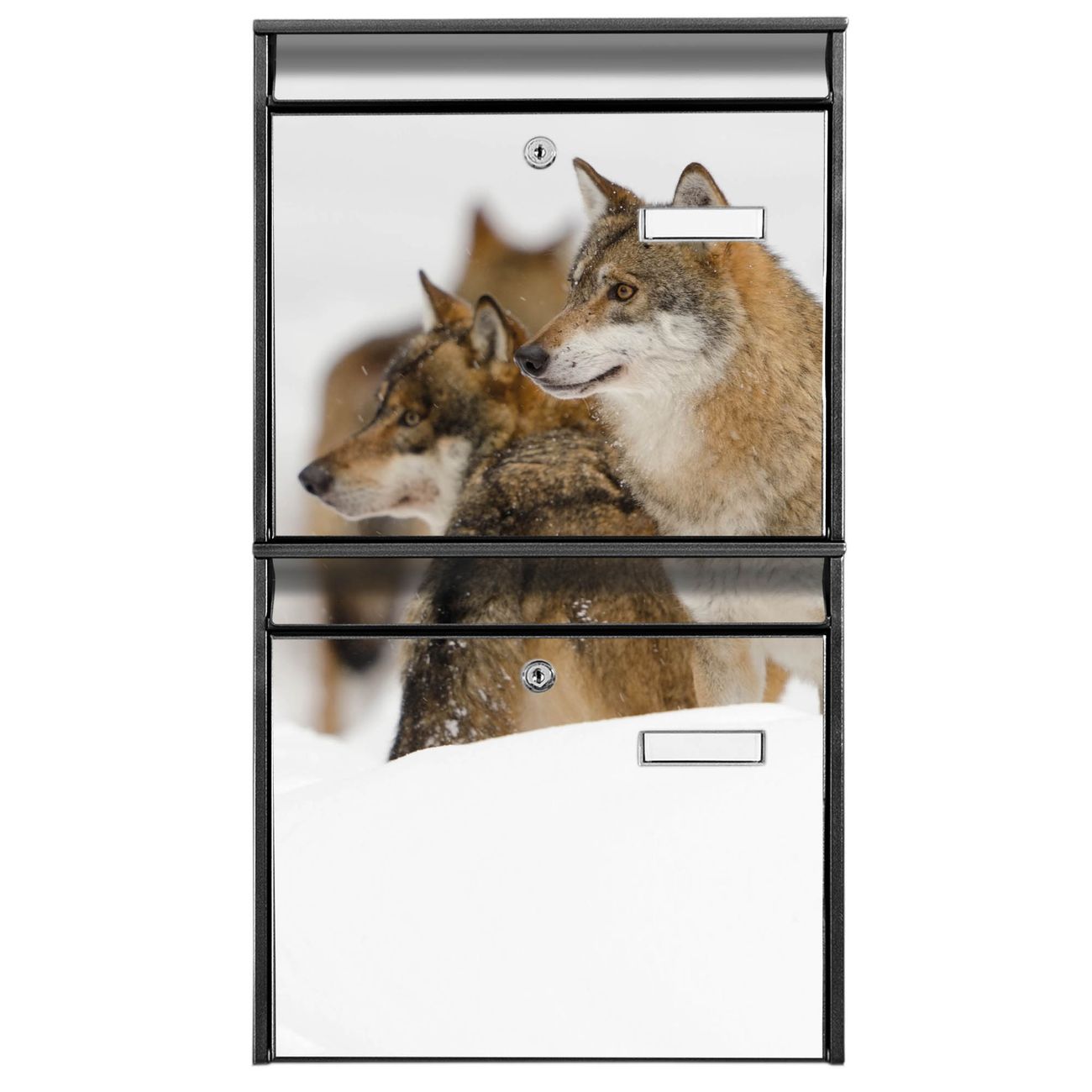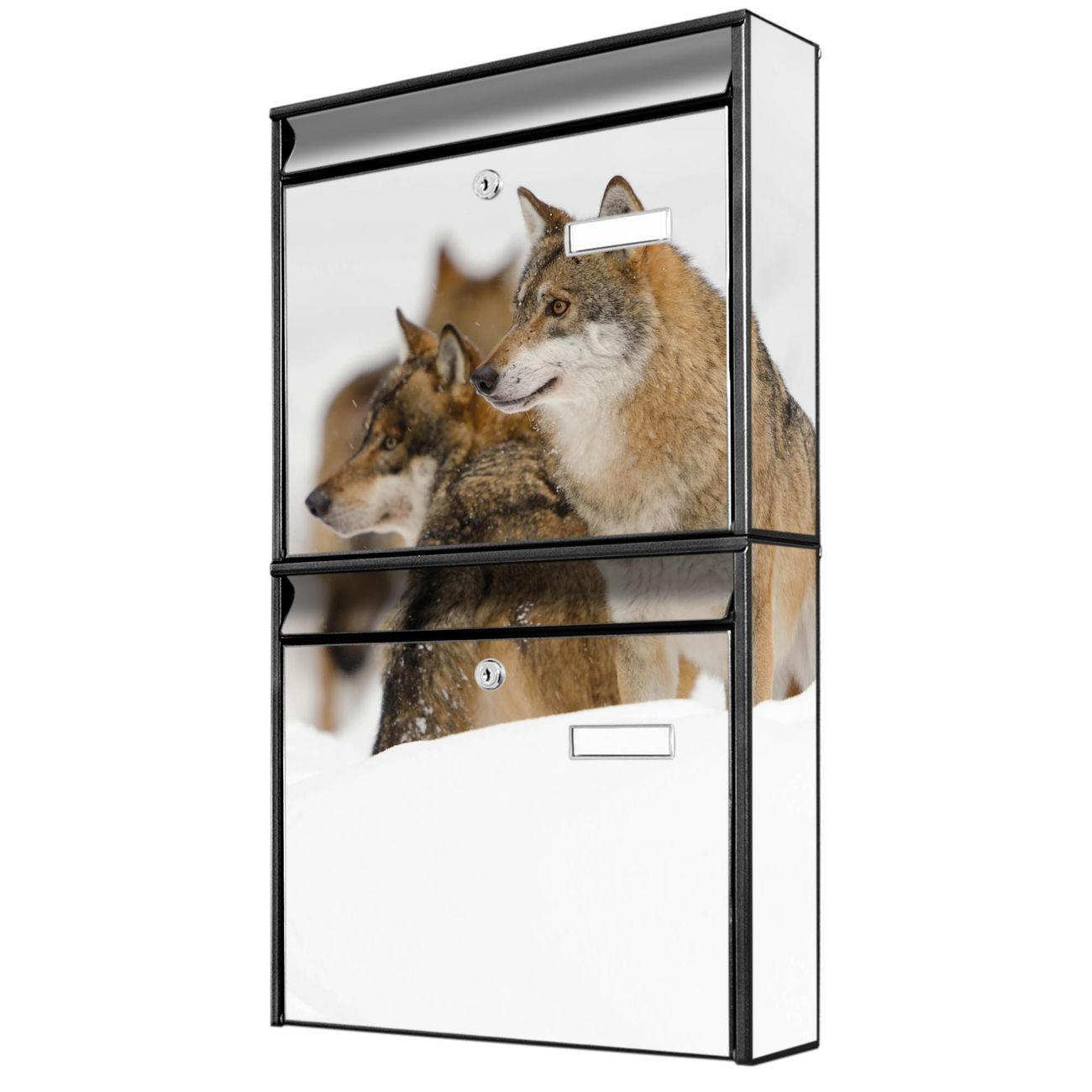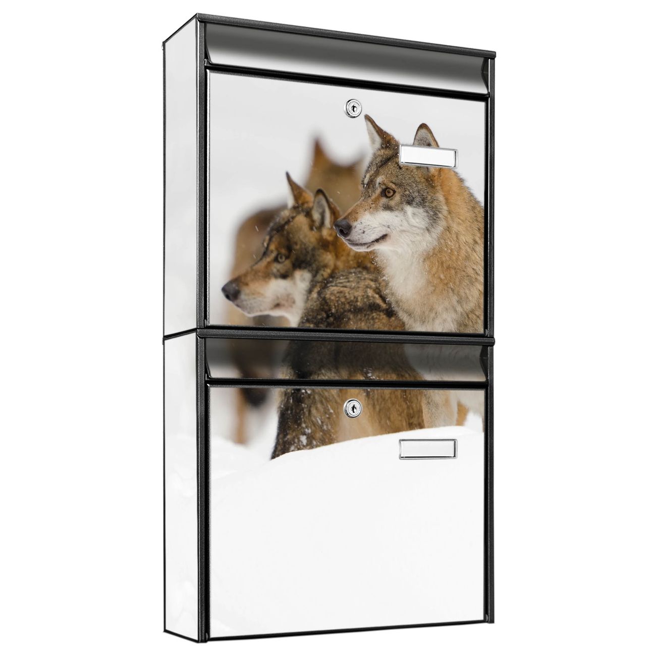 FUNKTION: Die Burg-Wächter Briefkastenanlage mit Motiv Wölfe bietet Ihnen ausreichend Fassungsvermögen um auch A4 und C4 Sendungen zu empfangen. Das integrierte Namensschild lässt sich individuell beschriften. Wählen Sie aus den Grundfarben weiß, silber und schwarz. DESIGN: Die 2 Briefkästen haben ein ansprechendes und zeitloses Design, ohne dabei auf Funktionalität zu verzichten. Das Material ist sehr stabil, wetterfest und rostfrei. Durch das Motiv Wölfe werden die Postkästen zu einem Blickfang. DETAILS: Die Postkästen bestehen aus verzinktem Stahl der zusätzlich mit Klarlack versiegelt wurde. Die Kästen sind gesamt 64,5cm hoch, 36,2cm breit und 10cm tief. Das Motiv besteht aus einer wetter- und UV-festen Folie, die Ihren Briefkasten zusätzlich vor Kratzern schützt. Die Postkästen werden mit Montagematerial, je einem Namensschild und je zwei Schlüsseln geliefert. NUTZEN: Das Briefkastenset eignet sich für die Wandmontage, die Größe bietet genügend Platz für Sendungen aller Art. Das zeitlose Design sowie die stabile Bauart bieten Ihnen einen treuen Begleiter für Ihre Post. BANJADO: