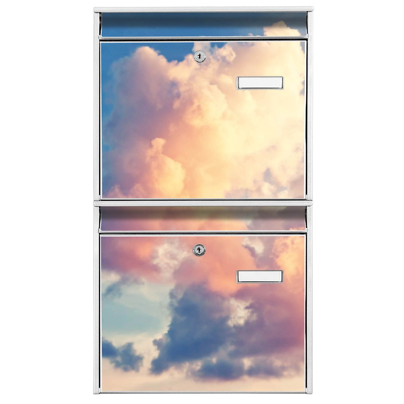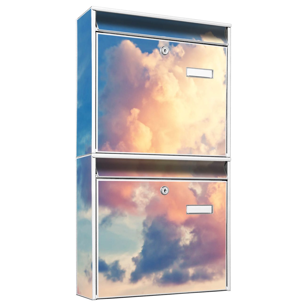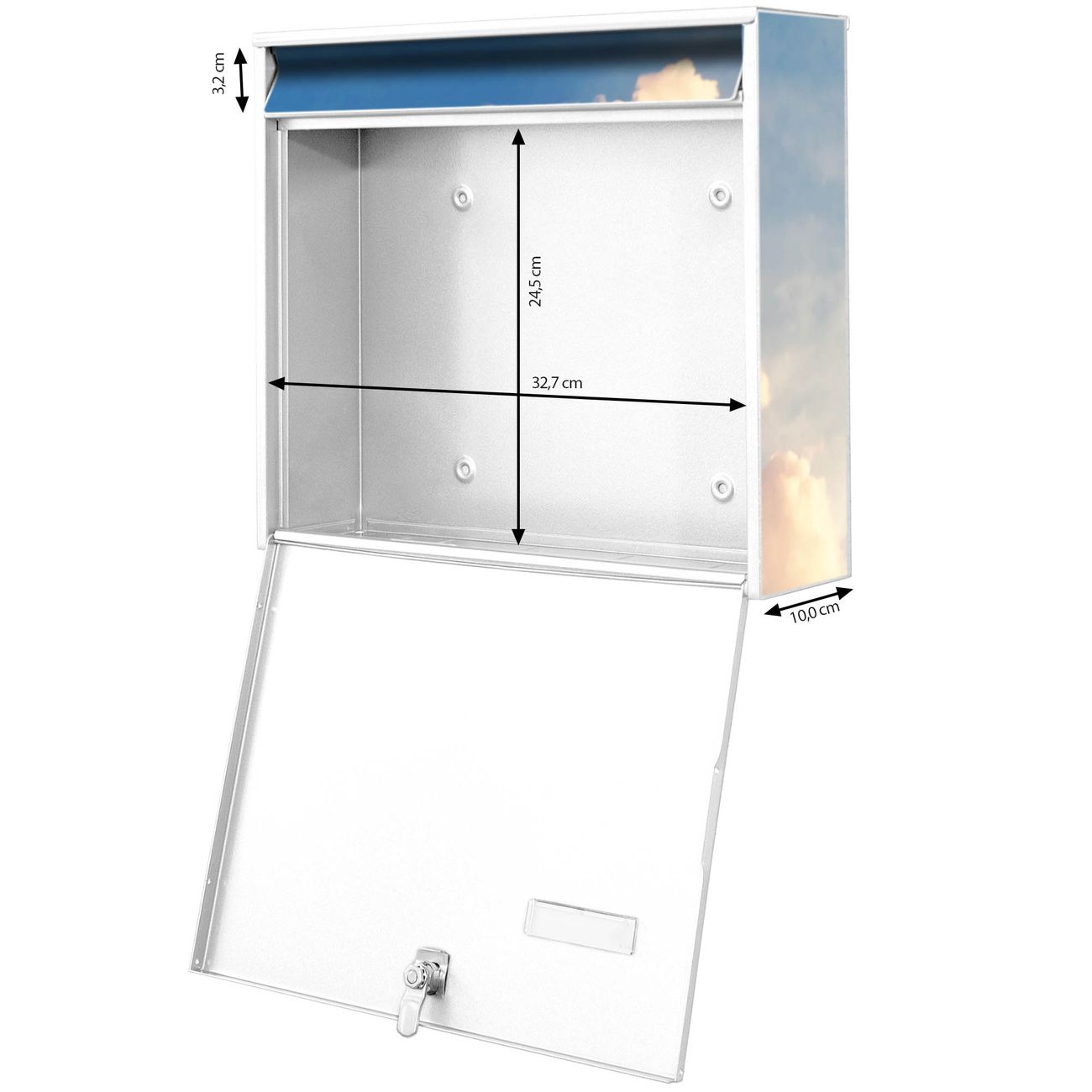 FUNKTION: Die Burg-Wächter Briefkastenanlage mit Motiv Wolken 10 bietet Ihnen ausreichend Fassungsvermögen um auch A4 und C4 Sendungen zu empfangen. Das integrierte Namensschild lässt sich individuell beschriften. Wählen Sie aus den Grundfarben weiß, silber und schwarz. DESIGN: Die 2 Briefkästen haben ein ansprechendes und zeitloses Design, ohne dabei auf Funktionalität zu verzichten. Das Material ist sehr stabil, wetterfest und rostfrei. Durch das Motiv Wolken 10 werden die Postkästen zu einem Blickfang. DETAILS: Die Postkästen bestehen aus verzinktem Stahl der zusätzlich mit Klarlack versiegelt wurde. Die Kästen sind gesamt 64,5cm hoch, 36,2cm breit und 10cm tief. Das Motiv besteht aus einer wetter- und UV-festen Folie, die Ihren Briefkasten zusätzlich vor Kratzern schützt. Die Postkästen werden mit Montagematerial, je einem Namensschild und je zwei Schlüsseln geliefert. NUTZEN: Das Briefkastenset eignet sich für die Wandmontage, die Größe bietet genügend Platz für Sendungen aller Art. Das zeitlose Design sowie die stabile Bauart bieten Ihnen einen treuen Begleiter für Ihre Post. BANJADO: