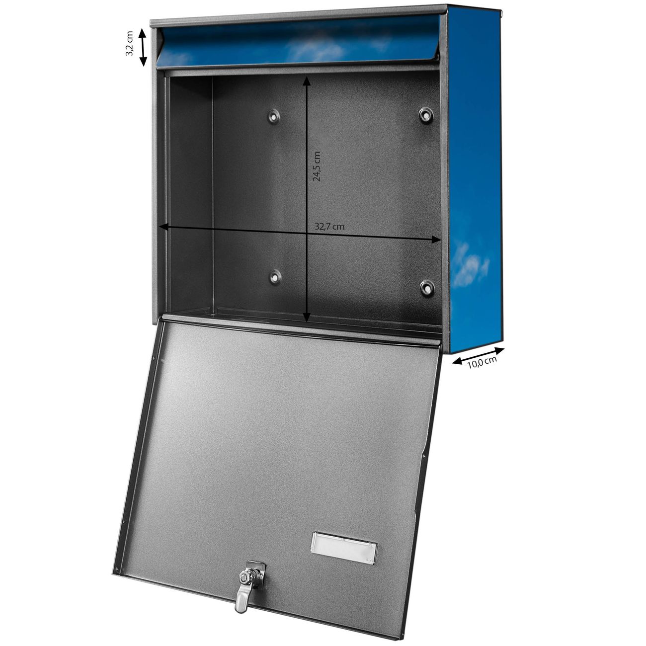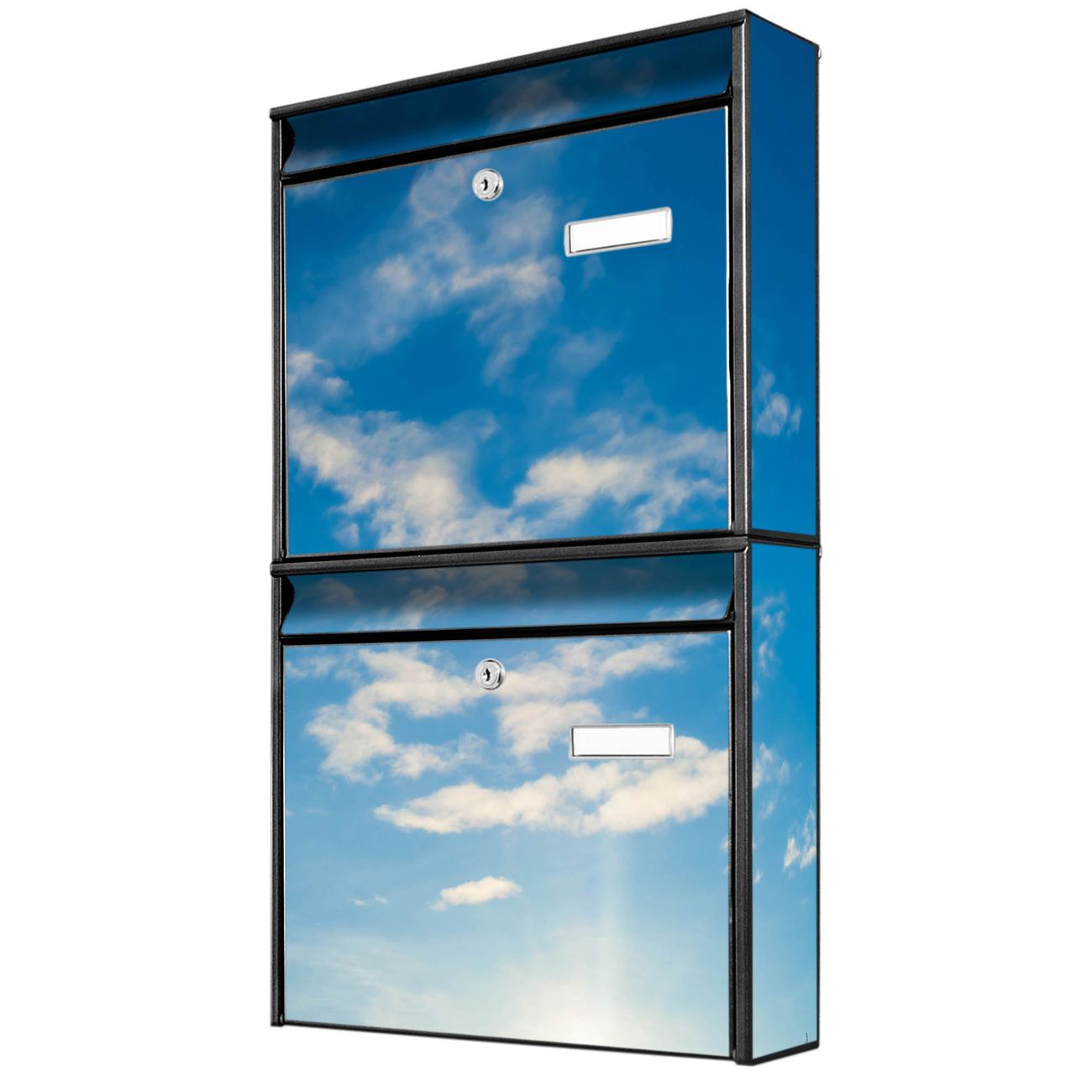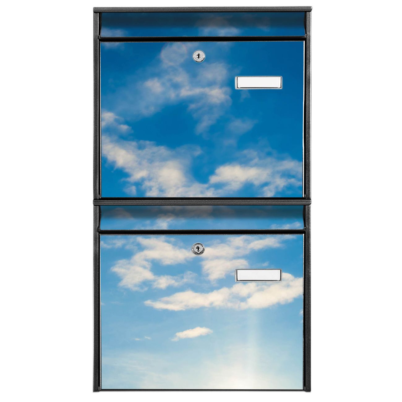 FUNKTION: Die Burg-Wächter Briefkastenanlage mit Motiv Wolken 11 bietet Ihnen ausreichend Fassungsvermögen um auch A4 und C4 Sendungen zu empfangen. Das integrierte Namensschild lässt sich individuell beschriften. Wählen Sie aus den Grundfarben weiß, silber und schwarz. DESIGN: Die 2 Briefkästen haben ein ansprechendes und zeitloses Design, ohne dabei auf Funktionalität zu verzichten. Das Material ist sehr stabil, wetterfest und rostfrei. Durch das Motiv Wolken 11 werden die Postkästen zu einem Blickfang. DETAILS: Die Postkästen bestehen aus verzinktem Stahl der zusätzlich mit Klarlack versiegelt wurde. Die Kästen sind gesamt 64,5cm hoch, 36,2cm breit und 10cm tief. Das Motiv besteht aus einer wetter- und UV-festen Folie, die Ihren Briefkasten zusätzlich vor Kratzern schützt. Die Postkästen werden mit Montagematerial, je einem Namensschild und je zwei Schlüsseln geliefert. NUTZEN: Das Briefkastenset eignet sich für die Wandmontage, die Größe bietet genügend Platz für Sendungen aller Art. Das zeitlose Design sowie die stabile Bauart bieten Ihnen einen treuen Begleiter für Ihre Post. BANJADO:
