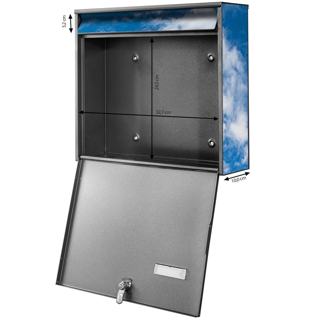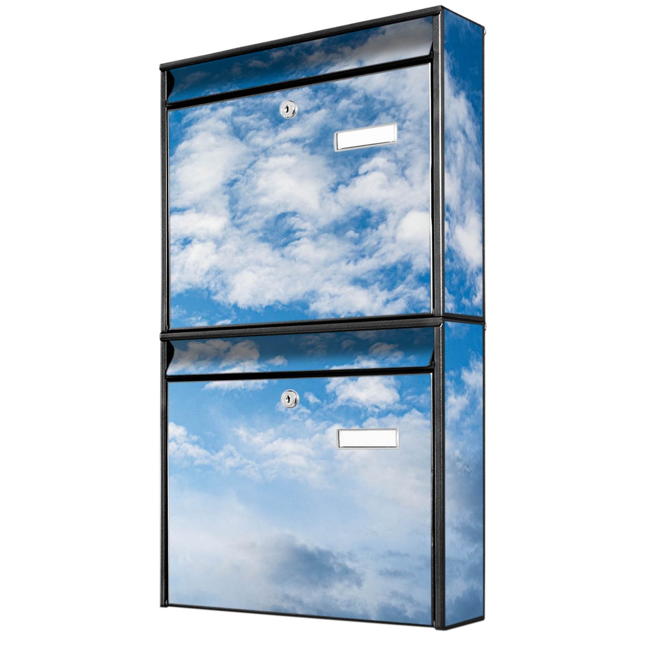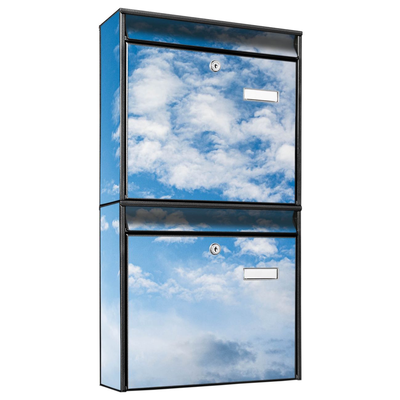 FUNKTION: Die Burg-Wächter Briefkastenanlage mit Motiv Wolken 1 bietet Ihnen ausreichend Fassungsvermögen um auch A4 und C4 Sendungen zu empfangen. Das integrierte Namensschild lässt sich individuell beschriften. Wählen Sie aus den Grundfarben weiß, silber und schwarz. DESIGN: Die 2 Briefkästen haben ein ansprechendes und zeitloses Design, ohne dabei auf Funktionalität zu verzichten. Das Material ist sehr stabil, wetterfest und rostfrei. Durch das Motiv Wolken 1 werden die Postkästen zu einem Blickfang. DETAILS: Die Postkästen bestehen aus verzinktem Stahl der zusätzlich mit Klarlack versiegelt wurde. Die Kästen sind gesamt 64,5cm hoch, 36,2cm breit und 10cm tief. Das Motiv besteht aus einer wetter- und UV-festen Folie, die Ihren Briefkasten zusätzlich vor Kratzern schützt. Die Postkästen werden mit Montagematerial, je einem Namensschild und je zwei Schlüsseln geliefert. NUTZEN: Das Briefkastenset eignet sich für die Wandmontage, die Größe bietet genügend Platz für Sendungen aller Art. Das zeitlose Design sowie die stabile Bauart bieten Ihnen einen treuen Begleiter für Ihre Post. BANJADO: