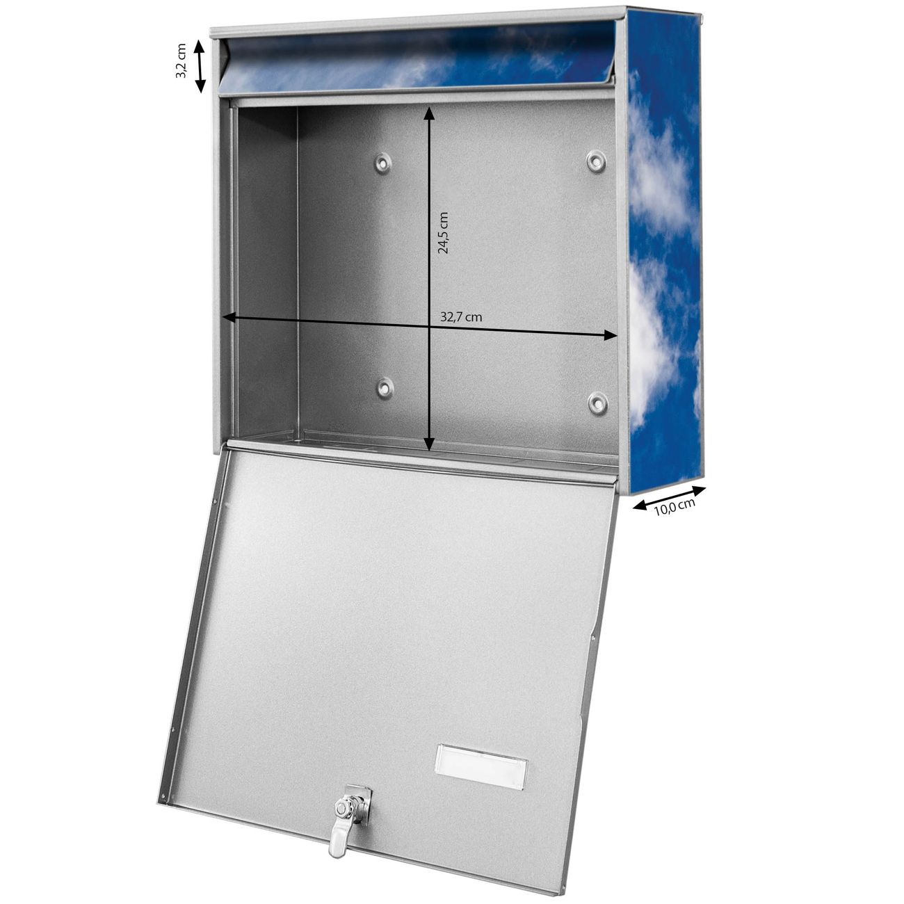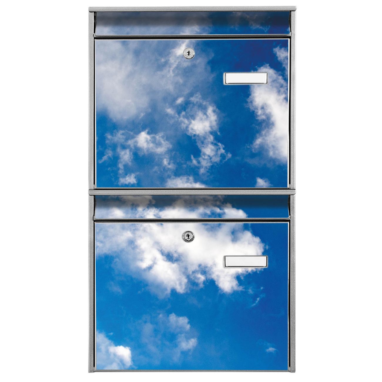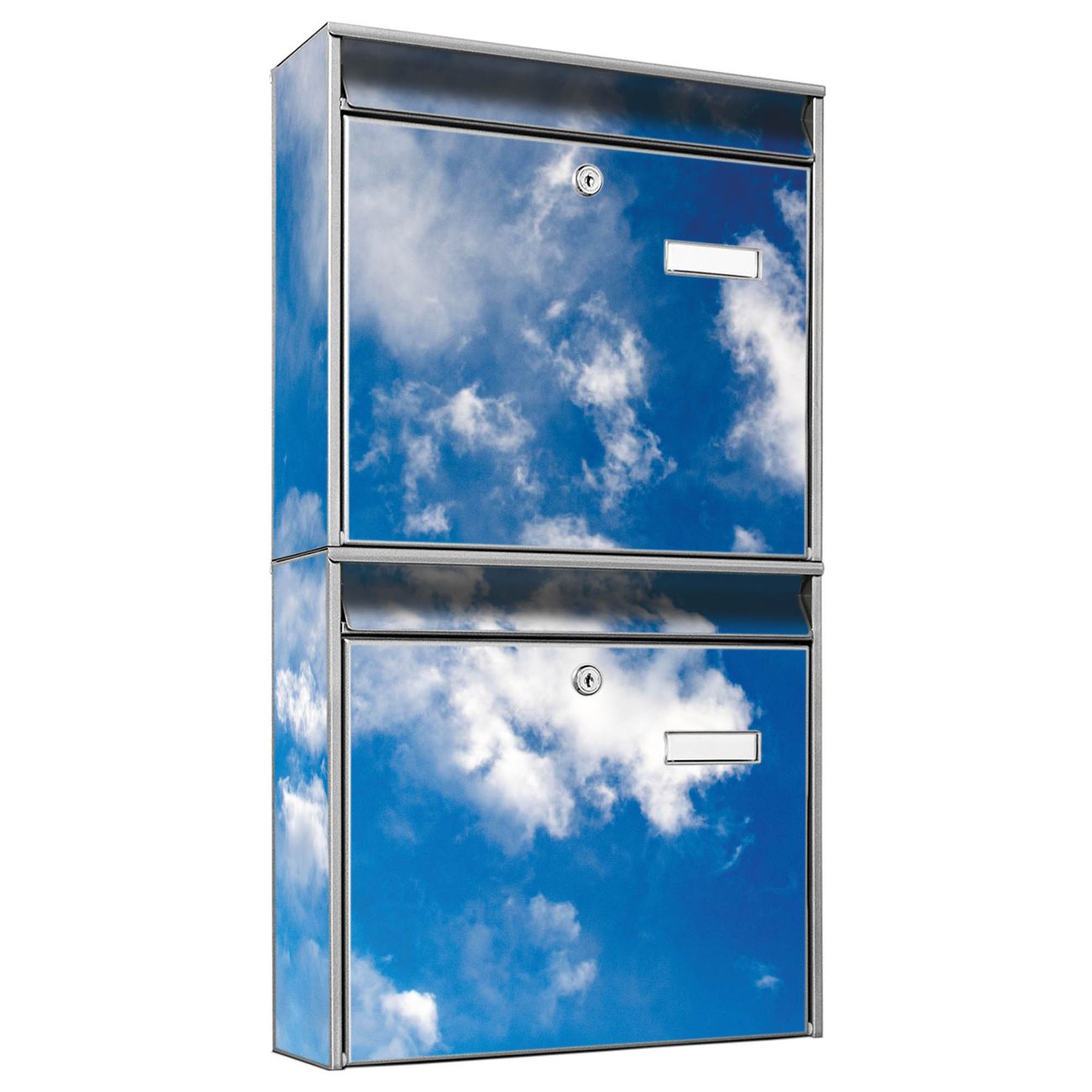 FUNKTION: Die Burg-Wächter Briefkastenanlage mit Motiv Wolken 2 bietet Ihnen ausreichend Fassungsvermögen um auch A4 und C4 Sendungen zu empfangen. Das integrierte Namensschild lässt sich individuell beschriften. Wählen Sie aus den Grundfarben weiß, silber und schwarz. DESIGN: Die 2 Briefkästen haben ein ansprechendes und zeitloses Design, ohne dabei auf Funktionalität zu verzichten. Das Material ist sehr stabil, wetterfest und rostfrei. Durch das Motiv Wolken 2 werden die Postkästen zu einem Blickfang. DETAILS: Die Postkästen bestehen aus verzinktem Stahl der zusätzlich mit Klarlack versiegelt wurde. Die Kästen sind gesamt 64,5cm hoch, 36,2cm breit und 10cm tief. Das Motiv besteht aus einer wetter- und UV-festen Folie, die Ihren Briefkasten zusätzlich vor Kratzern schützt. Die Postkästen werden mit Montagematerial, je einem Namensschild und je zwei Schlüsseln geliefert. NUTZEN: Das Briefkastenset eignet sich für die Wandmontage, die Größe bietet genügend Platz für Sendungen aller Art. Das zeitlose Design sowie die stabile Bauart bieten Ihnen einen treuen Begleiter für Ihre Post. BANJADO: