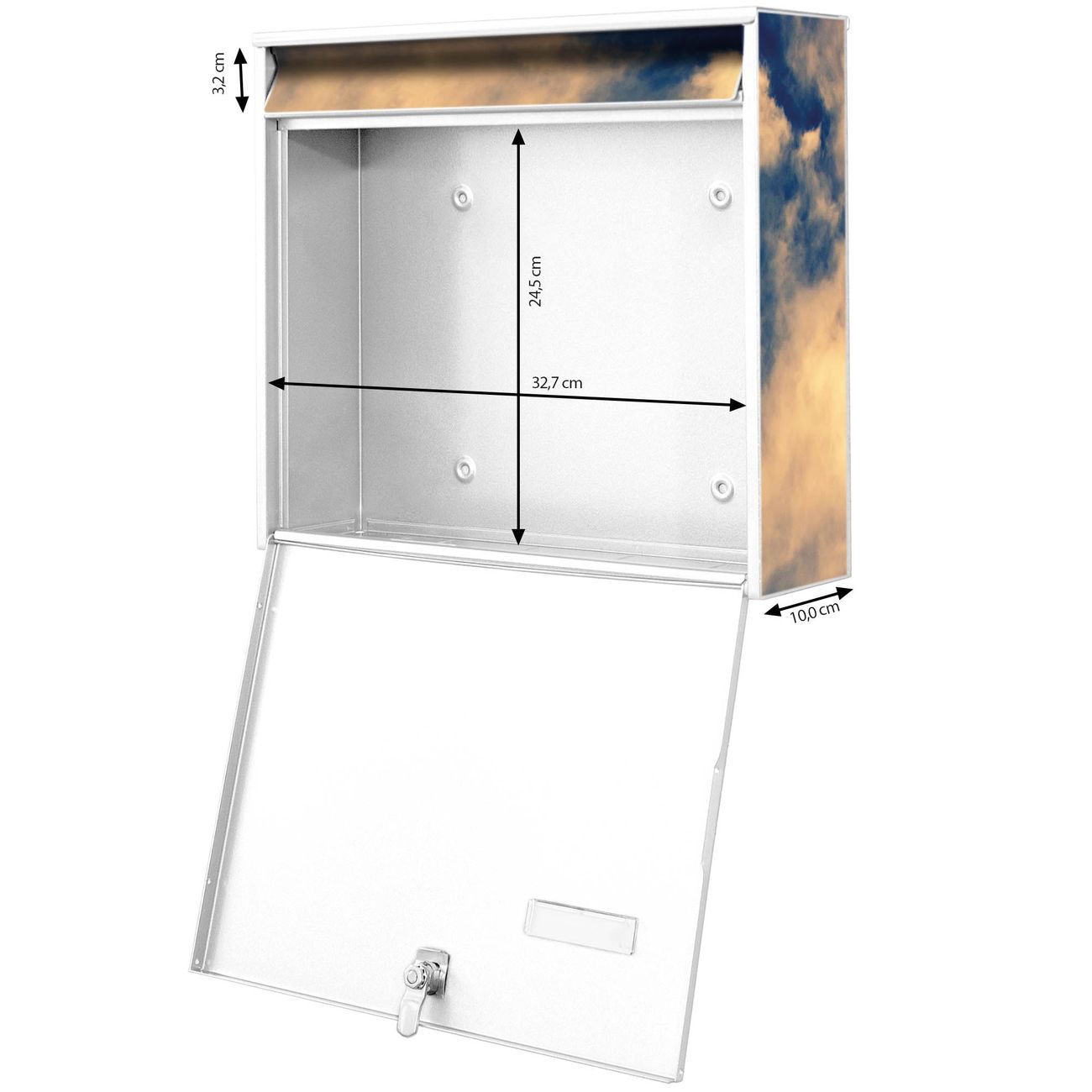 FUNKTION: Die Burg-Wächter Briefkastenanlage mit Motiv Wolken 3 bietet Ihnen ausreichend Fassungsvermögen um auch A4 und C4 Sendungen zu empfangen. Das integrierte Namensschild lässt sich individuell beschriften. Wählen Sie aus den Grundfarben weiß, silber und schwarz. DESIGN: Die 2 Briefkästen haben ein ansprechendes und zeitloses Design, ohne dabei auf Funktionalität zu verzichten. Das Material ist sehr stabil, wetterfest und rostfrei. Durch das Motiv Wolken 3 werden die Postkästen zu einem Blickfang. DETAILS: Die Postkästen bestehen aus verzinktem Stahl der zusätzlich mit Klarlack versiegelt wurde. Die Kästen sind gesamt 64,5cm hoch, 36,2cm breit und 10cm tief. Das Motiv besteht aus einer wetter- und UV-festen Folie, die Ihren Briefkasten zusätzlich vor Kratzern schützt. Die Postkästen werden mit Montagematerial, je einem Namensschild und je zwei Schlüsseln geliefert. NUTZEN: Das Briefkastenset eignet sich für die Wandmontage, die Größe bietet genügend Platz für Sendungen aller Art. Das zeitlose Design sowie die stabile Bauart bieten Ihnen einen treuen Begleiter für Ihre Post. BANJADO: