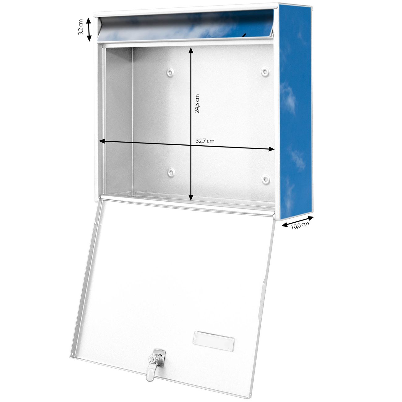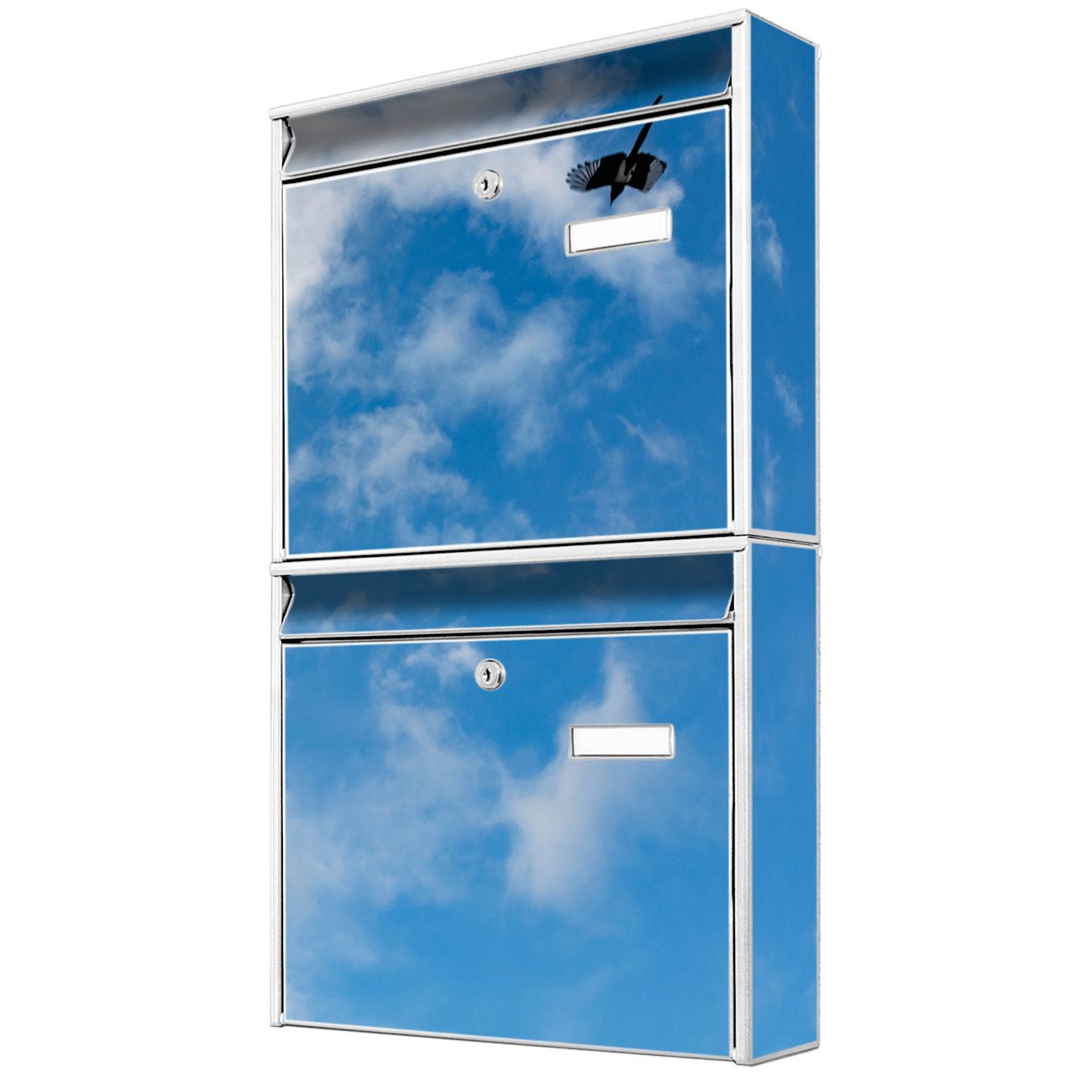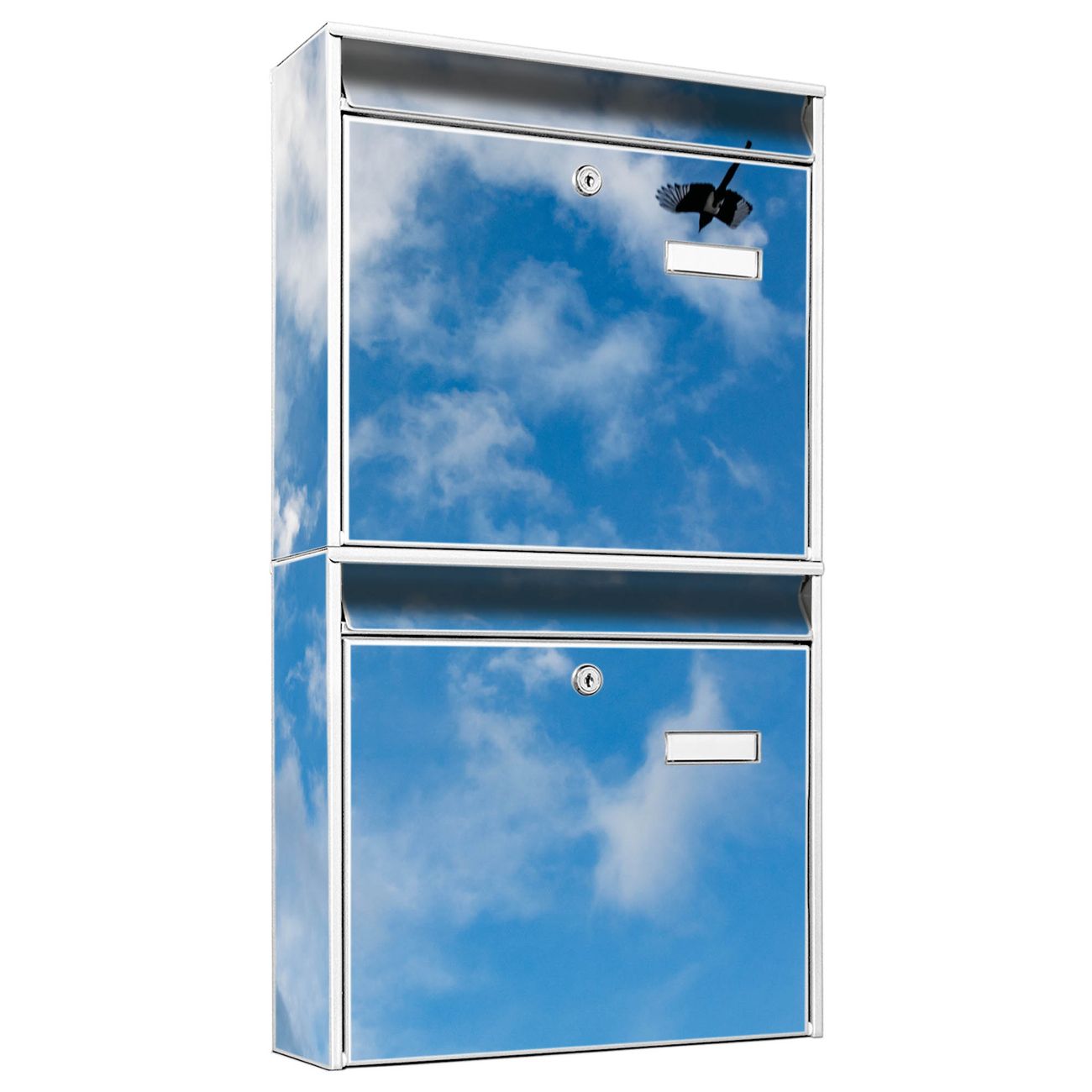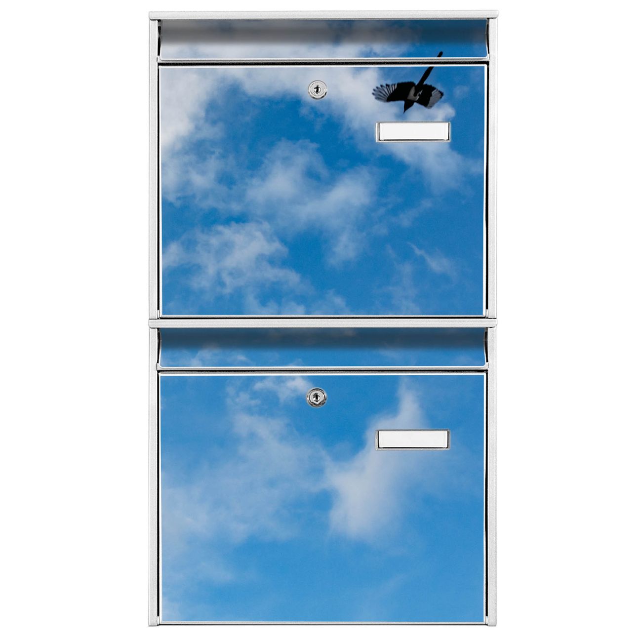 FUNKTION: Die Burg-Wächter Briefkastenanlage mit Motiv Wolken 4 bietet Ihnen ausreichend Fassungsvermögen um auch A4 und C4 Sendungen zu empfangen. Das integrierte Namensschild lässt sich individuell beschriften. Wählen Sie aus den Grundfarben weiß, silber und schwarz. DESIGN: Die 2 Briefkästen haben ein ansprechendes und zeitloses Design, ohne dabei auf Funktionalität zu verzichten. Das Material ist sehr stabil, wetterfest und rostfrei. Durch das Motiv Wolken 4 werden die Postkästen zu einem Blickfang. DETAILS: Die Postkästen bestehen aus verzinktem Stahl der zusätzlich mit Klarlack versiegelt wurde. Die Kästen sind gesamt 64,5cm hoch, 36,2cm breit und 10cm tief. Das Motiv besteht aus einer wetter- und UV-festen Folie, die Ihren Briefkasten zusätzlich vor Kratzern schützt. Die Postkästen werden mit Montagematerial, je einem Namensschild und je zwei Schlüsseln geliefert. NUTZEN: Das Briefkastenset eignet sich für die Wandmontage, die Größe bietet genügend Platz für Sendungen aller Art. Das zeitlose Design sowie die stabile Bauart bieten Ihnen einen treuen Begleiter für Ihre Post. BANJADO: