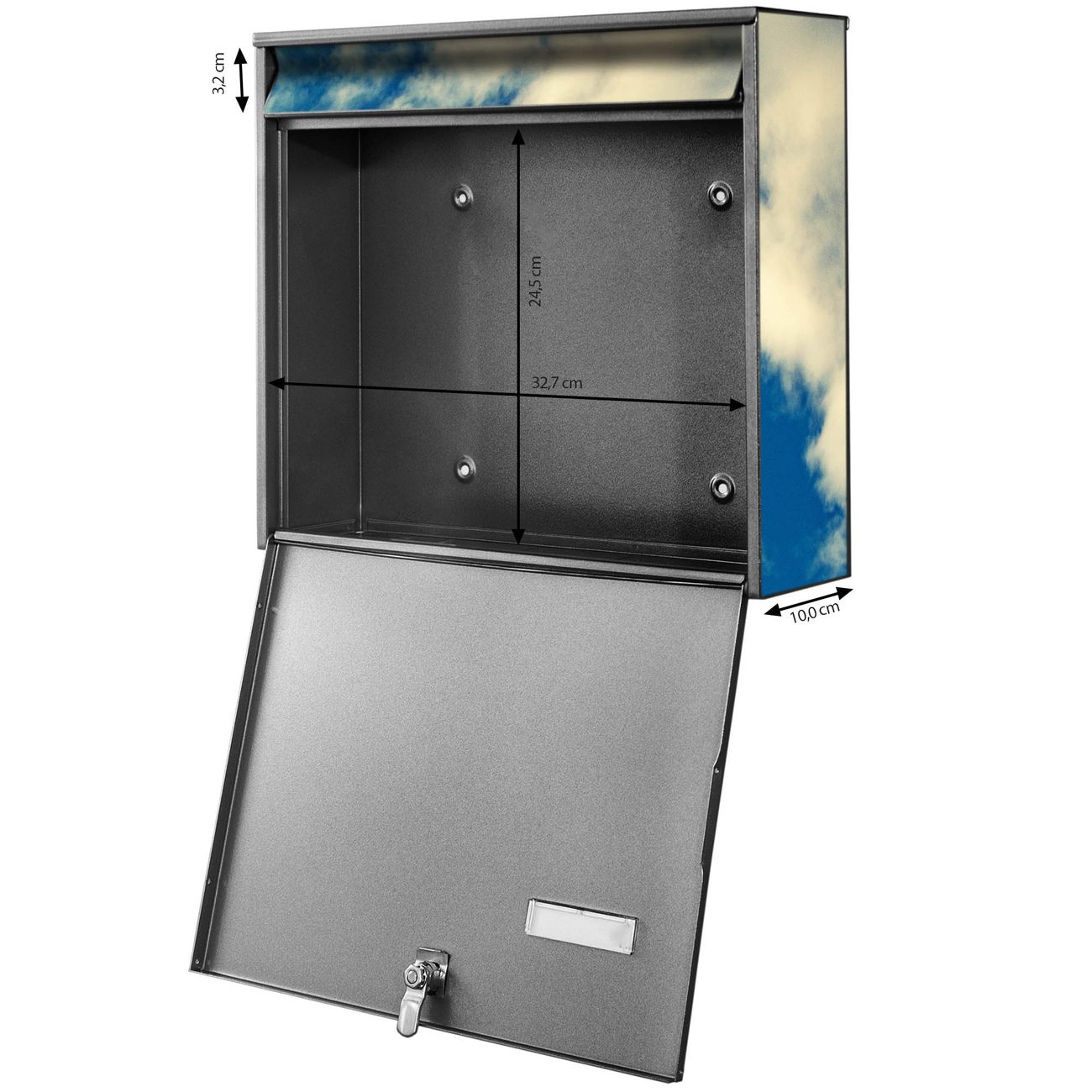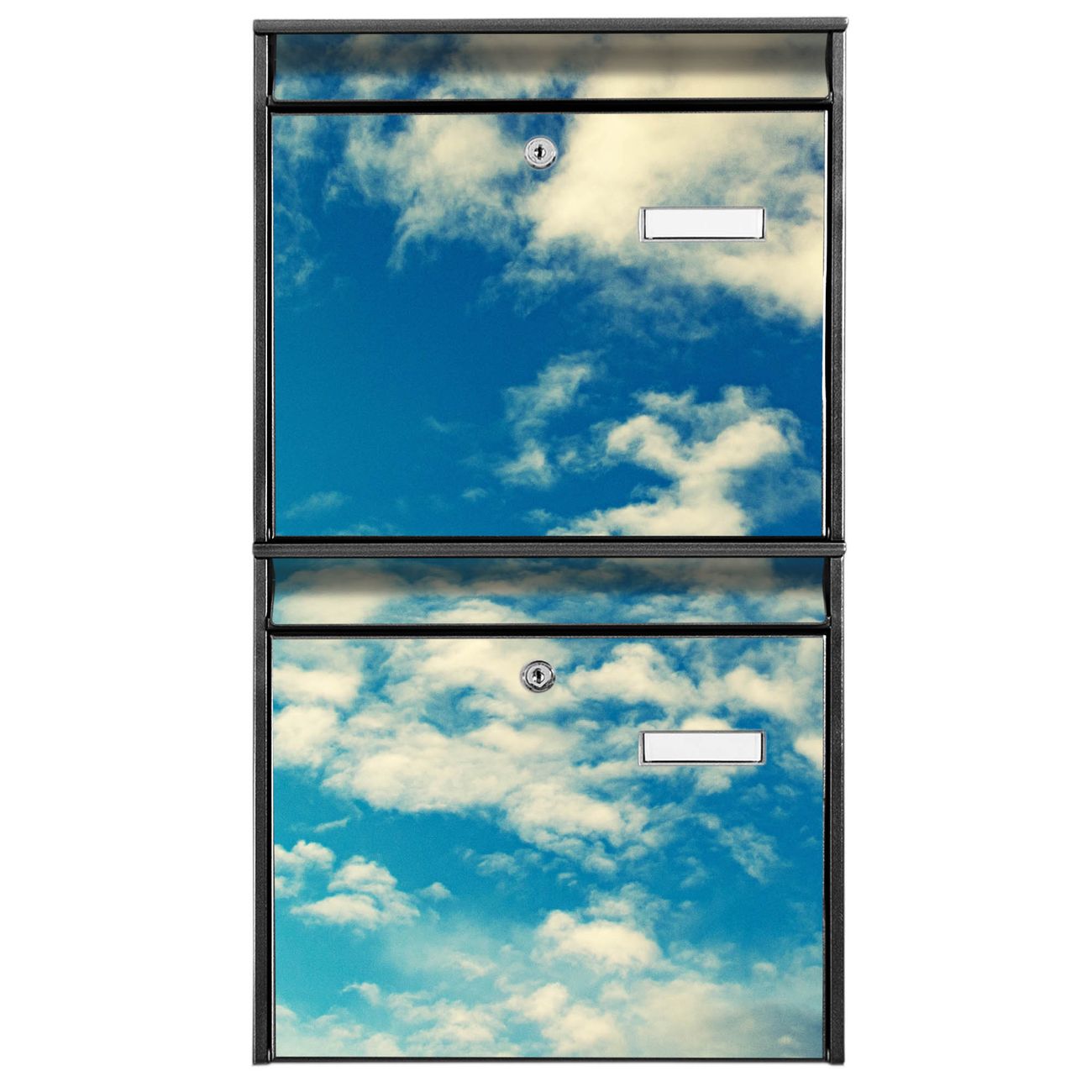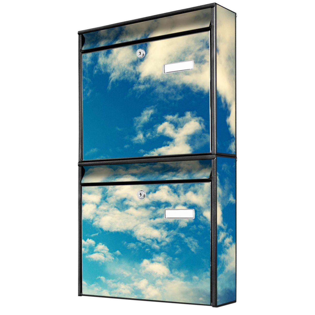 FUNKTION: Die Burg-Wächter Briefkastenanlage mit Motiv Wolken 5 bietet Ihnen ausreichend Fassungsvermögen um auch A4 und C4 Sendungen zu empfangen. Das integrierte Namensschild lässt sich individuell beschriften. Wählen Sie aus den Grundfarben weiß, silber und schwarz. DESIGN: Die 2 Briefkästen haben ein ansprechendes und zeitloses Design, ohne dabei auf Funktionalität zu verzichten. Das Material ist sehr stabil, wetterfest und rostfrei. Durch das Motiv Wolken 5 werden die Postkästen zu einem Blickfang. DETAILS: Die Postkästen bestehen aus verzinktem Stahl der zusätzlich mit Klarlack versiegelt wurde. Die Kästen sind gesamt 64,5cm hoch, 36,2cm breit und 10cm tief. Das Motiv besteht aus einer wetter- und UV-festen Folie, die Ihren Briefkasten zusätzlich vor Kratzern schützt. Die Postkästen werden mit Montagematerial, je einem Namensschild und je zwei Schlüsseln geliefert. NUTZEN: Das Briefkastenset eignet sich für die Wandmontage, die Größe bietet genügend Platz für Sendungen aller Art. Das zeitlose Design sowie die stabile Bauart bieten Ihnen einen treuen Begleiter für Ihre Post. BANJADO: