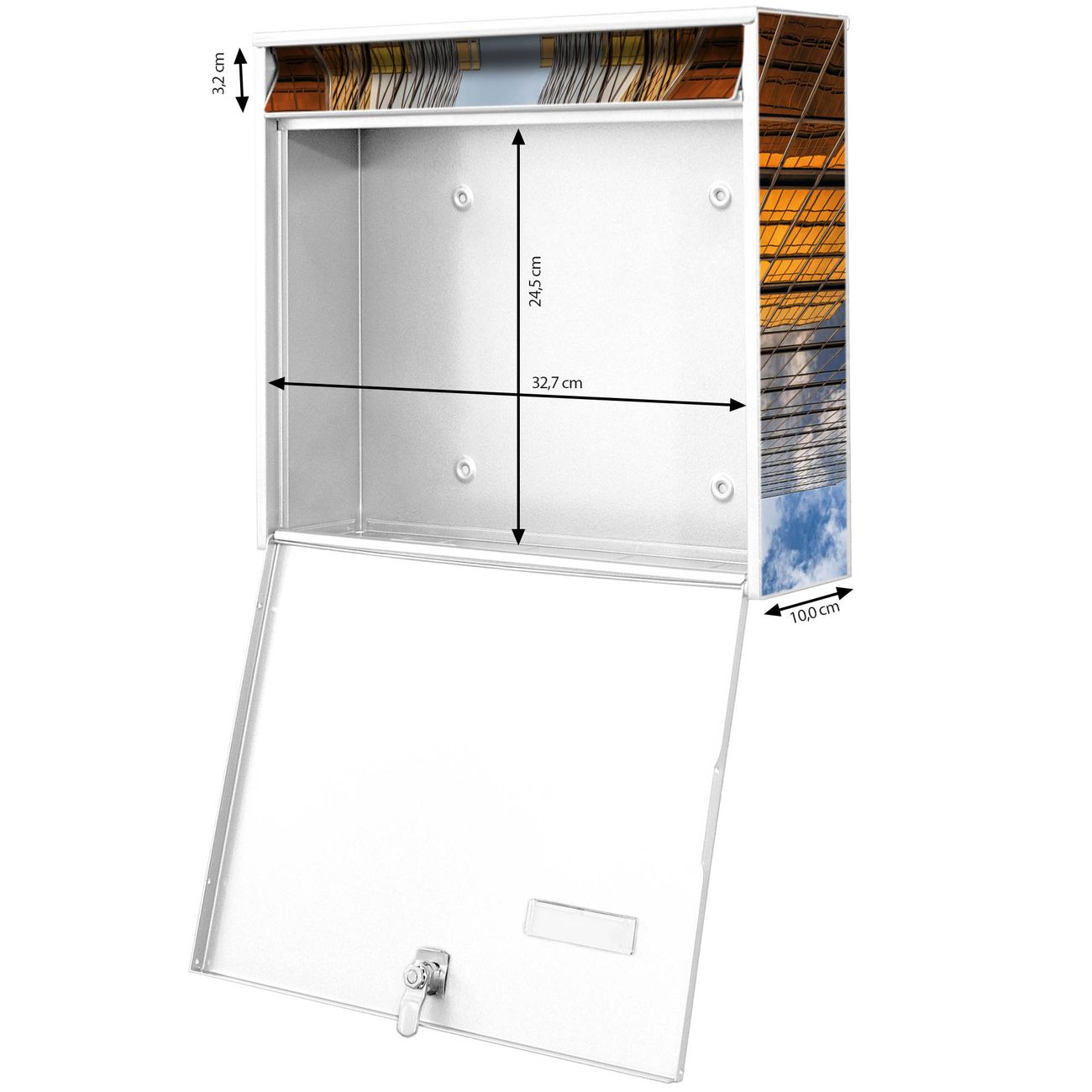FUNKTION: Die Burg-Wächter Briefkastenanlage mit Motiv Wolkenkratzer 2 bietet Ihnen ausreichend Fassungsvermögen um auch A4 und C4 Sendungen zu empfangen. Das integrierte Namensschild lässt sich individuell beschriften. Wählen Sie aus den Grundfarben weiß, silber und schwarz. DESIGN: Die 2 Briefkästen haben ein ansprechendes und zeitloses Design, ohne dabei auf Funktionalität zu verzichten. Das Material ist sehr stabil, wetterfest und rostfrei. Durch das Motiv Wolkenkratzer 2 werden die Postkästen zu einem Blickfang. DETAILS: Die Postkästen bestehen aus verzinktem Stahl der zusätzlich mit Klarlack versiegelt wurde. Die Kästen sind gesamt 64,5cm hoch, 36,2cm breit und 10cm tief. Das Motiv besteht aus einer wetter- und UV-festen Folie, die Ihren Briefkasten zusätzlich vor Kratzern schützt. Die Postkästen werden mit Montagematerial, je einem Namensschild und je zwei Schlüsseln geliefert. NUTZEN: Das Briefkastenset eignet sich für die Wandmontage, die Größe bietet genügend Platz für Sendungen aller Art. Das zeitlose Design sowie die stabile Bauart bieten Ihnen einen treuen Begleiter für Ihre Post. BANJADO: