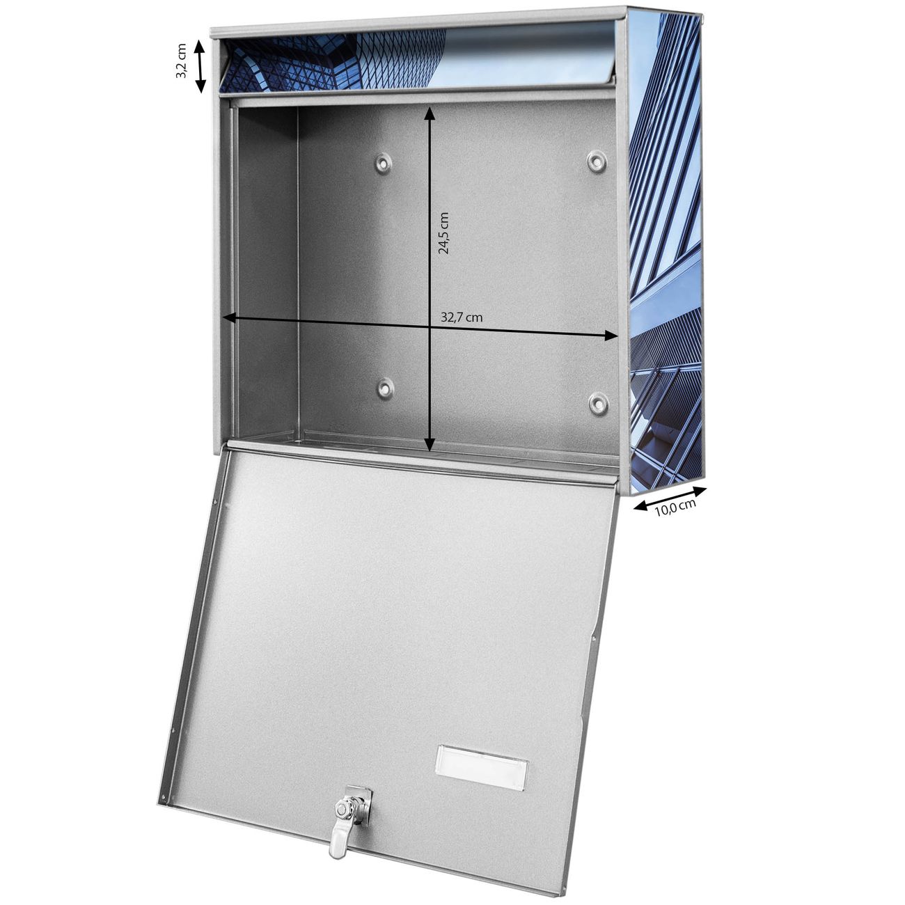 FUNKTION: Die Burg-Wächter Briefkastenanlage mit Motiv Wolkenkratzer bietet Ihnen ausreichend Fassungsvermögen um auch A4 und C4 Sendungen zu empfangen. Das integrierte Namensschild lässt sich individuell beschriften. Wählen Sie aus den Grundfarben weiß, silber und schwarz. DESIGN: Die 2 Briefkästen haben ein ansprechendes und zeitloses Design, ohne dabei auf Funktionalität zu verzichten. Das Material ist sehr stabil, wetterfest und rostfrei. Durch das Motiv Wolkenkratzer werden die Postkästen zu einem Blickfang. DETAILS: Die Postkästen bestehen aus verzinktem Stahl der zusätzlich mit Klarlack versiegelt wurde. Die Kästen sind gesamt 64,5cm hoch, 36,2cm breit und 10cm tief. Das Motiv besteht aus einer wetter- und UV-festen Folie, die Ihren Briefkasten zusätzlich vor Kratzern schützt. Die Postkästen werden mit Montagematerial, je einem Namensschild und je zwei Schlüsseln geliefert. NUTZEN: Das Briefkastenset eignet sich für die Wandmontage, die Größe bietet genügend Platz für Sendungen aller Art. Das zeitlose Design sowie die stabile Bauart bieten Ihnen einen treuen Begleiter für Ihre Post. BANJADO:
