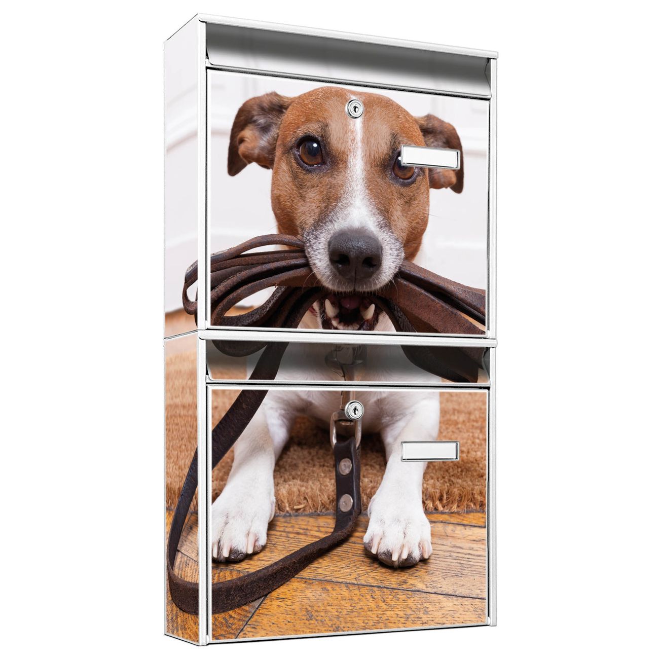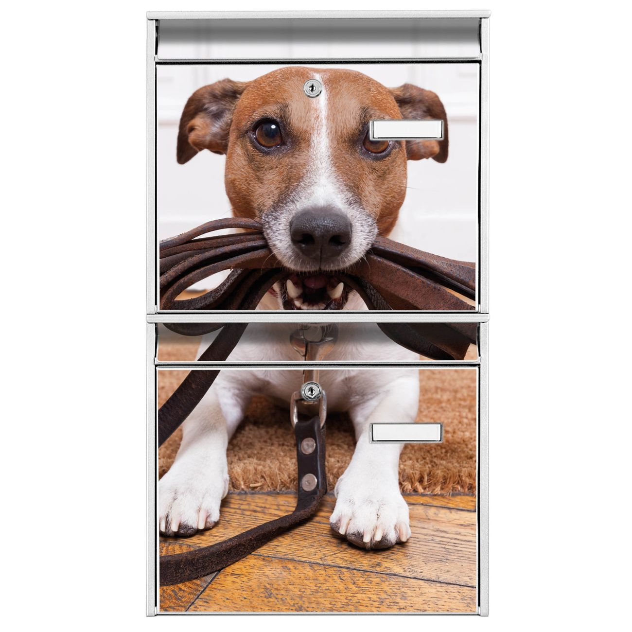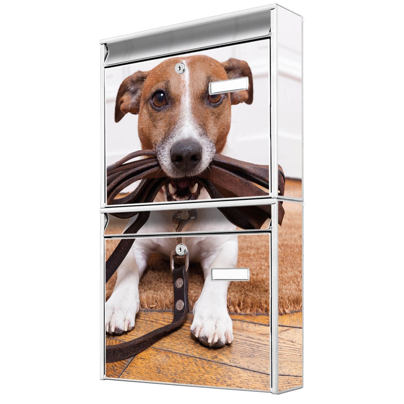 FUNKTION: Die Burg-Wächter Briefkastenanlage mit Motiv Wowka bietet Ihnen ausreichend Fassungsvermögen um auch A4 und C4 Sendungen zu empfangen. Das integrierte Namensschild lässt sich individuell beschriften. Wählen Sie aus den Grundfarben weiß, silber und schwarz. DESIGN: Die 2 Briefkästen haben ein ansprechendes und zeitloses Design, ohne dabei auf Funktionalität zu verzichten. Das Material ist sehr stabil, wetterfest und rostfrei. Durch das Motiv Wowka werden die Postkästen zu einem Blickfang. DETAILS: Die Postkästen bestehen aus verzinktem Stahl der zusätzlich mit Klarlack versiegelt wurde. Die Kästen sind gesamt 64,5cm hoch, 36,2cm breit und 10cm tief. Das Motiv besteht aus einer wetter- und UV-festen Folie, die Ihren Briefkasten zusätzlich vor Kratzern schützt. Die Postkästen werden mit Montagematerial, je einem Namensschild und je zwei Schlüsseln geliefert. NUTZEN: Das Briefkastenset eignet sich für die Wandmontage, die Größe bietet genügend Platz für Sendungen aller Art. Das zeitlose Design sowie die stabile Bauart bieten Ihnen einen treuen Begleiter für Ihre Post. BANJADO: