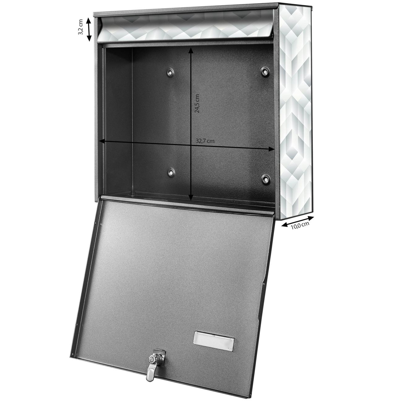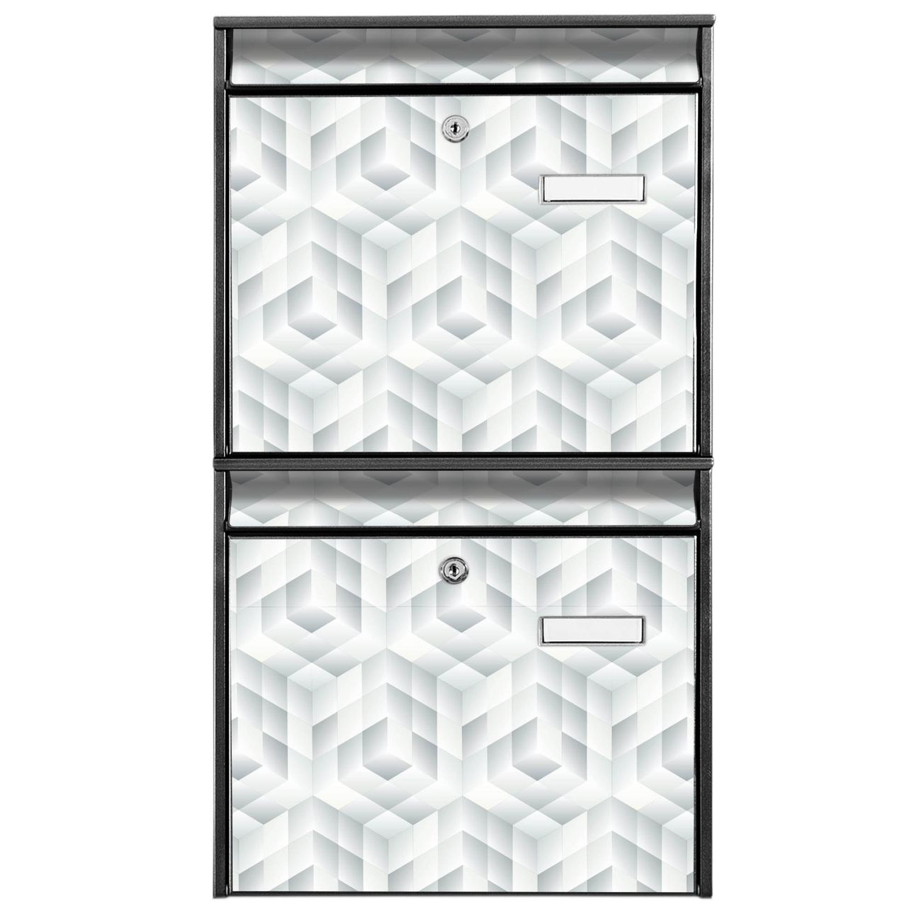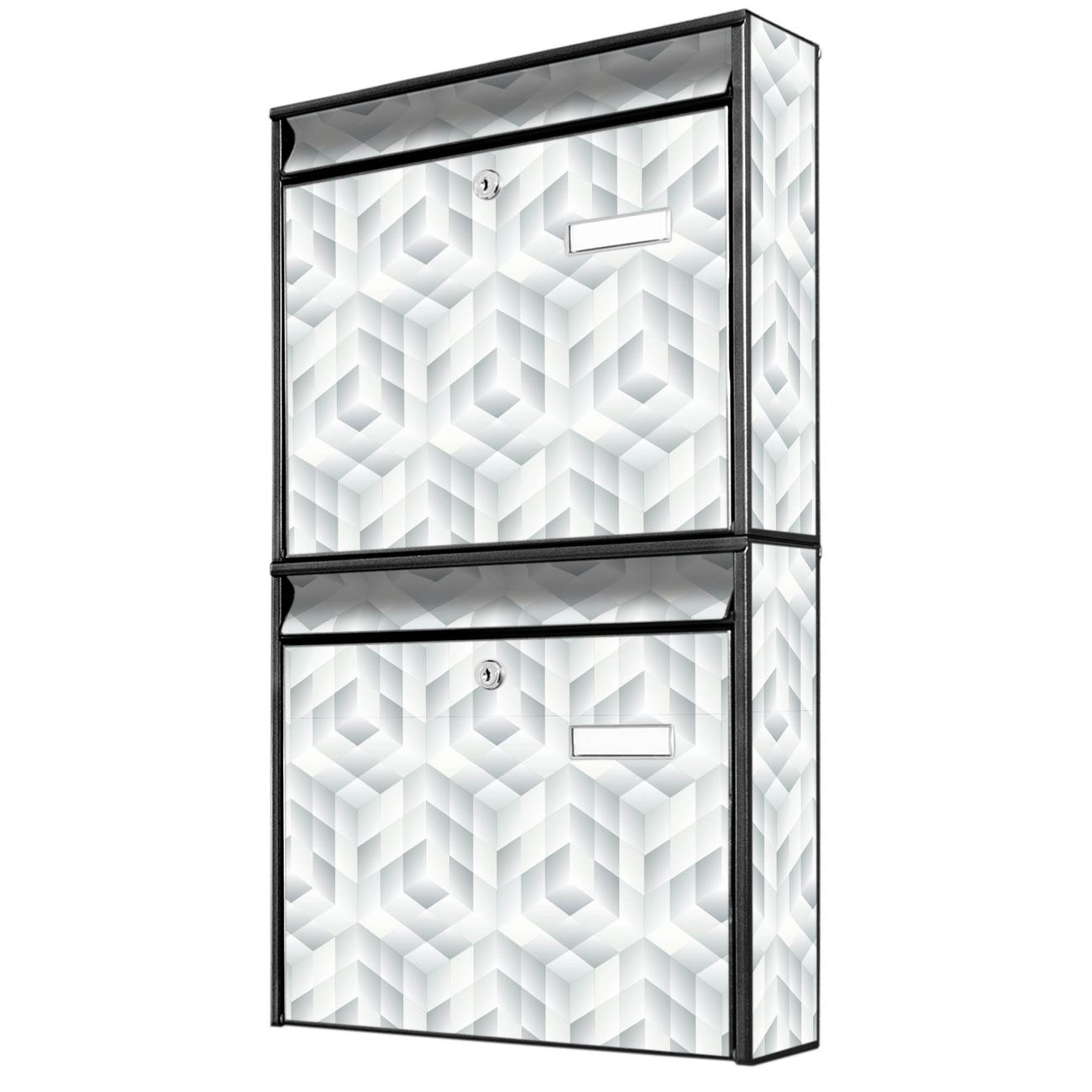 FUNKTION: Die Burg-Wächter Briefkastenanlage mit Motiv Würfel Grau bietet Ihnen ausreichend Fassungsvermögen um auch A4 und C4 Sendungen zu empfangen. Das integrierte Namensschild lässt sich individuell beschriften. Wählen Sie aus den Grundfarben weiß, silber und schwarz. DESIGN: Die 2 Briefkästen haben ein ansprechendes und zeitloses Design, ohne dabei auf Funktionalität zu verzichten. Das Material ist sehr stabil, wetterfest und rostfrei. Durch das Motiv Würfel Grau werden die Postkästen zu einem Blickfang. DETAILS: Die Postkästen bestehen aus verzinktem Stahl der zusätzlich mit Klarlack versiegelt wurde. Die Kästen sind gesamt 64,5cm hoch, 36,2cm breit und 10cm tief. Das Motiv besteht aus einer wetter- und UV-festen Folie, die Ihren Briefkasten zusätzlich vor Kratzern schützt. Die Postkästen werden mit Montagematerial, je einem Namensschild und je zwei Schlüsseln geliefert. NUTZEN: Das Briefkastenset eignet sich für die Wandmontage, die Größe bietet genügend Platz für Sendungen aller Art. Das zeitlose Design sowie die stabile Bauart bieten Ihnen einen treuen Begleiter für Ihre Post. BANJADO: