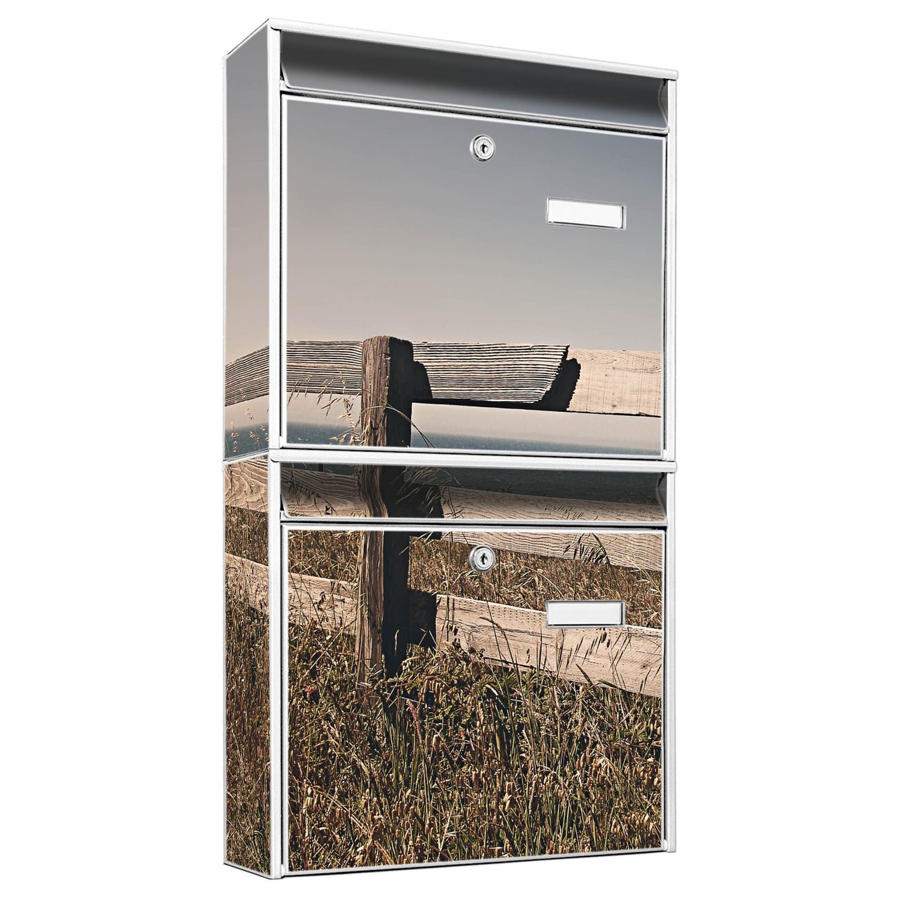 FUNKTION: Die Burg-Wächter Briefkastenanlage mit Motiv Zaun am Meer bietet Ihnen ausreichend Fassungsvermögen um auch A4 und C4 Sendungen zu empfangen. Das integrierte Namensschild lässt sich individuell beschriften. Wählen Sie aus den Grundfarben weiß, silber und schwarz. DESIGN: Die 2 Briefkästen haben ein ansprechendes und zeitloses Design, ohne dabei auf Funktionalität zu verzichten. Das Material ist sehr stabil, wetterfest und rostfrei. Durch das Motiv Zaun am Meer werden die Postkästen zu einem Blickfang. DETAILS: Die Postkästen bestehen aus verzinktem Stahl der zusätzlich mit Klarlack versiegelt wurde. Die Kästen sind gesamt 64,5cm hoch, 36,2cm breit und 10cm tief. Das Motiv besteht aus einer wetter- und UV-festen Folie, die Ihren Briefkasten zusätzlich vor Kratzern schützt. Die Postkästen werden mit Montagematerial, je einem Namensschild und je zwei Schlüsseln geliefert. NUTZEN: Das Briefkastenset eignet sich für die Wandmontage, die Größe bietet genügend Platz für Sendungen aller Art. Das zeitlose Design sowie die stabile Bauart bieten Ihnen einen treuen Begleiter für Ihre Post. BANJADO:
