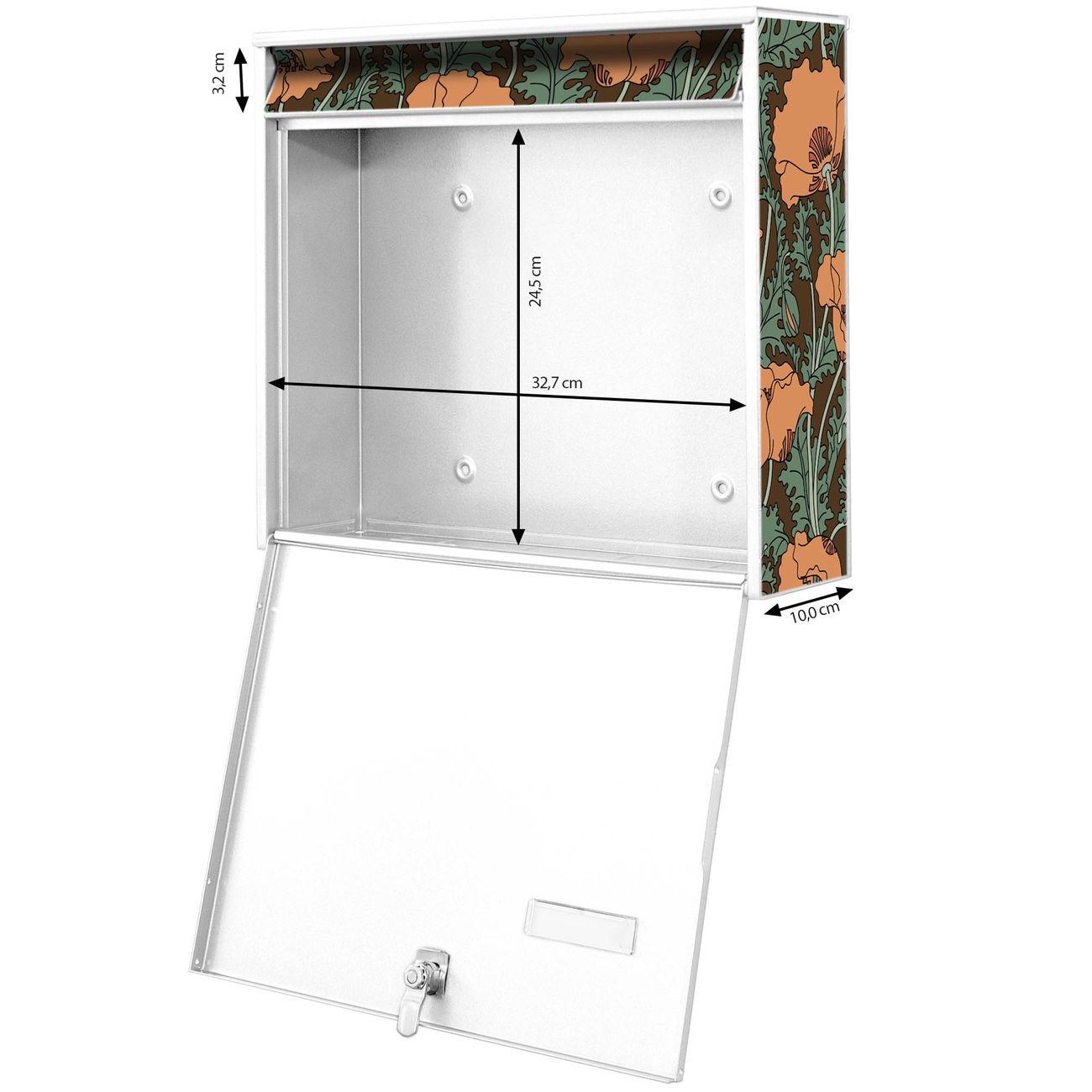 FUNKTION: Die Burg-Wächter Briefkastenanlage mit Motiv Zeichnung Mohn bietet Ihnen ausreichend Fassungsvermögen um auch A4 und C4 Sendungen zu empfangen. Das integrierte Namensschild lässt sich individuell beschriften. Wählen Sie aus den Grundfarben weiß, silber und schwarz. DESIGN: Die 2 Briefkästen haben ein ansprechendes und zeitloses Design, ohne dabei auf Funktionalität zu verzichten. Das Material ist sehr stabil, wetterfest und rostfrei. Durch das Motiv Zeichnung Mohn werden die Postkästen zu einem Blickfang. DETAILS: Die Postkästen bestehen aus verzinktem Stahl der zusätzlich mit Klarlack versiegelt wurde. Die Kästen sind gesamt 64,5cm hoch, 36,2cm breit und 10cm tief. Das Motiv besteht aus einer wetter- und UV-festen Folie, die Ihren Briefkasten zusätzlich vor Kratzern schützt. Die Postkästen werden mit Montagematerial, je einem Namensschild und je zwei Schlüsseln geliefert. NUTZEN: Das Briefkastenset eignet sich für die Wandmontage, die Größe bietet genügend Platz für Sendungen aller Art. Das zeitlose Design sowie die stabile Bauart bieten Ihnen einen treuen Begleiter für Ihre Post. BANJADO:
