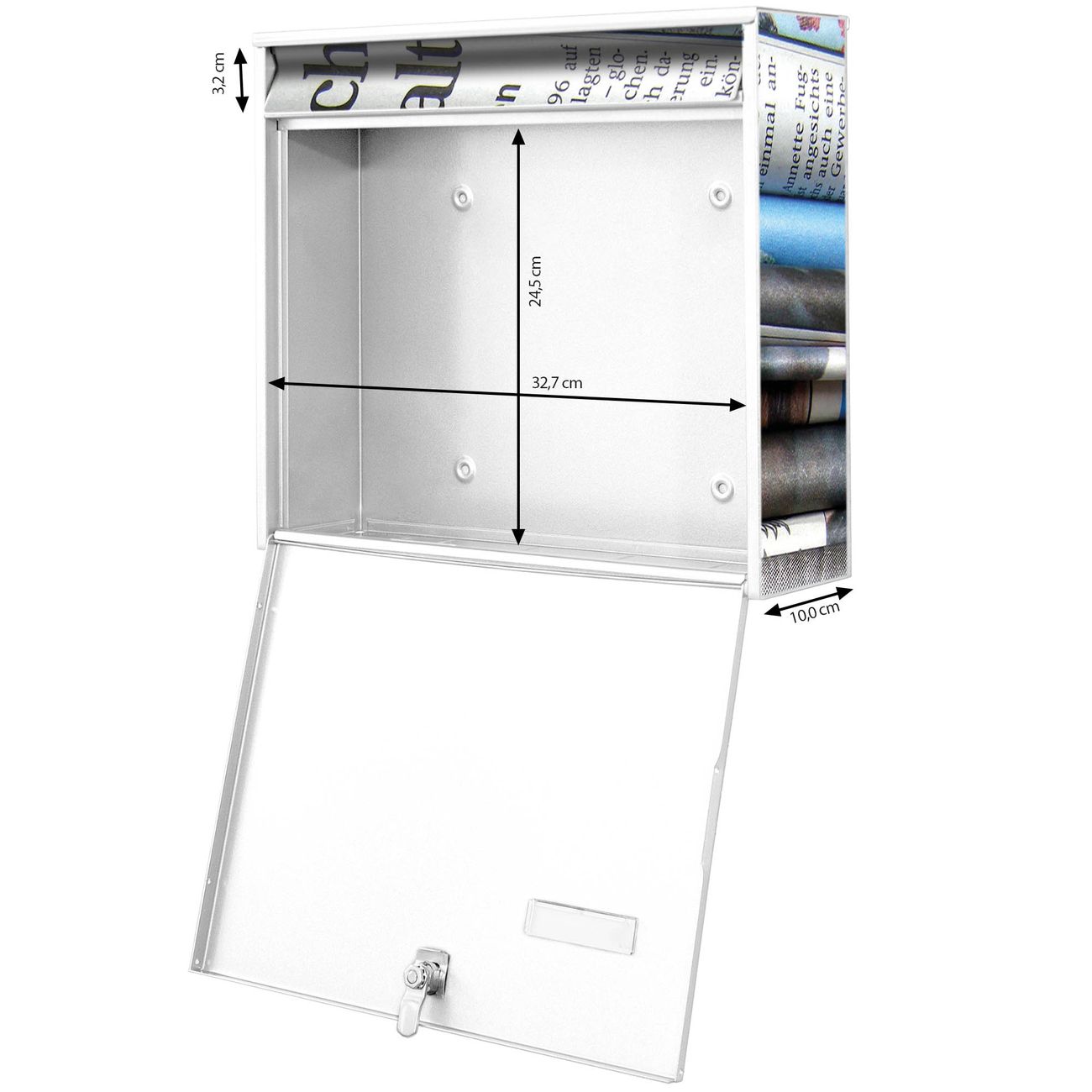 FUNKTION: Die Burg-Wächter Briefkastenanlage mit Motiv Zeitungen bietet Ihnen ausreichend Fassungsvermögen um auch A4 und C4 Sendungen zu empfangen. Das integrierte Namensschild lässt sich individuell beschriften. Wählen Sie aus den Grundfarben weiß, silber und schwarz. DESIGN: Die 2 Briefkästen haben ein ansprechendes und zeitloses Design, ohne dabei auf Funktionalität zu verzichten. Das Material ist sehr stabil, wetterfest und rostfrei. Durch das Motiv Zeitungen werden die Postkästen zu einem Blickfang. DETAILS: Die Postkästen bestehen aus verzinktem Stahl der zusätzlich mit Klarlack versiegelt wurde. Die Kästen sind gesamt 64,5cm hoch, 36,2cm breit und 10cm tief. Das Motiv besteht aus einer wetter- und UV-festen Folie, die Ihren Briefkasten zusätzlich vor Kratzern schützt. Die Postkästen werden mit Montagematerial, je einem Namensschild und je zwei Schlüsseln geliefert. NUTZEN: Das Briefkastenset eignet sich für die Wandmontage, die Größe bietet genügend Platz für Sendungen aller Art. Das zeitlose Design sowie die stabile Bauart bieten Ihnen einen treuen Begleiter für Ihre Post. BANJADO: