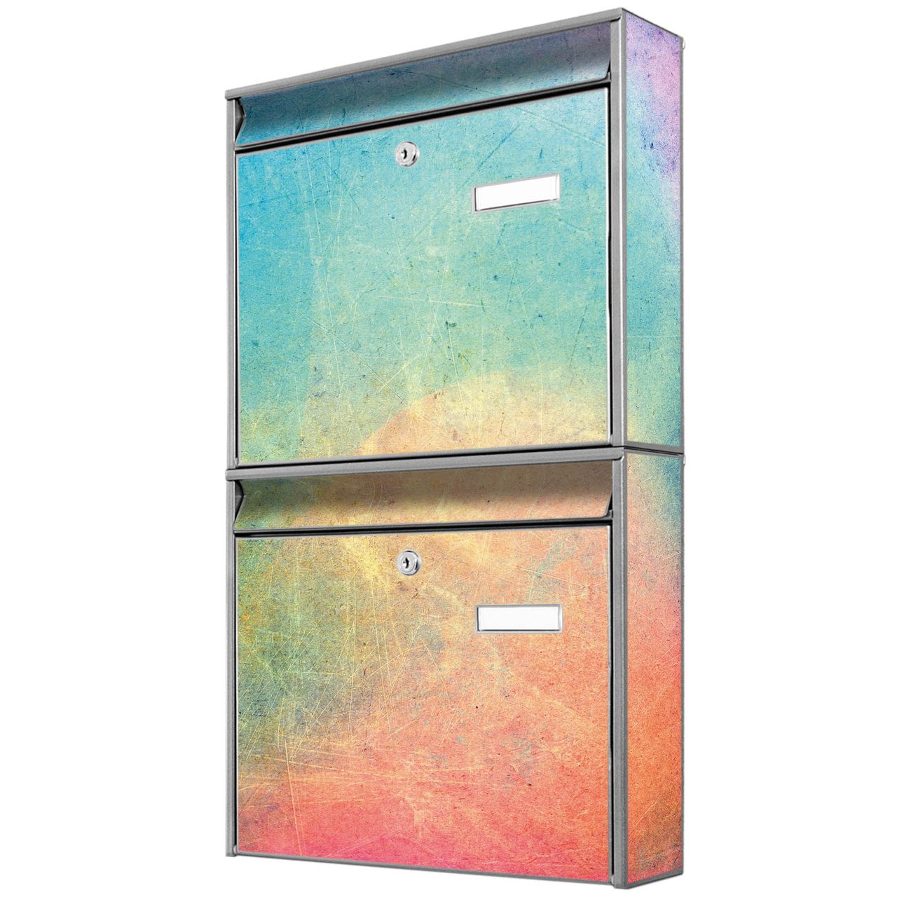 FUNKTION: Die Burg-Wächter Briefkastenanlage mit Motiv Zerkratzt 2 bietet Ihnen ausreichend Fassungsvermögen um auch A4 und C4 Sendungen zu empfangen. Das integrierte Namensschild lässt sich individuell beschriften. Wählen Sie aus den Grundfarben weiß, silber und schwarz. DESIGN: Die 2 Briefkästen haben ein ansprechendes und zeitloses Design, ohne dabei auf Funktionalität zu verzichten. Das Material ist sehr stabil, wetterfest und rostfrei. Durch das Motiv Zerkratzt 2 werden die Postkästen zu einem Blickfang. DETAILS: Die Postkästen bestehen aus verzinktem Stahl der zusätzlich mit Klarlack versiegelt wurde. Die Kästen sind gesamt 64,5cm hoch, 36,2cm breit und 10cm tief. Das Motiv besteht aus einer wetter- und UV-festen Folie, die Ihren Briefkasten zusätzlich vor Kratzern schützt. Die Postkästen werden mit Montagematerial, je einem Namensschild und je zwei Schlüsseln geliefert. NUTZEN: Das Briefkastenset eignet sich für die Wandmontage, die Größe bietet genügend Platz für Sendungen aller Art. Das zeitlose Design sowie die stabile Bauart bieten Ihnen einen treuen Begleiter für Ihre Post. BANJADO:
