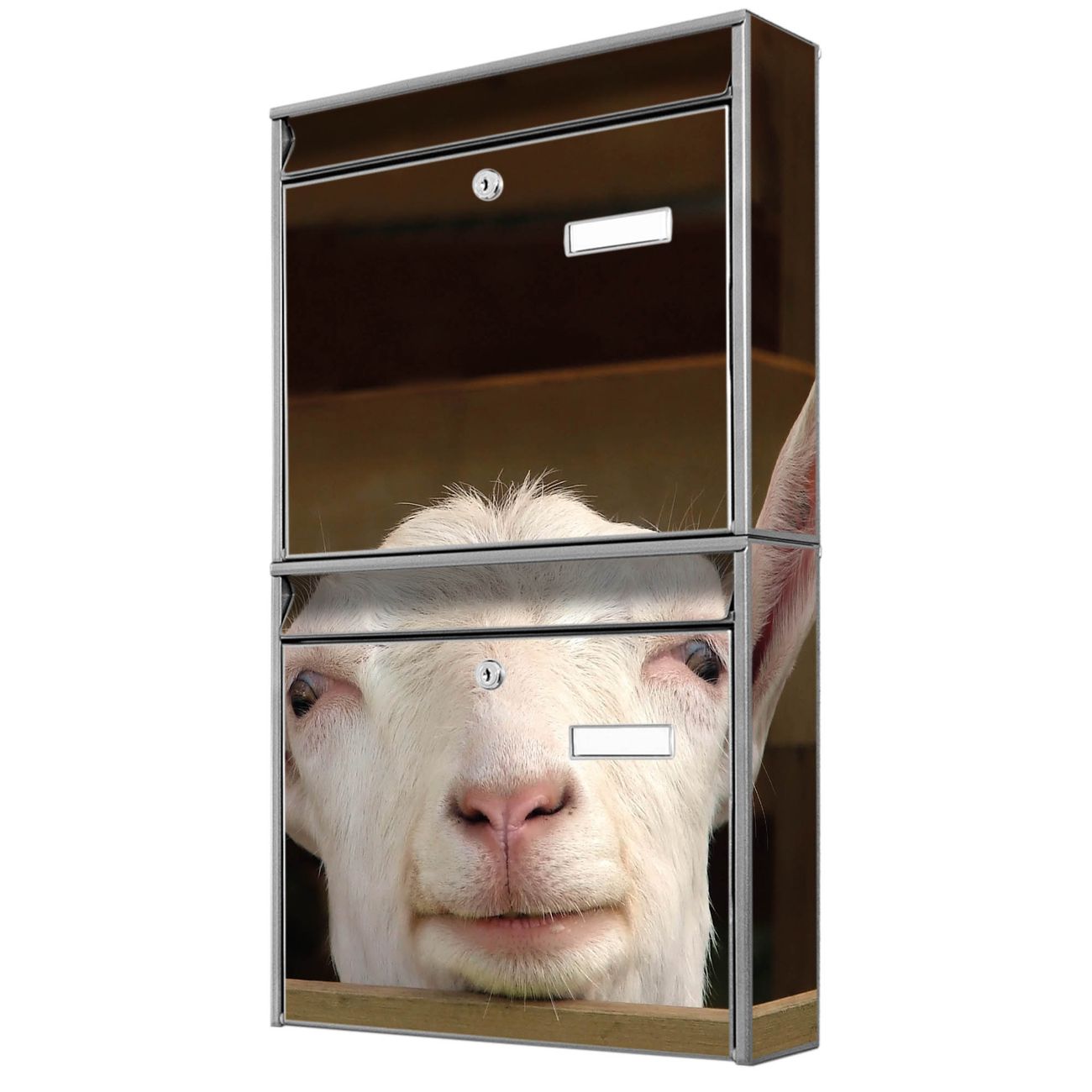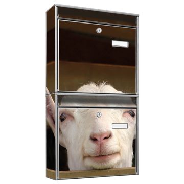 FUNKTION: Die Burg-Wächter Briefkastenanlage mit Motiv Ziege bietet Ihnen ausreichend Fassungsvermögen um auch A4 und C4 Sendungen zu empfangen. Das integrierte Namensschild lässt sich individuell beschriften. Wählen Sie aus den Grundfarben weiß, silber und schwarz. DESIGN: Die 2 Briefkästen haben ein ansprechendes und zeitloses Design, ohne dabei auf Funktionalität zu verzichten. Das Material ist sehr stabil, wetterfest und rostfrei. Durch das Motiv Ziege werden die Postkästen zu einem Blickfang. DETAILS: Die Postkästen bestehen aus verzinktem Stahl der zusätzlich mit Klarlack versiegelt wurde. Die Kästen sind gesamt 64,5cm hoch, 36,2cm breit und 10cm tief. Das Motiv besteht aus einer wetter- und UV-festen Folie, die Ihren Briefkasten zusätzlich vor Kratzern schützt. Die Postkästen werden mit Montagematerial, je einem Namensschild und je zwei Schlüsseln geliefert. NUTZEN: Das Briefkastenset eignet sich für die Wandmontage, die Größe bietet genügend Platz für Sendungen aller Art. Das zeitlose Design sowie die stabile Bauart bieten Ihnen einen treuen Begleiter für Ihre Post. BANJADO: