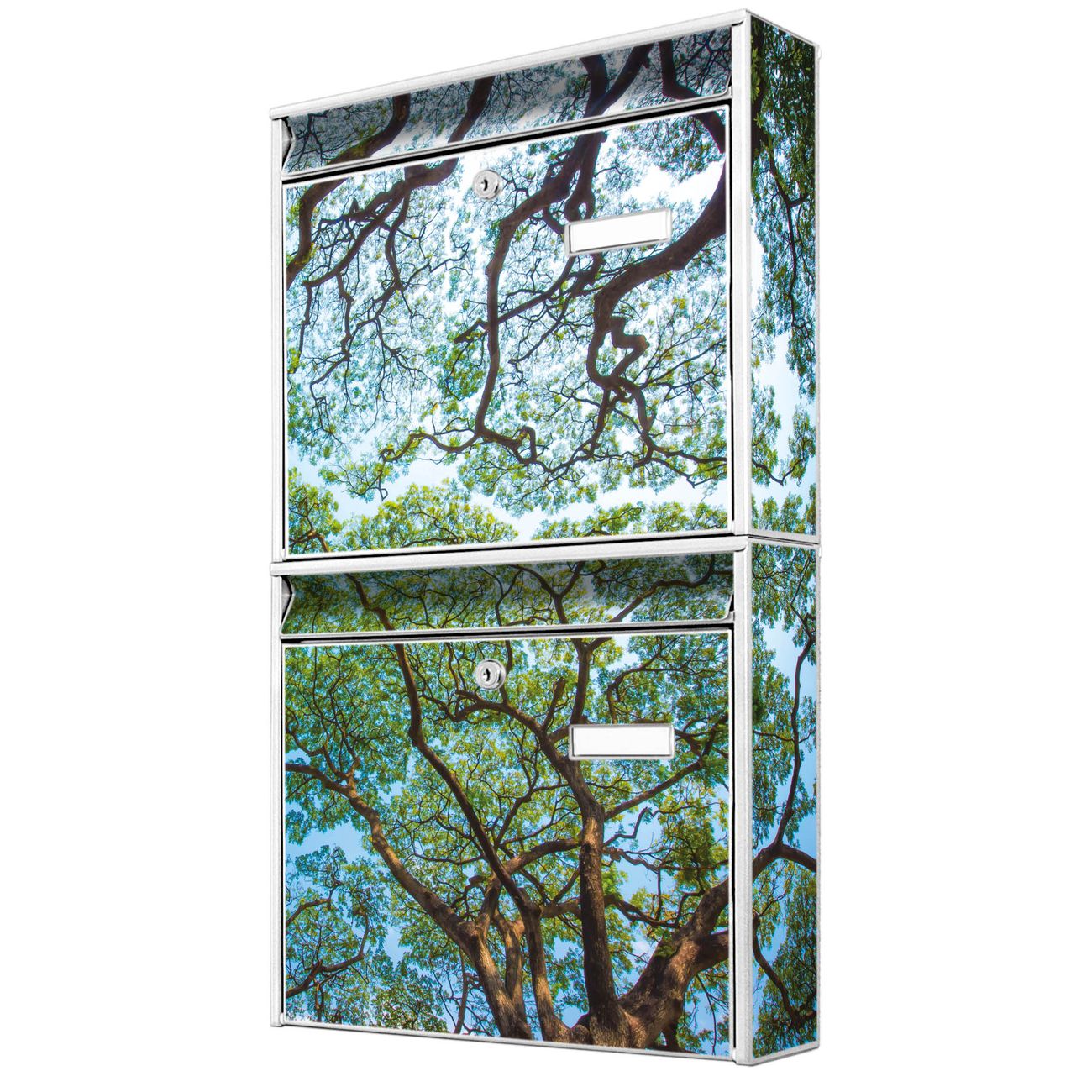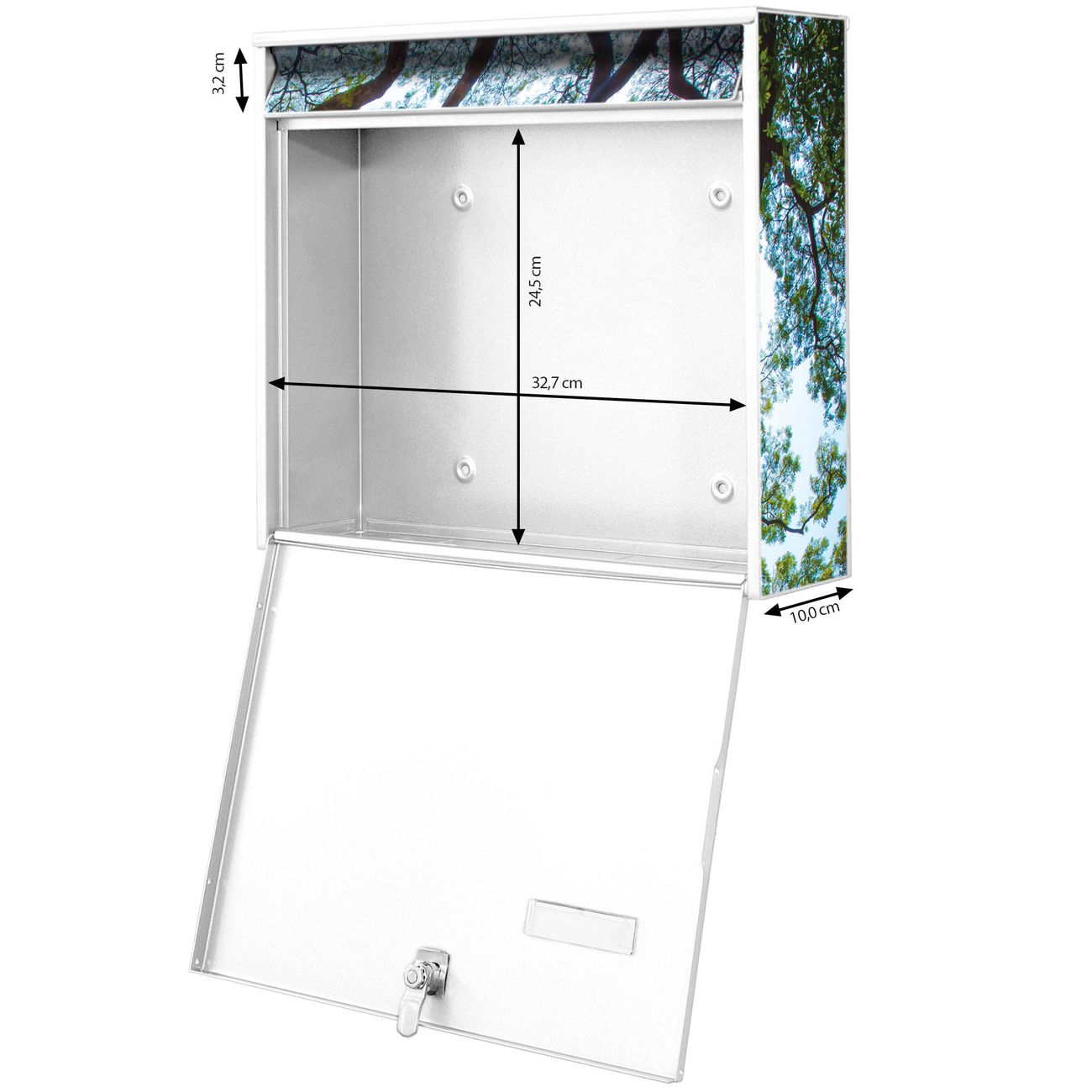 FUNKTION: Die Burg-Wächter Briefkastenanlage mit Motiv Zwischen Bäumen 2 bietet Ihnen ausreichend Fassungsvermögen um auch A4 und C4 Sendungen zu empfangen. Das integrierte Namensschild lässt sich individuell beschriften. Wählen Sie aus den Grundfarben weiß, silber und schwarz. DESIGN: Die 2 Briefkästen haben ein ansprechendes und zeitloses Design, ohne dabei auf Funktionalität zu verzichten. Das Material ist sehr stabil, wetterfest und rostfrei. Durch das Motiv Zwischen Bäumen 2 werden die Postkästen zu einem Blickfang. DETAILS: Die Postkästen bestehen aus verzinktem Stahl der zusätzlich mit Klarlack versiegelt wurde. Die Kästen sind gesamt 64,5cm hoch, 36,2cm breit und 10cm tief. Das Motiv besteht aus einer wetter- und UV-festen Folie, die Ihren Briefkasten zusätzlich vor Kratzern schützt. Die Postkästen werden mit Montagematerial, je einem Namensschild und je zwei Schlüsseln geliefert. NUTZEN: Das Briefkastenset eignet sich für die Wandmontage, die Größe bietet genügend Platz für Sendungen aller Art. Das zeitlose Design sowie die stabile Bauart bieten Ihnen einen treuen Begleiter für Ihre Post. BANJADO: