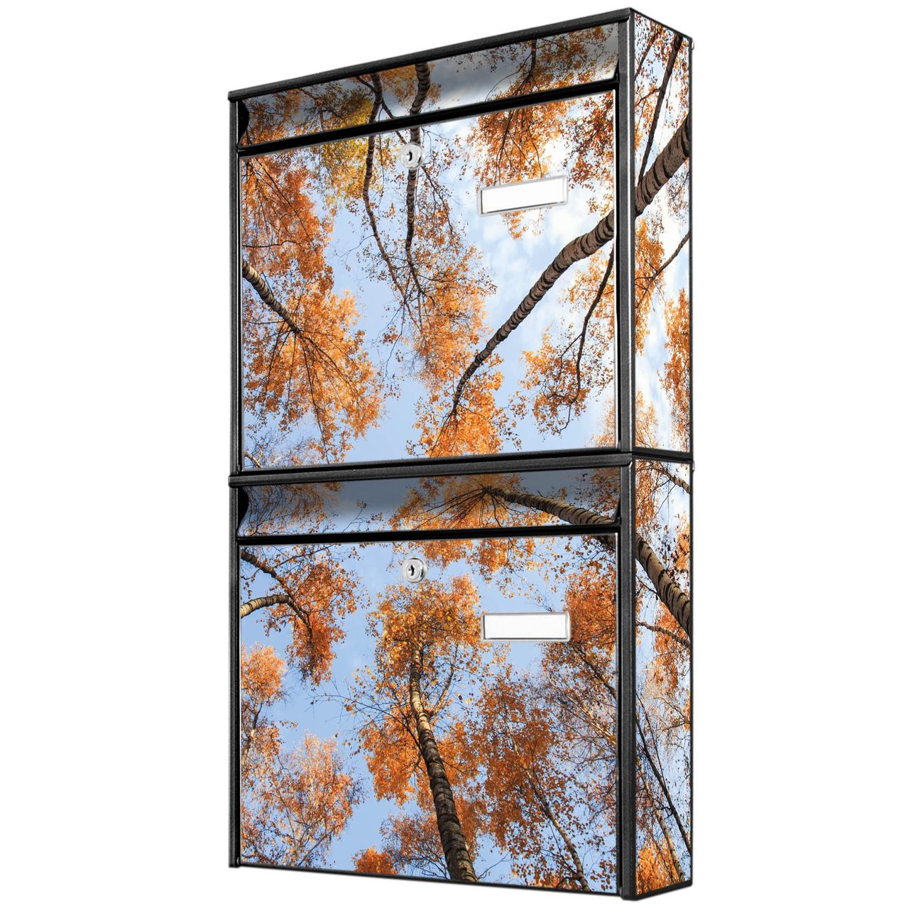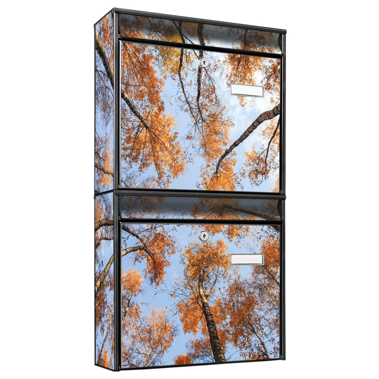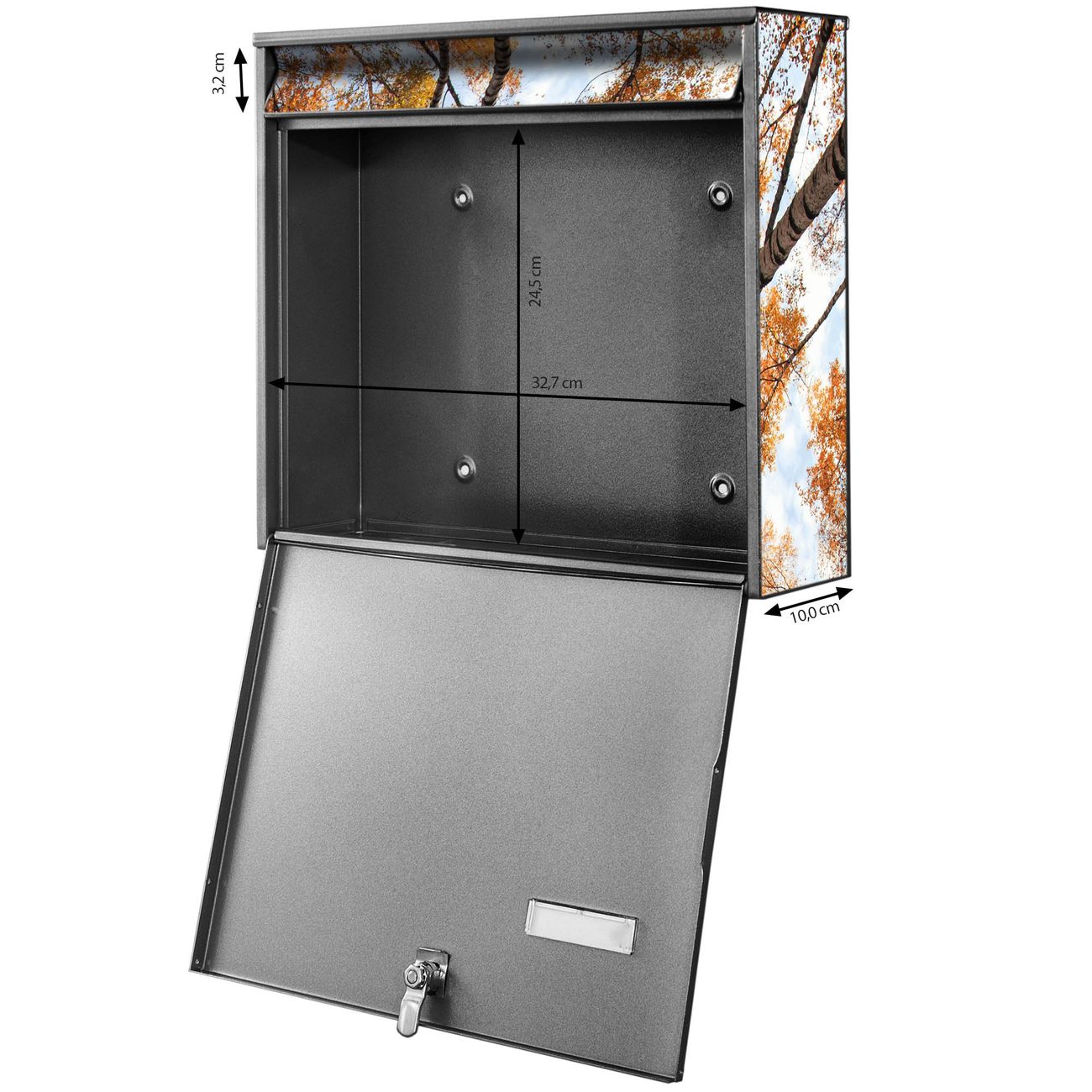 FUNKTION: Die Burg-Wächter Briefkastenanlage mit Motiv Zwischen Bäumen 4 bietet Ihnen ausreichend Fassungsvermögen um auch A4 und C4 Sendungen zu empfangen. Das integrierte Namensschild lässt sich individuell beschriften. Wählen Sie aus den Grundfarben weiß, silber und schwarz. DESIGN: Die 2 Briefkästen haben ein ansprechendes und zeitloses Design, ohne dabei auf Funktionalität zu verzichten. Das Material ist sehr stabil, wetterfest und rostfrei. Durch das Motiv Zwischen Bäumen 4 werden die Postkästen zu einem Blickfang. DETAILS: Die Postkästen bestehen aus verzinktem Stahl der zusätzlich mit Klarlack versiegelt wurde. Die Kästen sind gesamt 64,5cm hoch, 36,2cm breit und 10cm tief. Das Motiv besteht aus einer wetter- und UV-festen Folie, die Ihren Briefkasten zusätzlich vor Kratzern schützt. Die Postkästen werden mit Montagematerial, je einem Namensschild und je zwei Schlüsseln geliefert. NUTZEN: Das Briefkastenset eignet sich für die Wandmontage, die Größe bietet genügend Platz für Sendungen aller Art. Das zeitlose Design sowie die stabile Bauart bieten Ihnen einen treuen Begleiter für Ihre Post. BANJADO: