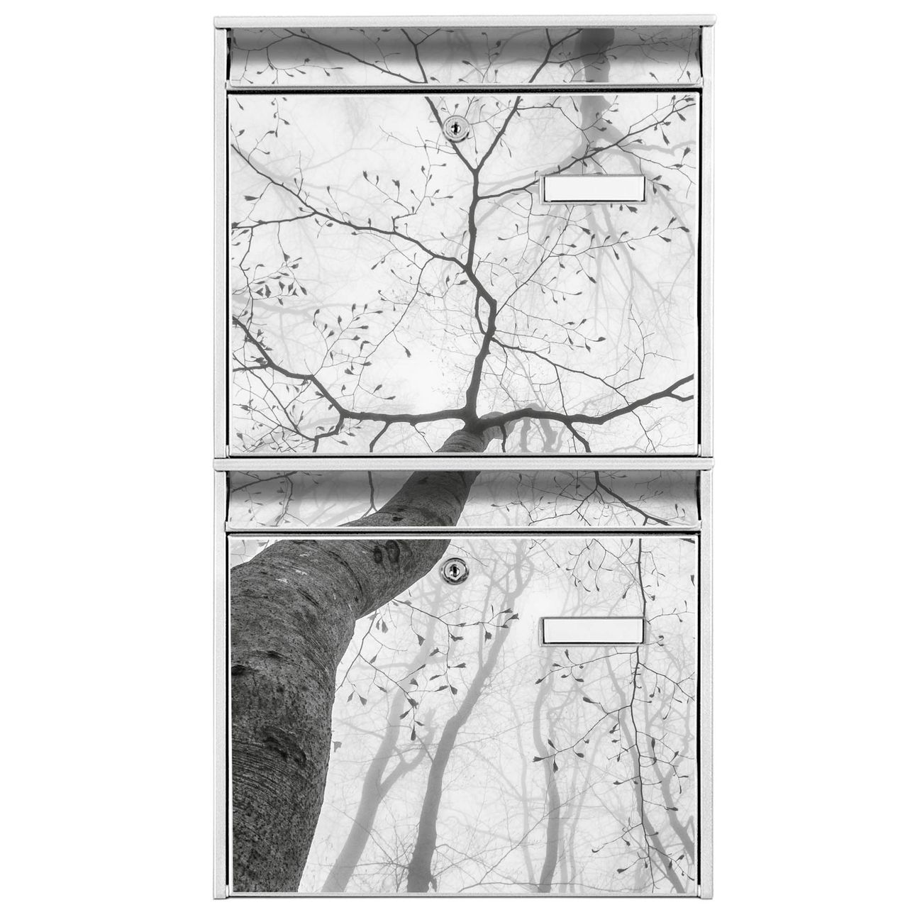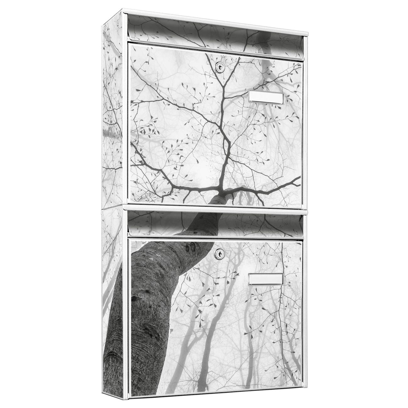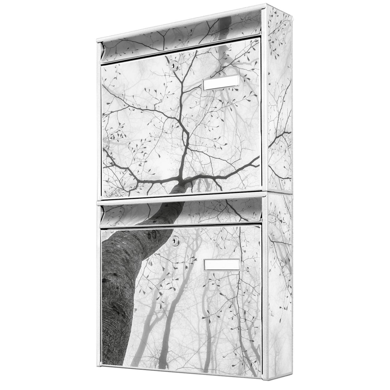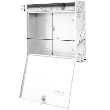 FUNKTION: Die Burg-Wächter Briefkastenanlage mit Motiv Zwischen Bäumen 6 bietet Ihnen ausreichend Fassungsvermögen um auch A4 und C4 Sendungen zu empfangen. Das integrierte Namensschild lässt sich individuell beschriften. Wählen Sie aus den Grundfarben weiß, silber und schwarz. DESIGN: Die 2 Briefkästen haben ein ansprechendes und zeitloses Design, ohne dabei auf Funktionalität zu verzichten. Das Material ist sehr stabil, wetterfest und rostfrei. Durch das Motiv Zwischen Bäumen 6 werden die Postkästen zu einem Blickfang. DETAILS: Die Postkästen bestehen aus verzinktem Stahl der zusätzlich mit Klarlack versiegelt wurde. Die Kästen sind gesamt 64,5cm hoch, 36,2cm breit und 10cm tief. Das Motiv besteht aus einer wetter- und UV-festen Folie, die Ihren Briefkasten zusätzlich vor Kratzern schützt. Die Postkästen werden mit Montagematerial, je einem Namensschild und je zwei Schlüsseln geliefert. NUTZEN: Das Briefkastenset eignet sich für die Wandmontage, die Größe bietet genügend Platz für Sendungen aller Art. Das zeitlose Design sowie die stabile Bauart bieten Ihnen einen treuen Begleiter für Ihre Post. BANJADO: