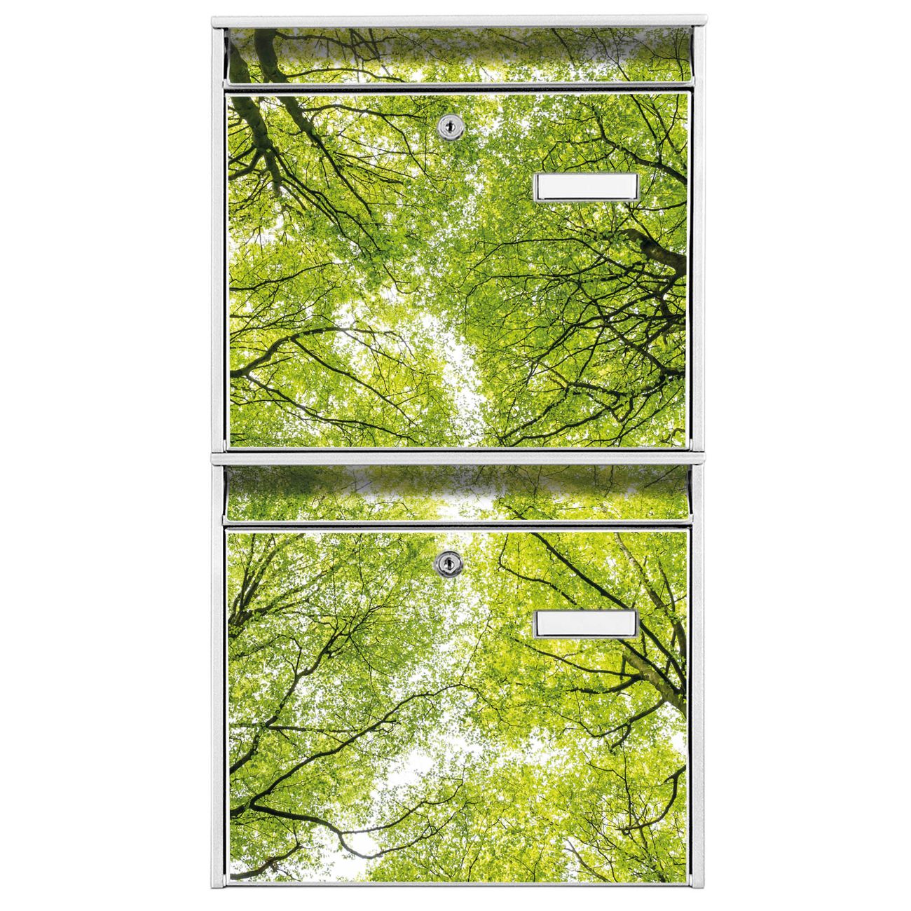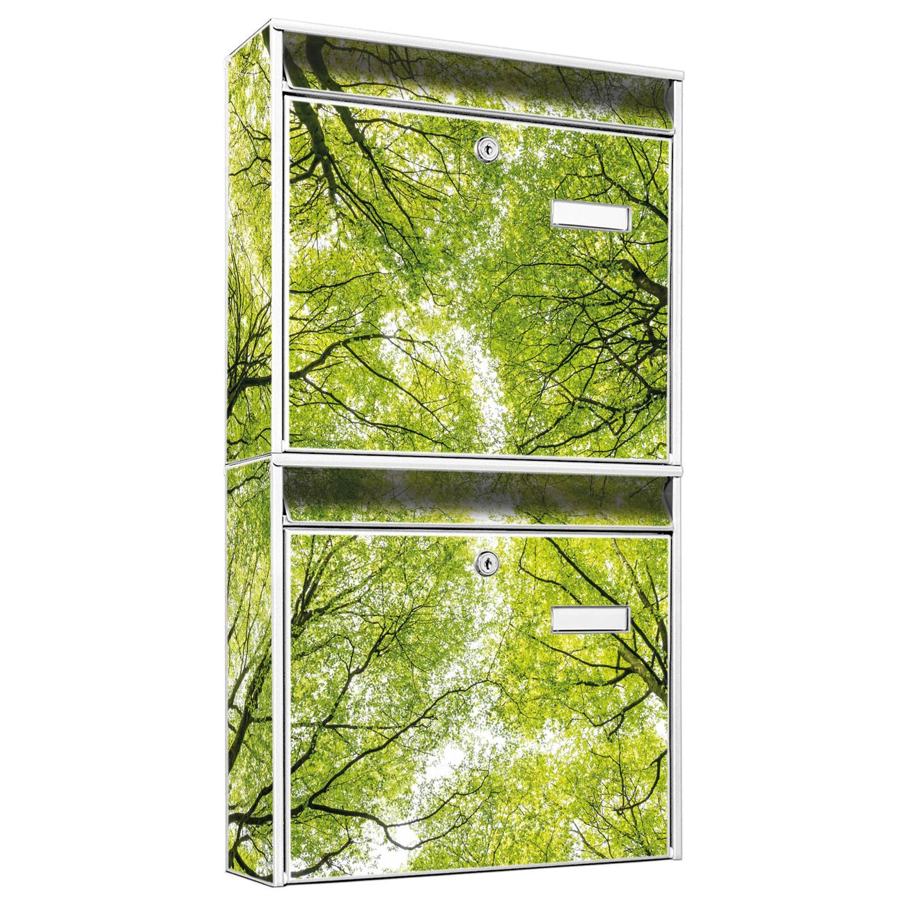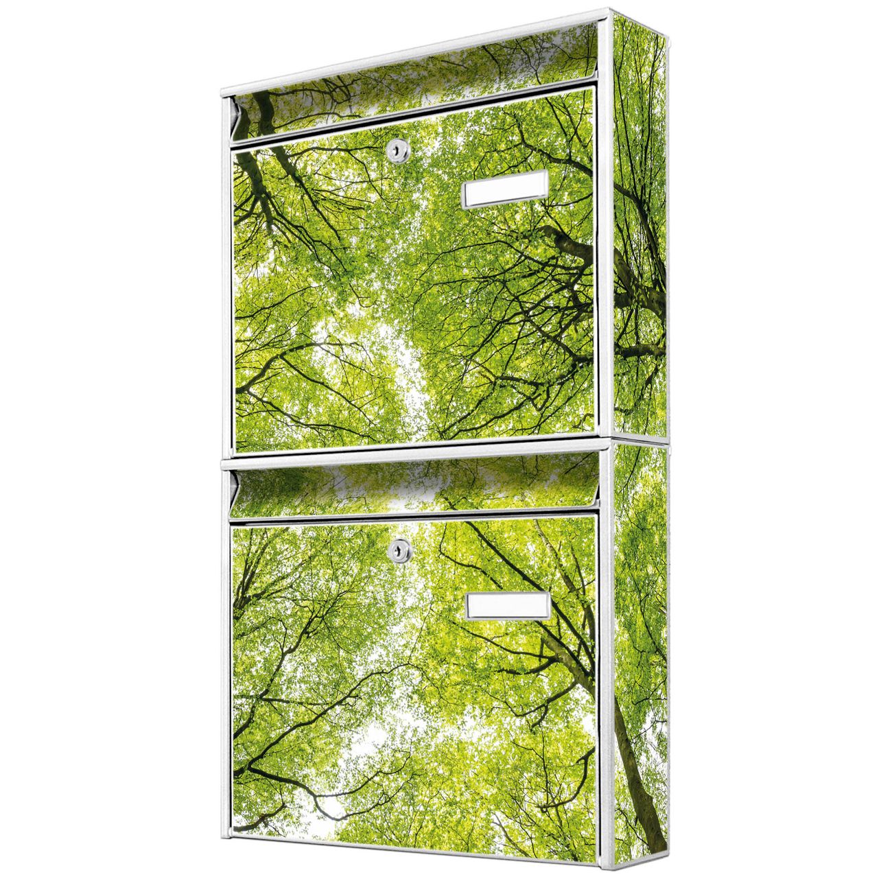 FUNKTION: Die Burg-Wächter Briefkastenanlage mit Motiv Zwischen Bäumen bietet Ihnen ausreichend Fassungsvermögen um auch A4 und C4 Sendungen zu empfangen. Das integrierte Namensschild lässt sich individuell beschriften. Wählen Sie aus den Grundfarben weiß, silber und schwarz. DESIGN: Die 2 Briefkästen haben ein ansprechendes und zeitloses Design, ohne dabei auf Funktionalität zu verzichten. Das Material ist sehr stabil, wetterfest und rostfrei. Durch das Motiv Zwischen Bäumen werden die Postkästen zu einem Blickfang. DETAILS: Die Postkästen bestehen aus verzinktem Stahl der zusätzlich mit Klarlack versiegelt wurde. Die Kästen sind gesamt 64,5cm hoch, 36,2cm breit und 10cm tief. Das Motiv besteht aus einer wetter- und UV-festen Folie, die Ihren Briefkasten zusätzlich vor Kratzern schützt. Die Postkästen werden mit Montagematerial, je einem Namensschild und je zwei Schlüsseln geliefert. NUTZEN: Das Briefkastenset eignet sich für die Wandmontage, die Größe bietet genügend Platz für Sendungen aller Art. Das zeitlose Design sowie die stabile Bauart bieten Ihnen einen treuen Begleiter für Ihre Post. BANJADO: