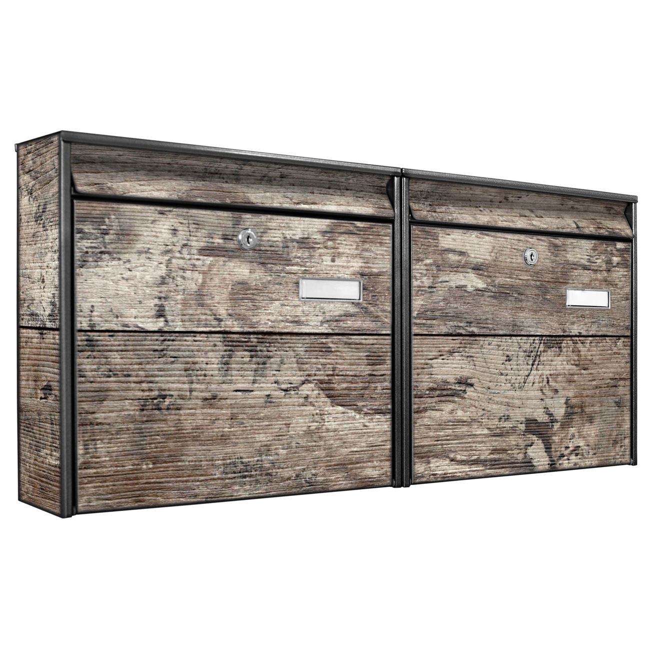 FUNKTION: Die Burg Wächter doppel Briefkastenanlage mit Motiv Alte Planken bietet Ihnen ein großes Fassungsvermögen, sodass auch A4 Sendungen eingeworfen werden können. Das Namensschild lässt sich individuell beschriften. DESIGN: Die 2 Briefkästen mit Alte Planken Motiv haben ein sehr ansprechendes und zeitloses Design. Heben Sie Sich von der tristen grauen Masse ab, ohne auf Funktionalität zu verzichten. Sie erhalten 2 Schlüssel sowie das Montagematerial. DETAILS: Der Doppelbriefkasten besteht aus verzinktem Stahl weiß. Er ist 72,5cm x 32,2cm x 10cm groß. Das Motiv besteht aus einer wetter- und UV-festen Folie, die Ihren Briefkasten zusätzlich vor Kratzern schützt. NUTZEN: Die stabile Bauart sowie die Wetterfestigkeit machen diese doppel Briefkästen zu einem zuverlässigen Begleiter im Alltag. Effektvoll in Reihe gehangen schmückt die Anlage jede Hauswand. BANJADO: Ihr Briefkasten wird in Sachsen in einer kleinen Manufaktur von Hand veredelt. Die Motivfolie ist lösungsmittelfrei und schutzlaminiert für einen langen Halt. Wir legen großen Wert auf die Verbindung von Funktionalität und Design. Sie erhalten Handarbeit aus Sachsen.