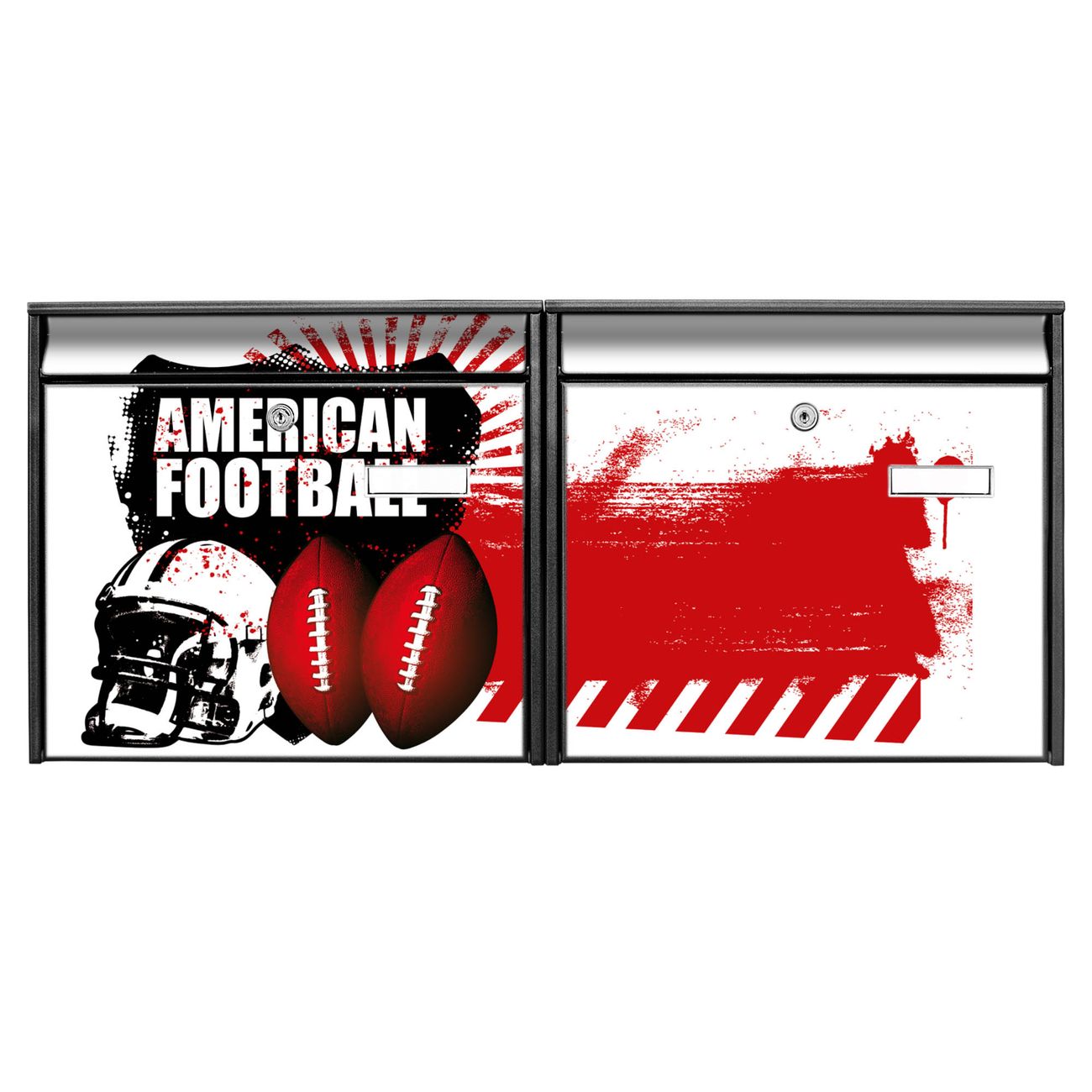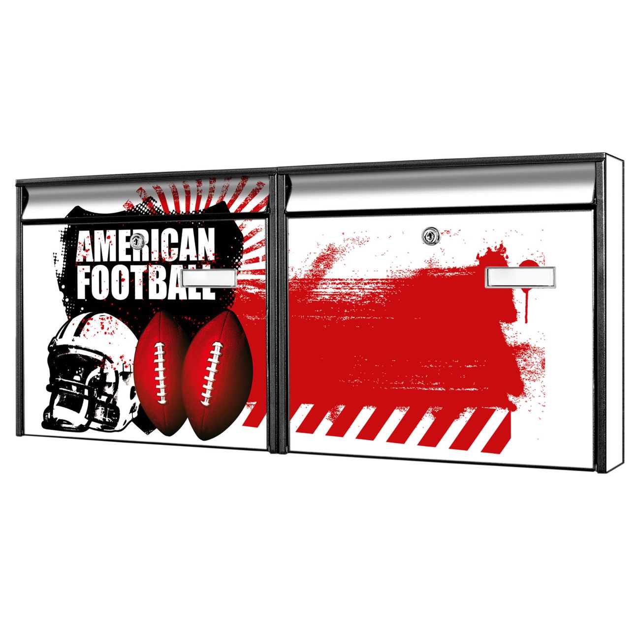 FUNKTION: Die Burg Wächter doppel Briefkastenanlage mit Motiv American Football bietet Ihnen ein großes Fassungsvermögen, sodass auch A4 Sendungen eingeworfen werden können. Das Namensschild lässt sich individuell beschriften. DESIGN: Die 2 Briefkästen mit American Football Motiv haben ein sehr ansprechendes und zeitloses Design. Heben Sie Sich von der tristen grauen Masse ab, ohne auf Funktionalität zu verzichten. Sie erhalten 2 Schlüssel sowie das Montagematerial. DETAILS: Der Doppelbriefkasten besteht aus verzinktem Stahl weiß. Er ist 72,5cm x 32,2cm x 10cm groß. Das Motiv besteht aus einer wetter- und UV-festen Folie, die Ihren Briefkasten zusätzlich vor Kratzern schützt. NUTZEN: Die stabile Bauart sowie die Wetterfestigkeit machen diese doppel Briefkästen zu einem zuverlässigen Begleiter im Alltag. Effektvoll in Reihe gehangen schmückt die Anlage jede Hauswand. BANJADO: Ihr Briefkasten wird in Sachsen in einer kleinen Manufaktur von Hand veredelt. Die Motivfolie ist lösungsmittelfrei und schutzlaminiert für einen langen Halt. Wir legen großen Wert auf die Verbindung von Funktionalität und Design. Sie erhalten Handarbeit aus Sachsen.