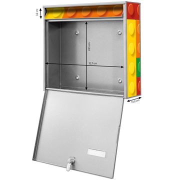 FUNKTION: Die Burg Wächter doppel Briefkastenanlage mit Motiv Bausteine bietet Ihnen ein großes Fassungsvermögen, sodass auch A4 Sendungen eingeworfen werden können. Das Namensschild lässt sich individuell beschriften. DESIGN: Die 2 Briefkästen mit Bausteine Motiv haben ein sehr ansprechendes und zeitloses Design. Heben Sie Sich von der tristen grauen Masse ab, ohne auf Funktionalität zu verzichten. Sie erhalten 2 Schlüssel sowie das Montagematerial. DETAILS: Der Doppelbriefkasten besteht aus verzinktem Stahl weiß. Er ist 72,5cm x 32,2cm x 10cm groß. Das Motiv besteht aus einer wetter- und UV-festen Folie, die Ihren Briefkasten zusätzlich vor Kratzern schützt. NUTZEN: Die stabile Bauart sowie die Wetterfestigkeit machen diese doppel Briefkästen zu einem zuverlässigen Begleiter im Alltag. Effektvoll in Reihe gehangen schmückt die Anlage jede Hauswand. BANJADO: Ihr Briefkasten wird in Sachsen in einer kleinen Manufaktur von Hand veredelt. Die Motivfolie ist lösungsmittelfrei und schutzlaminiert für einen langen Halt. Wir legen großen Wert auf die Verbindung von Funktionalität und Design. Sie erhalten Handarbeit aus Sachsen.