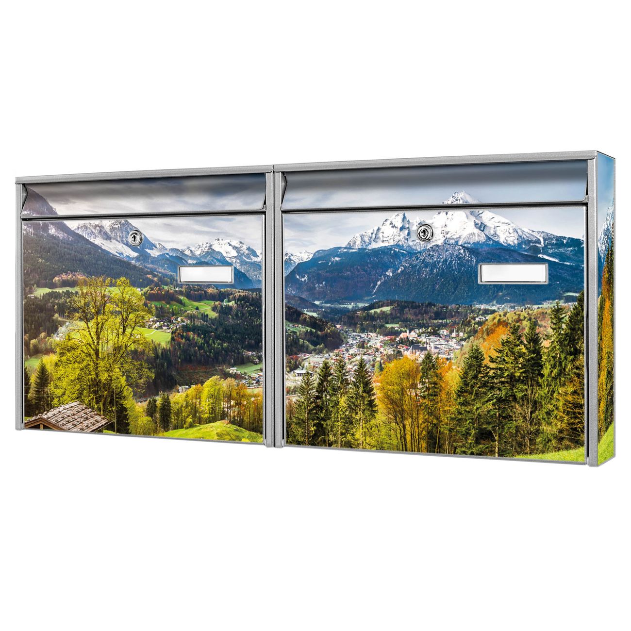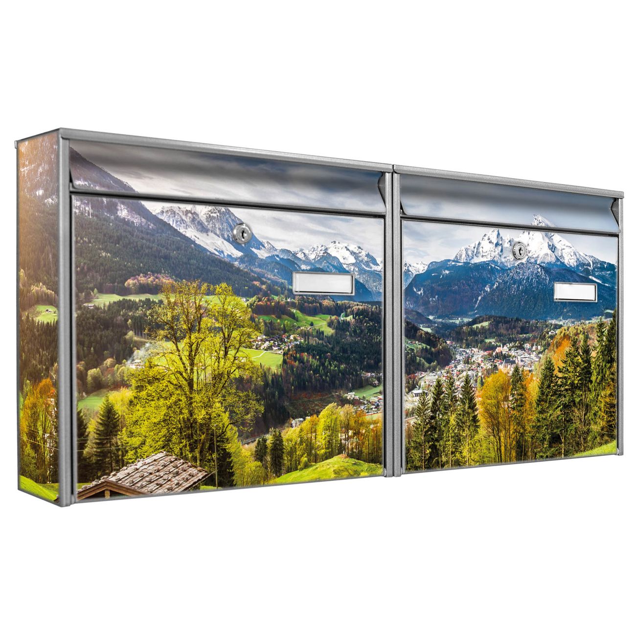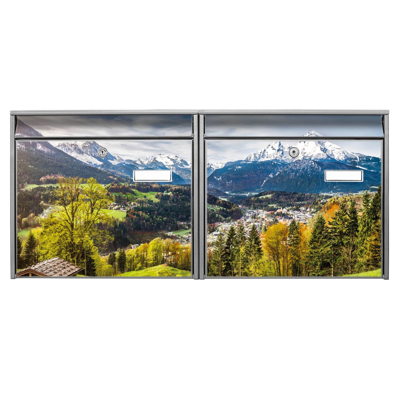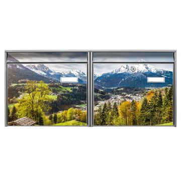 FUNKTION: Die Burg Wächter doppel Briefkastenanlage mit Motiv Berchtesgadener Land bietet Ihnen ein großes Fassungsvermögen, sodass auch A4 Sendungen eingeworfen werden können. Das Namensschild lässt sich individuell beschriften. DESIGN: Die 2 Briefkästen mit Berchtesgadener Land Motiv haben ein sehr ansprechendes und zeitloses Design. Heben Sie Sich von der tristen grauen Masse ab, ohne auf Funktionalität zu verzichten. Sie erhalten 2 Schlüssel sowie das Montagematerial. DETAILS: Der Doppelbriefkasten besteht aus verzinktem Stahl weiß. Er ist 72,5cm x 32,2cm x 10cm groß. Das Motiv besteht aus einer wetter- und UV-festen Folie, die Ihren Briefkasten zusätzlich vor Kratzern schützt. NUTZEN: Die stabile Bauart sowie die Wetterfestigkeit machen diese doppel Briefkästen zu einem zuverlässigen Begleiter im Alltag. Effektvoll in Reihe gehangen schmückt die Anlage jede Hauswand. BANJADO: Ihr Briefkasten wird in Sachsen in einer kleinen Manufaktur von Hand veredelt. Die Motivfolie ist lösungsmittelfrei und schutzlaminiert für einen langen Halt. Wir legen großen Wert auf die Verbindung von Funktionalität und Design. Sie erhalten Handarbeit aus Sachsen.