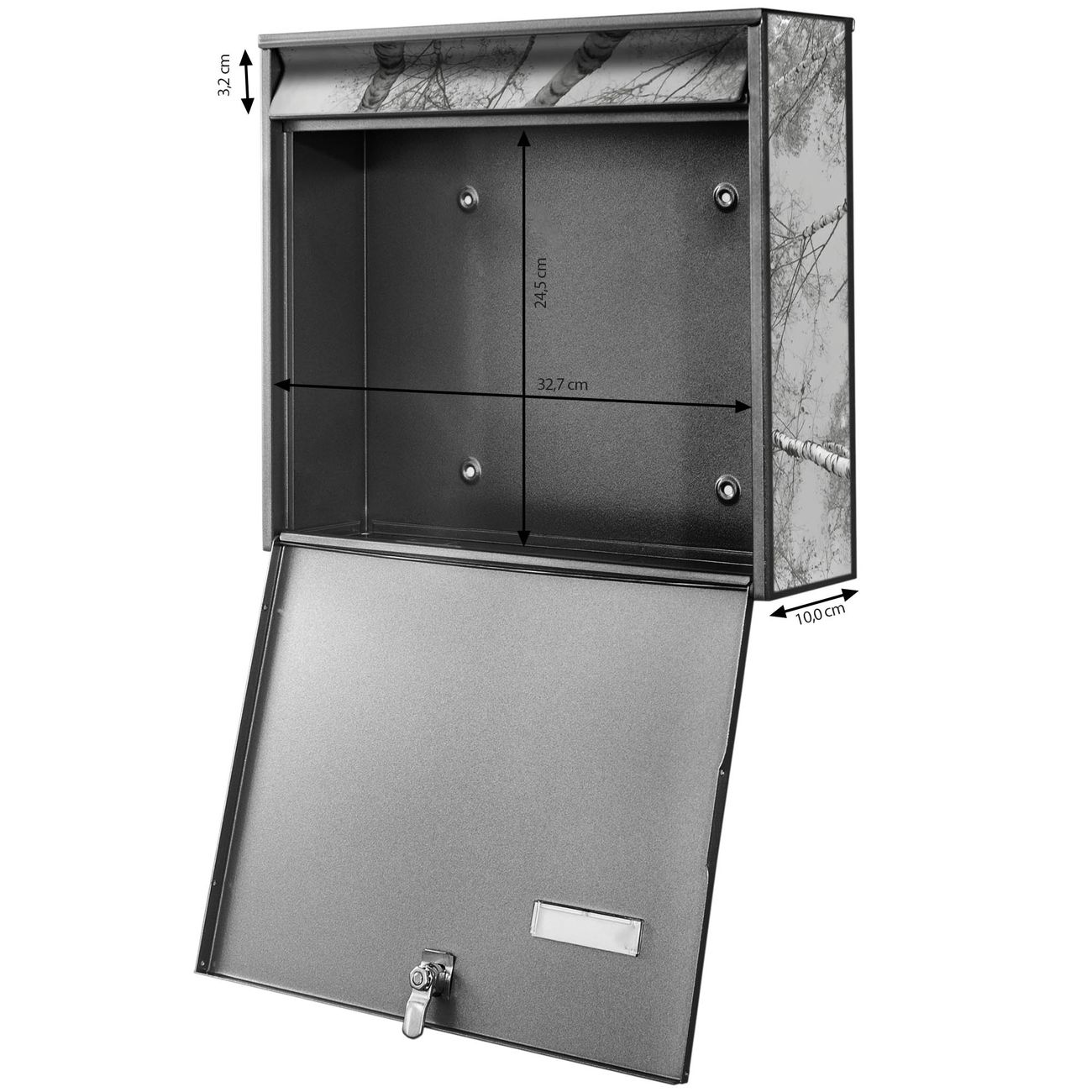 FUNKTION: Die Burg Wächter doppel Briefkastenanlage mit Motiv Birkenwald bietet Ihnen ein großes Fassungsvermögen, sodass auch A4 Sendungen eingeworfen werden können. Das Namensschild lässt sich individuell beschriften. DESIGN: Die 2 Briefkästen mit Birkenwald Motiv haben ein sehr ansprechendes und zeitloses Design. Heben Sie Sich von der tristen grauen Masse ab, ohne auf Funktionalität zu verzichten. Sie erhalten 2 Schlüssel sowie das Montagematerial. DETAILS: Der Doppelbriefkasten besteht aus verzinktem Stahl weiß. Er ist 72,5cm x 32,2cm x 10cm groß. Das Motiv besteht aus einer wetter- und UV-festen Folie, die Ihren Briefkasten zusätzlich vor Kratzern schützt. NUTZEN: Die stabile Bauart sowie die Wetterfestigkeit machen diese doppel Briefkästen zu einem zuverlässigen Begleiter im Alltag. Effektvoll in Reihe gehangen schmückt die Anlage jede Hauswand. BANJADO: Ihr Briefkasten wird in Sachsen in einer kleinen Manufaktur von Hand veredelt. Die Motivfolie ist lösungsmittelfrei und schutzlaminiert für einen langen Halt. Wir legen großen Wert auf die Verbindung von Funktionalität und Design. Sie erhalten Handarbeit aus Sachsen.