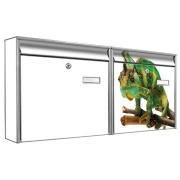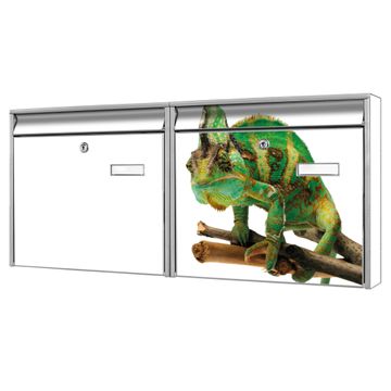 FUNKTION: Die Burg Wächter doppel Briefkastenanlage mit Motiv Chamäleon bietet Ihnen ein großes Fassungsvermögen, sodass auch A4 Sendungen eingeworfen werden können. Das Namensschild lässt sich individuell beschriften. DESIGN: Die 2 Briefkästen mit Chamäleon Motiv haben ein sehr ansprechendes und zeitloses Design. Heben Sie Sich von der tristen grauen Masse ab, ohne auf Funktionalität zu verzichten. Sie erhalten 2 Schlüssel sowie das Montagematerial. DETAILS: Der Doppelbriefkasten besteht aus verzinktem Stahl weiß. Er ist 72,5cm x 32,2cm x 10cm groß. Das Motiv besteht aus einer wetter- und UV-festen Folie, die Ihren Briefkasten zusätzlich vor Kratzern schützt. NUTZEN: Die stabile Bauart sowie die Wetterfestigkeit machen diese doppel Briefkästen zu einem zuverlässigen Begleiter im Alltag. Effektvoll in Reihe gehangen schmückt die Anlage jede Hauswand. BANJADO: Ihr Briefkasten wird in Sachsen in einer kleinen Manufaktur von Hand veredelt. Die Motivfolie ist lösungsmittelfrei und schutzlaminiert für einen langen Halt. Wir legen großen Wert auf die Verbindung von Funktionalität und Design. Sie erhalten Handarbeit aus Sachsen.