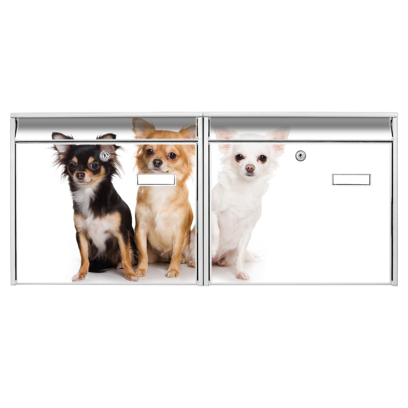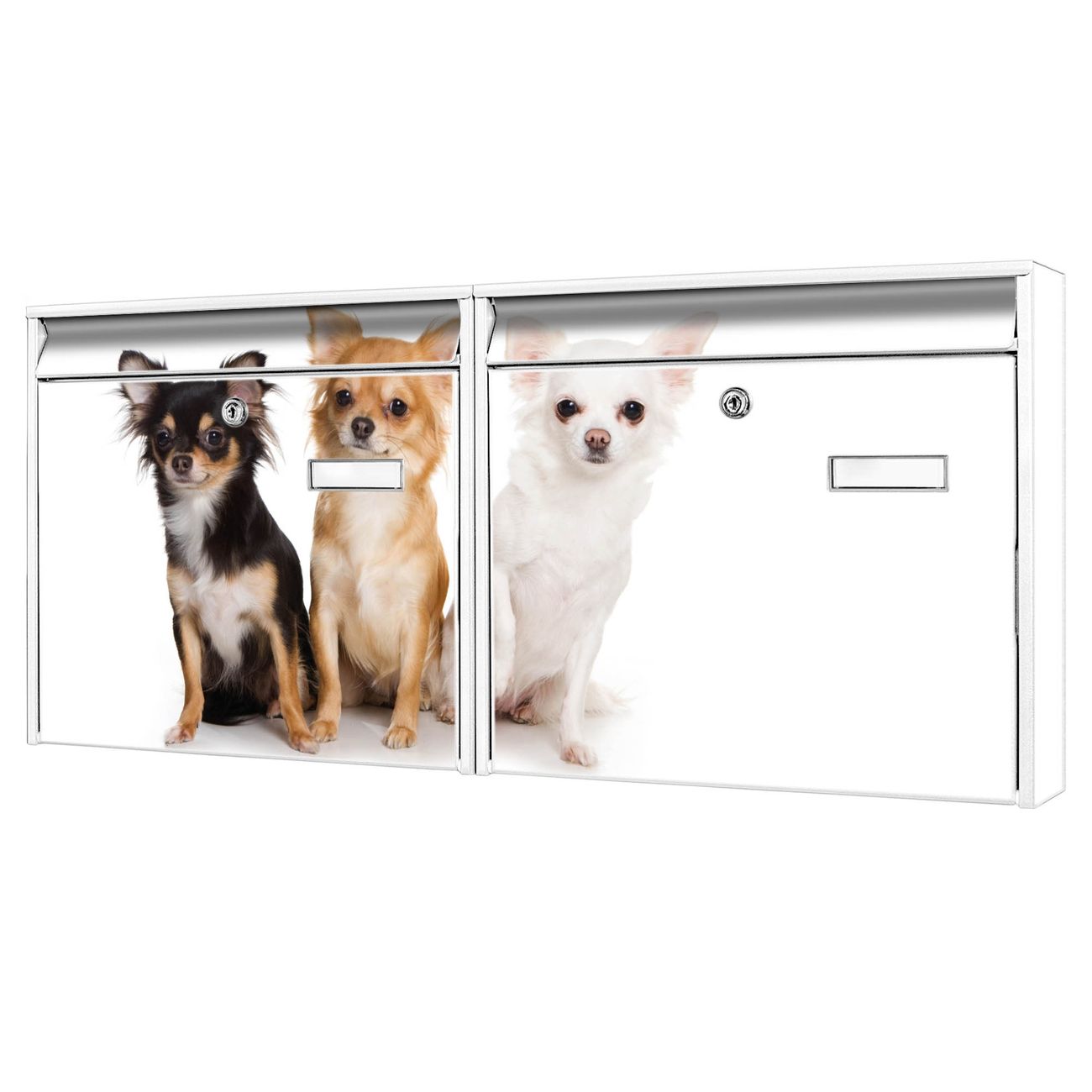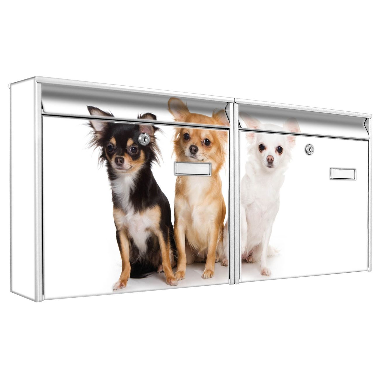 FUNKTION: Die Burg Wächter doppel Briefkastenanlage mit Motiv Chihuahua bietet Ihnen ein großes Fassungsvermögen, sodass auch A4 Sendungen eingeworfen werden können. Das Namensschild lässt sich individuell beschriften. DESIGN: Die 2 Briefkästen mit Chihuahua Motiv haben ein sehr ansprechendes und zeitloses Design. Heben Sie Sich von der tristen grauen Masse ab, ohne auf Funktionalität zu verzichten. Sie erhalten 2 Schlüssel sowie das Montagematerial. DETAILS: Der Doppelbriefkasten besteht aus verzinktem Stahl weiß. Er ist 72,5cm x 32,2cm x 10cm groß. Das Motiv besteht aus einer wetter- und UV-festen Folie, die Ihren Briefkasten zusätzlich vor Kratzern schützt. NUTZEN: Die stabile Bauart sowie die Wetterfestigkeit machen diese doppel Briefkästen zu einem zuverlässigen Begleiter im Alltag. Effektvoll in Reihe gehangen schmückt die Anlage jede Hauswand. BANJADO: Ihr Briefkasten wird in Sachsen in einer kleinen Manufaktur von Hand veredelt. Die Motivfolie ist lösungsmittelfrei und schutzlaminiert für einen langen Halt. Wir legen großen Wert auf die Verbindung von Funktionalität und Design. Sie erhalten Handarbeit aus Sachsen.