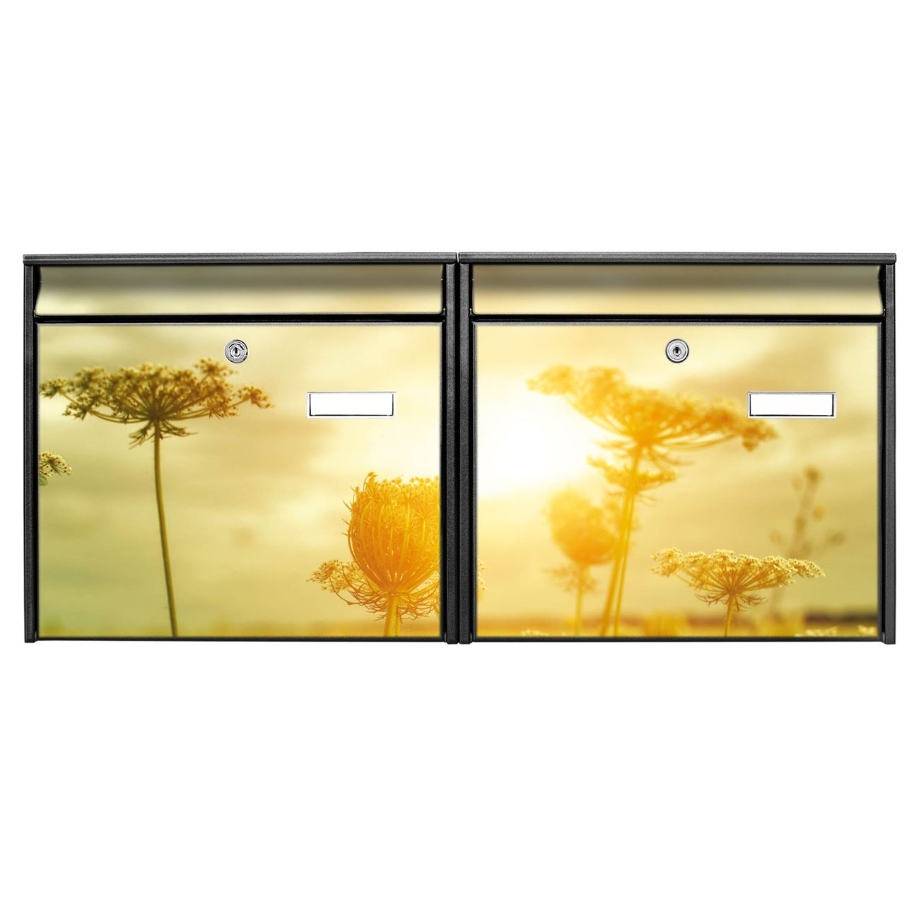 FUNKTION: Die Burg Wächter doppel Briefkastenanlage mit Motiv Dill im Sonnenlicht bietet Ihnen ein großes Fassungsvermögen, sodass auch A4 Sendungen eingeworfen werden können. Das Namensschild lässt sich individuell beschriften. DESIGN: Die 2 Briefkästen mit Dill im Sonnenlicht Motiv haben ein sehr ansprechendes und zeitloses Design. Heben Sie Sich von der tristen grauen Masse ab, ohne auf Funktionalität zu verzichten. Sie erhalten 2 Schlüssel sowie das Montagematerial. DETAILS: Der Doppelbriefkasten besteht aus verzinktem Stahl weiß. Er ist 72,5cm x 32,2cm x 10cm groß. Das Motiv besteht aus einer wetter- und UV-festen Folie, die Ihren Briefkasten zusätzlich vor Kratzern schützt. NUTZEN: Die stabile Bauart sowie die Wetterfestigkeit machen diese doppel Briefkästen zu einem zuverlässigen Begleiter im Alltag. Effektvoll in Reihe gehangen schmückt die Anlage jede Hauswand. BANJADO: Ihr Briefkasten wird in Sachsen in einer kleinen Manufaktur von Hand veredelt. Die Motivfolie ist lösungsmittelfrei und schutzlaminiert für einen langen Halt. Wir legen großen Wert auf die Verbindung von Funktionalität und Design. Sie erhalten Handarbeit aus Sachsen.