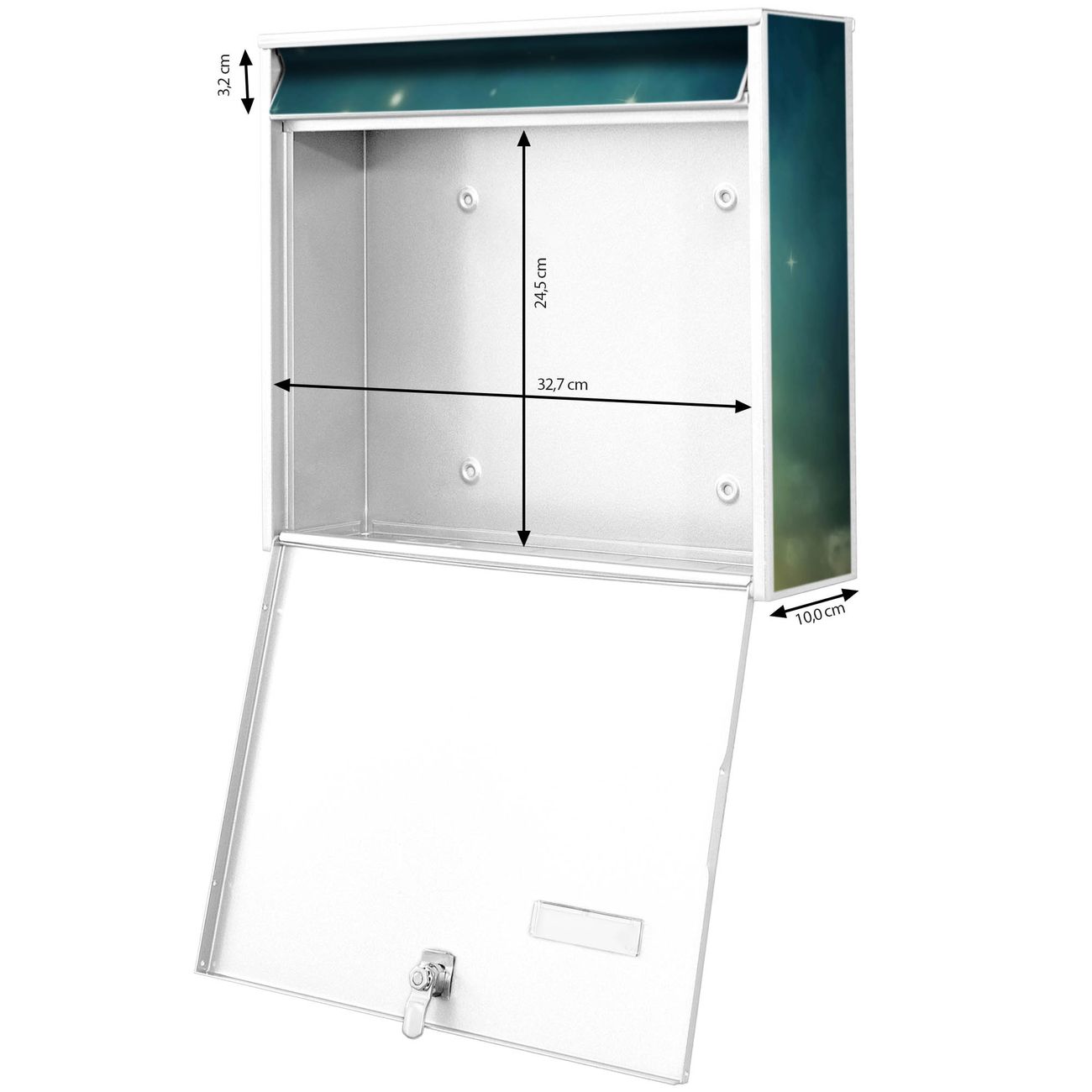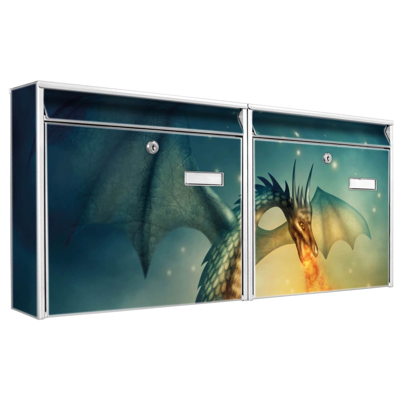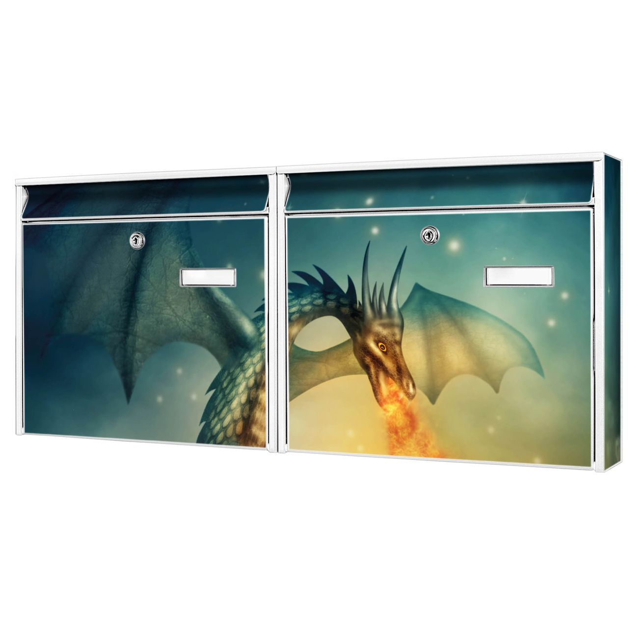 FUNKTION: Die Burg Wächter doppel Briefkastenanlage mit Motiv Drachen bietet Ihnen ein großes Fassungsvermögen, sodass auch A4 Sendungen eingeworfen werden können. Das Namensschild lässt sich individuell beschriften. DESIGN: Die 2 Briefkästen mit Drachen Motiv haben ein sehr ansprechendes und zeitloses Design. Heben Sie Sich von der tristen grauen Masse ab, ohne auf Funktionalität zu verzichten. Sie erhalten 2 Schlüssel sowie das Montagematerial. DETAILS: Der Doppelbriefkasten besteht aus verzinktem Stahl weiß. Er ist 72,5cm x 32,2cm x 10cm groß. Das Motiv besteht aus einer wetter- und UV-festen Folie, die Ihren Briefkasten zusätzlich vor Kratzern schützt. NUTZEN: Die stabile Bauart sowie die Wetterfestigkeit machen diese doppel Briefkästen zu einem zuverlässigen Begleiter im Alltag. Effektvoll in Reihe gehangen schmückt die Anlage jede Hauswand. BANJADO: Ihr Briefkasten wird in Sachsen in einer kleinen Manufaktur von Hand veredelt. Die Motivfolie ist lösungsmittelfrei und schutzlaminiert für einen langen Halt. Wir legen großen Wert auf die Verbindung von Funktionalität und Design. Sie erhalten Handarbeit aus Sachsen.