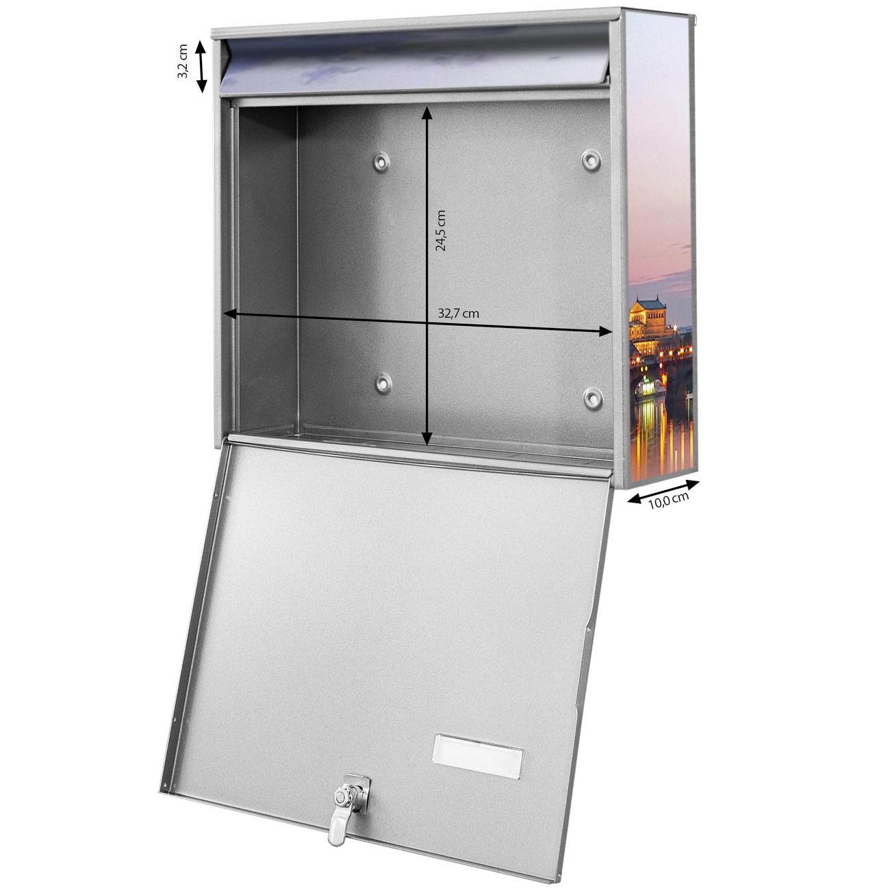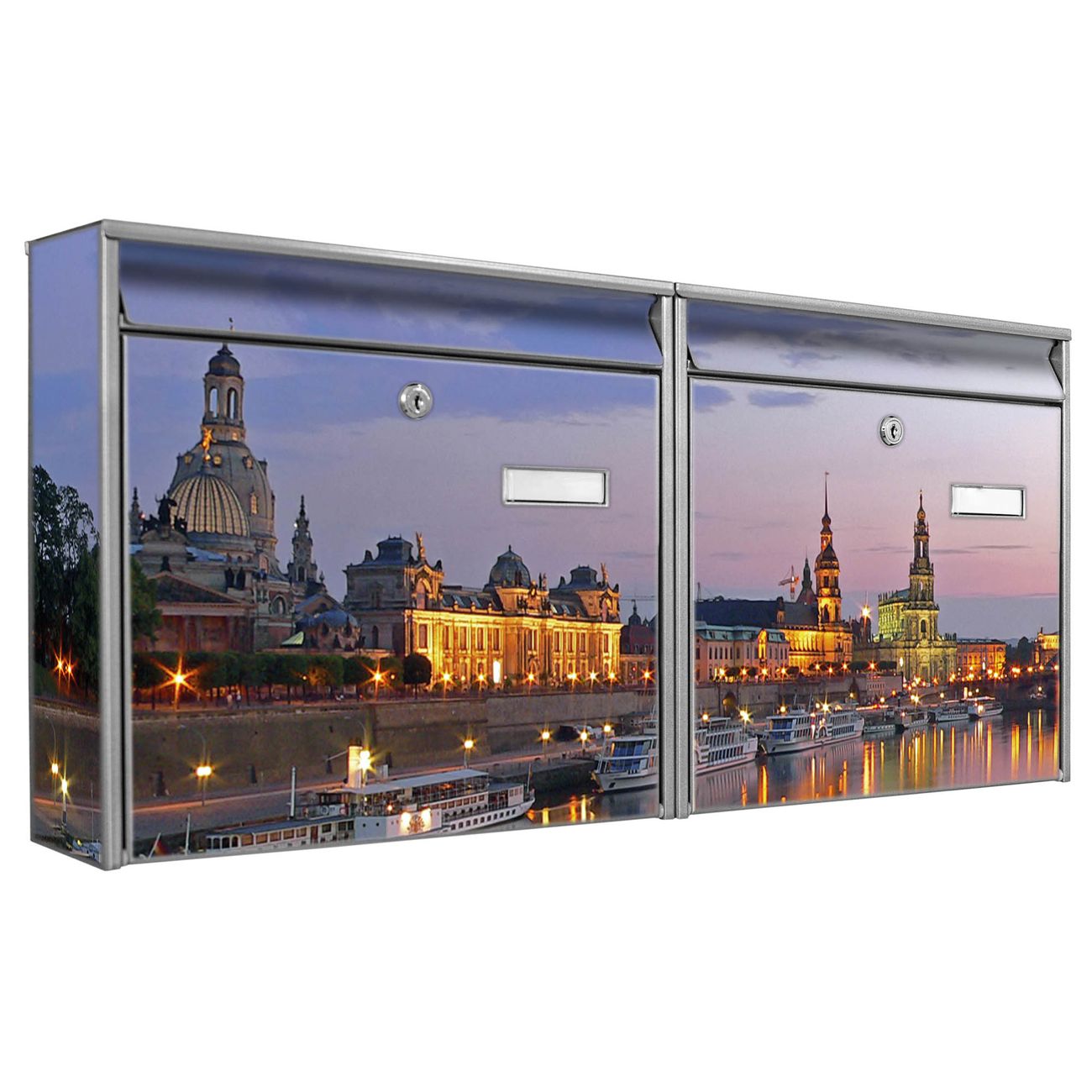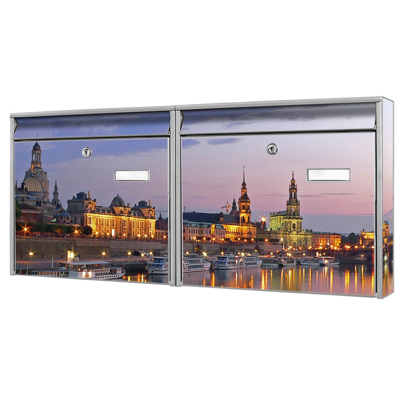 FUNKTION: Die Burg Wächter doppel Briefkastenanlage mit Motiv Dresden bietet Ihnen ein großes Fassungsvermögen, sodass auch A4 Sendungen eingeworfen werden können. Das Namensschild lässt sich individuell beschriften. DESIGN: Die 2 Briefkästen mit Dresden Motiv haben ein sehr ansprechendes und zeitloses Design. Heben Sie Sich von der tristen grauen Masse ab, ohne auf Funktionalität zu verzichten. Sie erhalten 2 Schlüssel sowie das Montagematerial. DETAILS: Der Doppelbriefkasten besteht aus verzinktem Stahl weiß. Er ist 72,5cm x 32,2cm x 10cm groß. Das Motiv besteht aus einer wetter- und UV-festen Folie, die Ihren Briefkasten zusätzlich vor Kratzern schützt. NUTZEN: Die stabile Bauart sowie die Wetterfestigkeit machen diese doppel Briefkästen zu einem zuverlässigen Begleiter im Alltag. Effektvoll in Reihe gehangen schmückt die Anlage jede Hauswand. BANJADO: Ihr Briefkasten wird in Sachsen in einer kleinen Manufaktur von Hand veredelt. Die Motivfolie ist lösungsmittelfrei und schutzlaminiert für einen langen Halt. Wir legen großen Wert auf die Verbindung von Funktionalität und Design. Sie erhalten Handarbeit aus Sachsen.