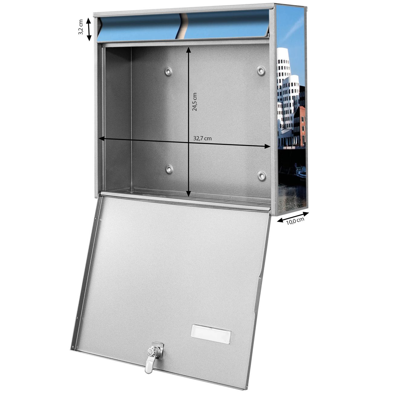 FUNKTION: Die Burg Wächter doppel Briefkastenanlage mit Motiv Düsseldorf bietet Ihnen ein großes Fassungsvermögen, sodass auch A4 Sendungen eingeworfen werden können. Das Namensschild lässt sich individuell beschriften. DESIGN: Die 2 Briefkästen mit Düsseldorf Motiv haben ein sehr ansprechendes und zeitloses Design. Heben Sie Sich von der tristen grauen Masse ab, ohne auf Funktionalität zu verzichten. Sie erhalten 2 Schlüssel sowie das Montagematerial. DETAILS: Der Doppelbriefkasten besteht aus verzinktem Stahl weiß. Er ist 72,5cm x 32,2cm x 10cm groß. Das Motiv besteht aus einer wetter- und UV-festen Folie, die Ihren Briefkasten zusätzlich vor Kratzern schützt. NUTZEN: Die stabile Bauart sowie die Wetterfestigkeit machen diese doppel Briefkästen zu einem zuverlässigen Begleiter im Alltag. Effektvoll in Reihe gehangen schmückt die Anlage jede Hauswand. BANJADO: Ihr Briefkasten wird in Sachsen in einer kleinen Manufaktur von Hand veredelt. Die Motivfolie ist lösungsmittelfrei und schutzlaminiert für einen langen Halt. Wir legen großen Wert auf die Verbindung von Funktionalität und Design. Sie erhalten Handarbeit aus Sachsen.