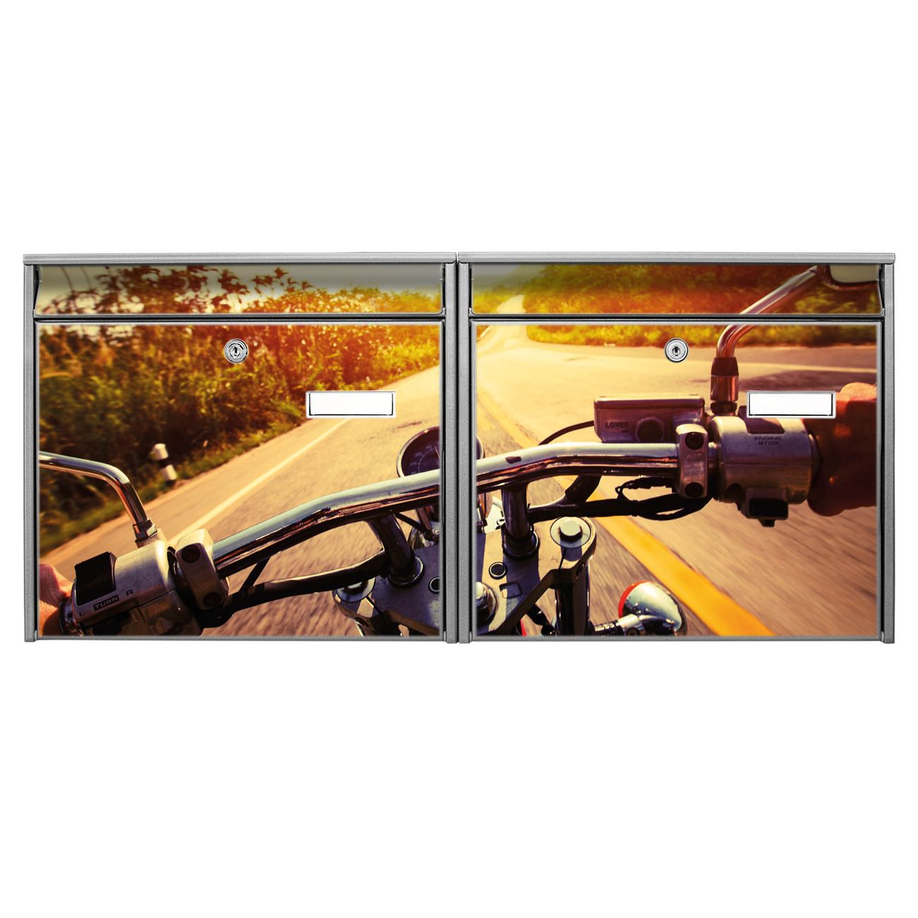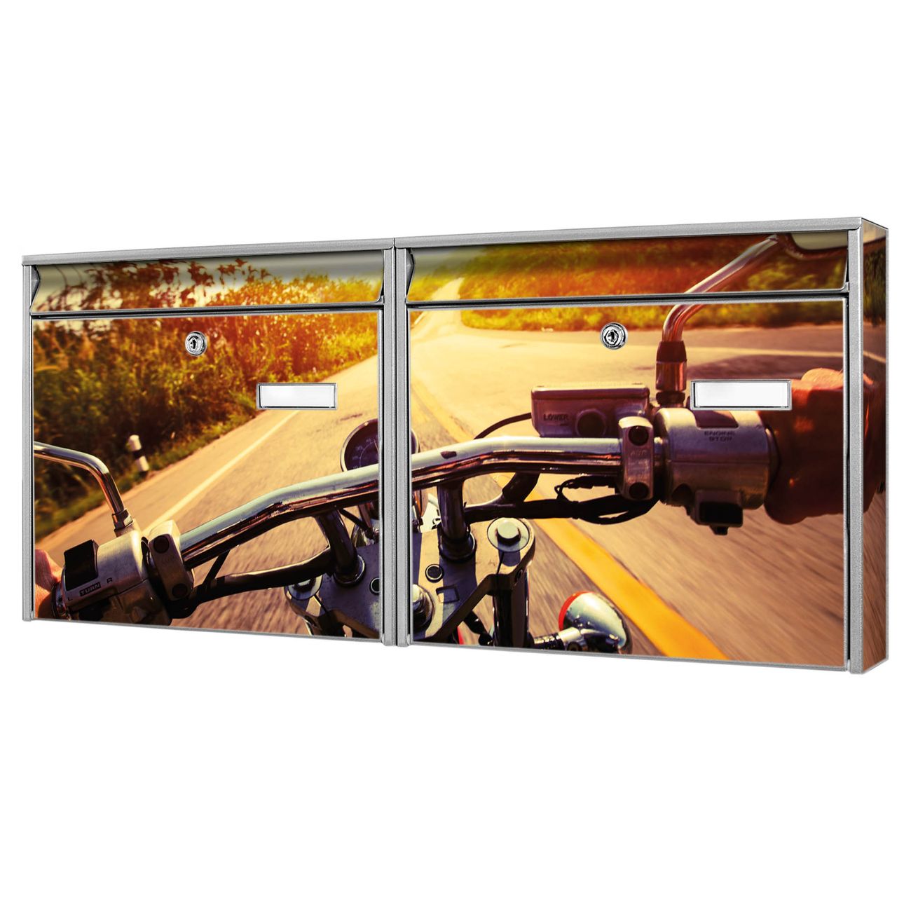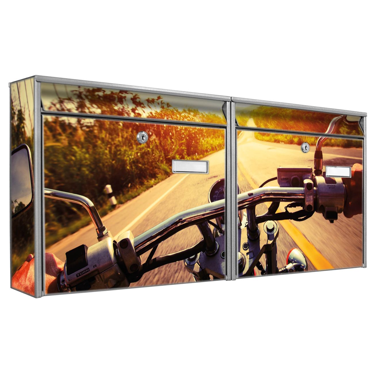 FUNKTION: Die Burg Wächter doppel Briefkastenanlage mit Motiv Easy Rider bietet Ihnen ein großes Fassungsvermögen, sodass auch A4 Sendungen eingeworfen werden können. Das Namensschild lässt sich individuell beschriften. DESIGN: Die 2 Briefkästen mit Easy Rider Motiv haben ein sehr ansprechendes und zeitloses Design. Heben Sie Sich von der tristen grauen Masse ab, ohne auf Funktionalität zu verzichten. Sie erhalten 2 Schlüssel sowie das Montagematerial. DETAILS: Der Doppelbriefkasten besteht aus verzinktem Stahl weiß. Er ist 72,5cm x 32,2cm x 10cm groß. Das Motiv besteht aus einer wetter- und UV-festen Folie, die Ihren Briefkasten zusätzlich vor Kratzern schützt. NUTZEN: Die stabile Bauart sowie die Wetterfestigkeit machen diese doppel Briefkästen zu einem zuverlässigen Begleiter im Alltag. Effektvoll in Reihe gehangen schmückt die Anlage jede Hauswand. BANJADO: Ihr Briefkasten wird in Sachsen in einer kleinen Manufaktur von Hand veredelt. Die Motivfolie ist lösungsmittelfrei und schutzlaminiert für einen langen Halt. Wir legen großen Wert auf die Verbindung von Funktionalität und Design. Sie erhalten Handarbeit aus Sachsen.