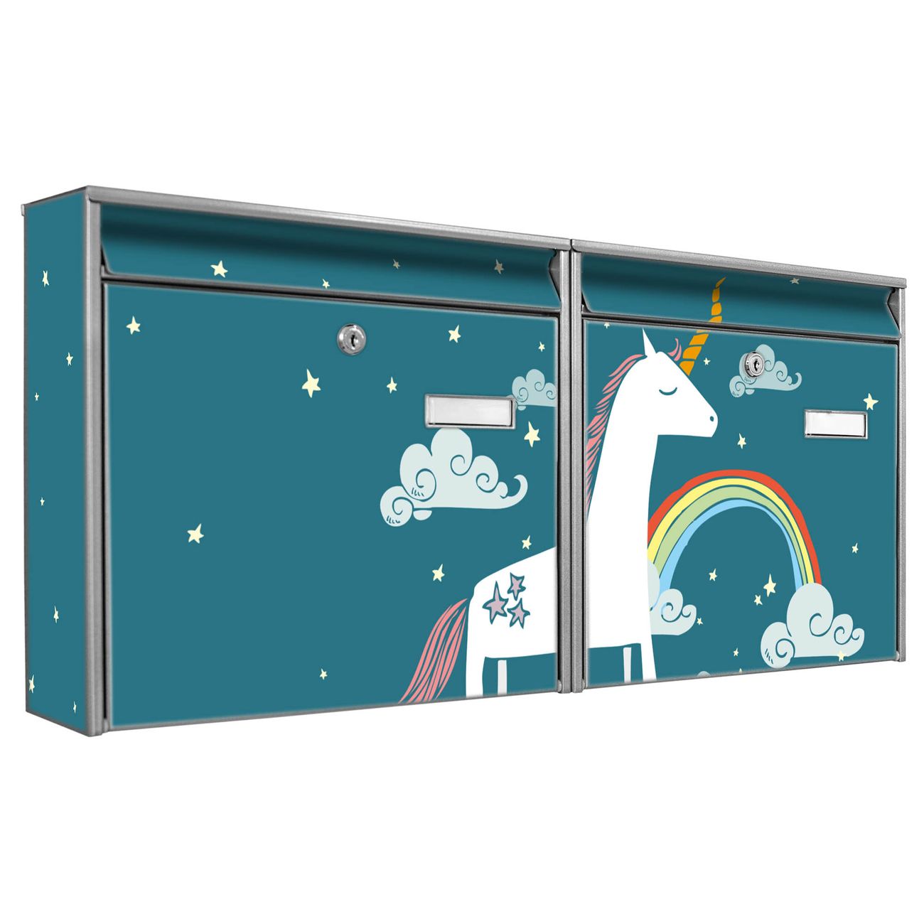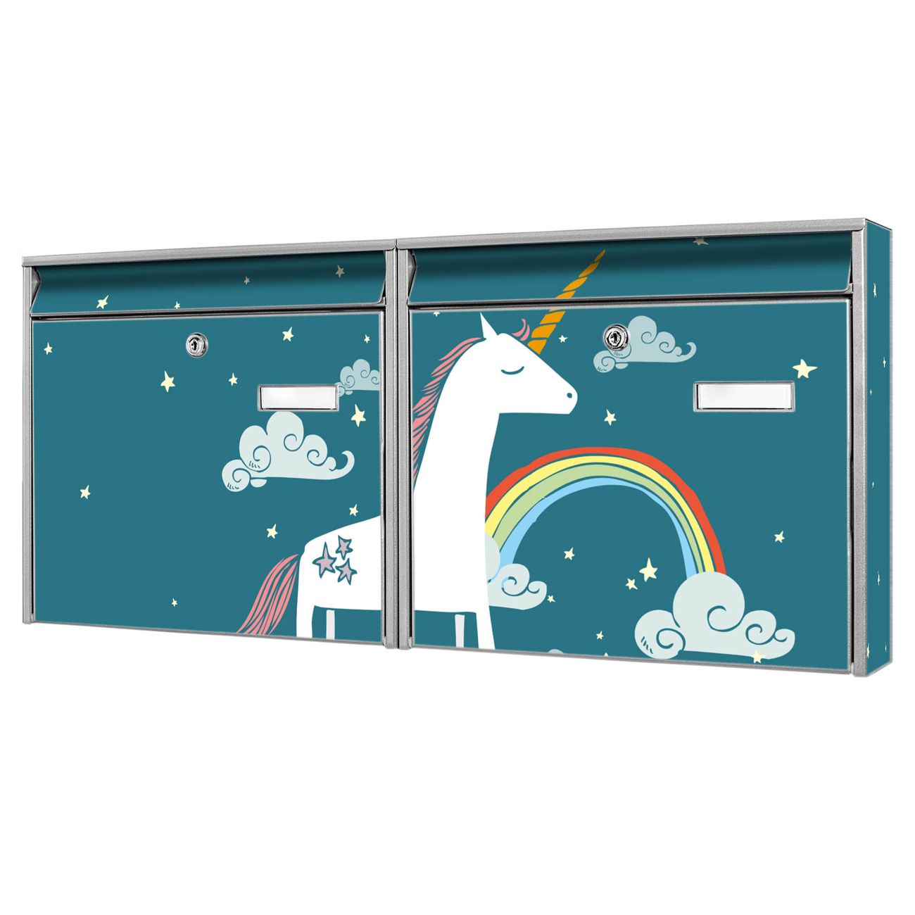 FUNKTION: Die Burg Wächter doppel Briefkastenanlage mit Motiv Einhorn bietet Ihnen ein großes Fassungsvermögen, sodass auch A4 Sendungen eingeworfen werden können. Das Namensschild lässt sich individuell beschriften. DESIGN: Die 2 Briefkästen mit Einhorn Motiv haben ein sehr ansprechendes und zeitloses Design. Heben Sie Sich von der tristen grauen Masse ab, ohne auf Funktionalität zu verzichten. Sie erhalten 2 Schlüssel sowie das Montagematerial. DETAILS: Der Doppelbriefkasten besteht aus verzinktem Stahl weiß. Er ist 72,5cm x 32,2cm x 10cm groß. Das Motiv besteht aus einer wetter- und UV-festen Folie, die Ihren Briefkasten zusätzlich vor Kratzern schützt. NUTZEN: Die stabile Bauart sowie die Wetterfestigkeit machen diese doppel Briefkästen zu einem zuverlässigen Begleiter im Alltag. Effektvoll in Reihe gehangen schmückt die Anlage jede Hauswand. BANJADO: Ihr Briefkasten wird in Sachsen in einer kleinen Manufaktur von Hand veredelt. Die Motivfolie ist lösungsmittelfrei und schutzlaminiert für einen langen Halt. Wir legen großen Wert auf die Verbindung von Funktionalität und Design. Sie erhalten Handarbeit aus Sachsen.