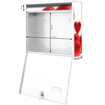 FUNKTION: Die Burg Wächter doppel Briefkastenanlage mit Motiv Fliegende Herzen bietet Ihnen ein großes Fassungsvermögen, sodass auch A4 Sendungen eingeworfen werden können. Das Namensschild lässt sich individuell beschriften. DESIGN: Die 2 Briefkästen mit Fliegende Herzen Motiv haben ein sehr ansprechendes und zeitloses Design. Heben Sie Sich von der tristen grauen Masse ab, ohne auf Funktionalität zu verzichten. Sie erhalten 2 Schlüssel sowie das Montagematerial. DETAILS: Der Doppelbriefkasten besteht aus verzinktem Stahl weiß. Er ist 72,5cm x 32,2cm x 10cm groß. Das Motiv besteht aus einer wetter- und UV-festen Folie, die Ihren Briefkasten zusätzlich vor Kratzern schützt. NUTZEN: Die stabile Bauart sowie die Wetterfestigkeit machen diese doppel Briefkästen zu einem zuverlässigen Begleiter im Alltag. Effektvoll in Reihe gehangen schmückt die Anlage jede Hauswand. BANJADO: Ihr Briefkasten wird in Sachsen in einer kleinen Manufaktur von Hand veredelt. Die Motivfolie ist lösungsmittelfrei und schutzlaminiert für einen langen Halt. Wir legen großen Wert auf die Verbindung von Funktionalität und Design. Sie erhalten Handarbeit aus Sachsen.