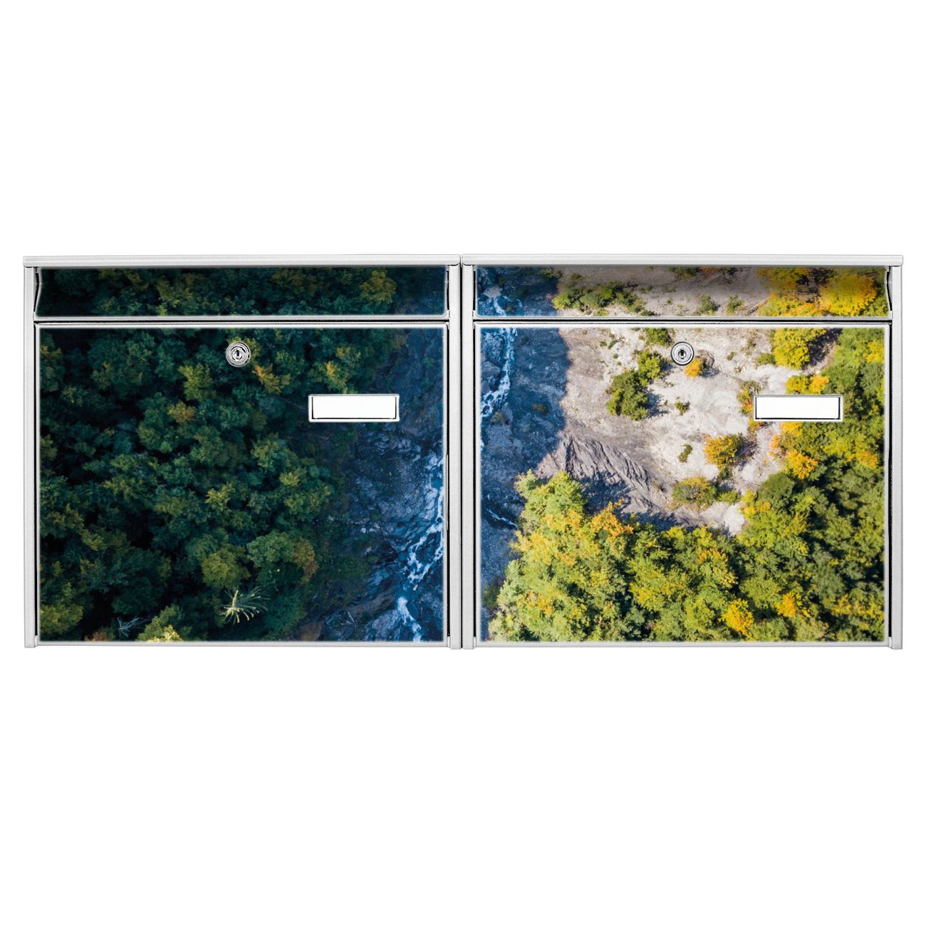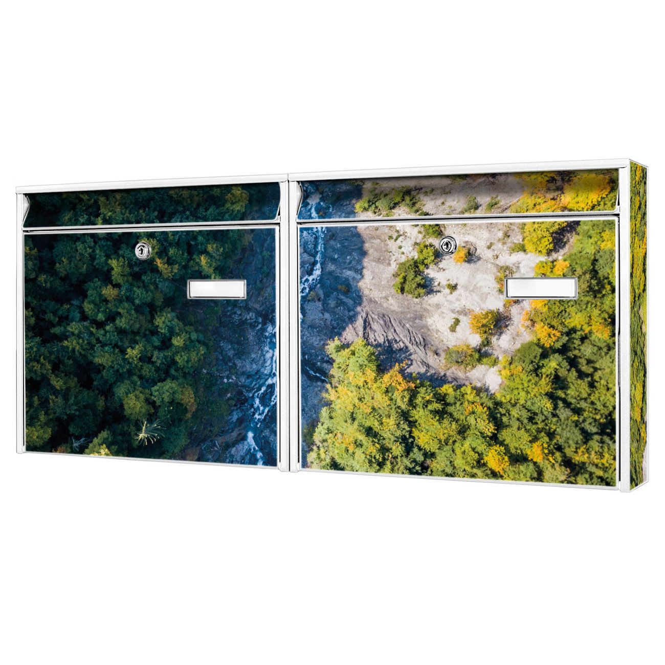 FUNKTION: Die Burg Wächter doppel Briefkastenanlage mit Motiv Fluss im Tal bietet Ihnen ein großes Fassungsvermögen, sodass auch A4 Sendungen eingeworfen werden können. Das Namensschild lässt sich individuell beschriften. DESIGN: Die 2 Briefkästen mit Fluss im Tal Motiv haben ein sehr ansprechendes und zeitloses Design. Heben Sie Sich von der tristen grauen Masse ab, ohne auf Funktionalität zu verzichten. Sie erhalten 2 Schlüssel sowie das Montagematerial. DETAILS: Der Doppelbriefkasten besteht aus verzinktem Stahl weiß. Er ist 72,5cm x 32,2cm x 10cm groß. Das Motiv besteht aus einer wetter- und UV-festen Folie, die Ihren Briefkasten zusätzlich vor Kratzern schützt. NUTZEN: Die stabile Bauart sowie die Wetterfestigkeit machen diese doppel Briefkästen zu einem zuverlässigen Begleiter im Alltag. Effektvoll in Reihe gehangen schmückt die Anlage jede Hauswand. BANJADO: Ihr Briefkasten wird in Sachsen in einer kleinen Manufaktur von Hand veredelt. Die Motivfolie ist lösungsmittelfrei und schutzlaminiert für einen langen Halt. Wir legen großen Wert auf die Verbindung von Funktionalität und Design. Sie erhalten Handarbeit aus Sachsen.