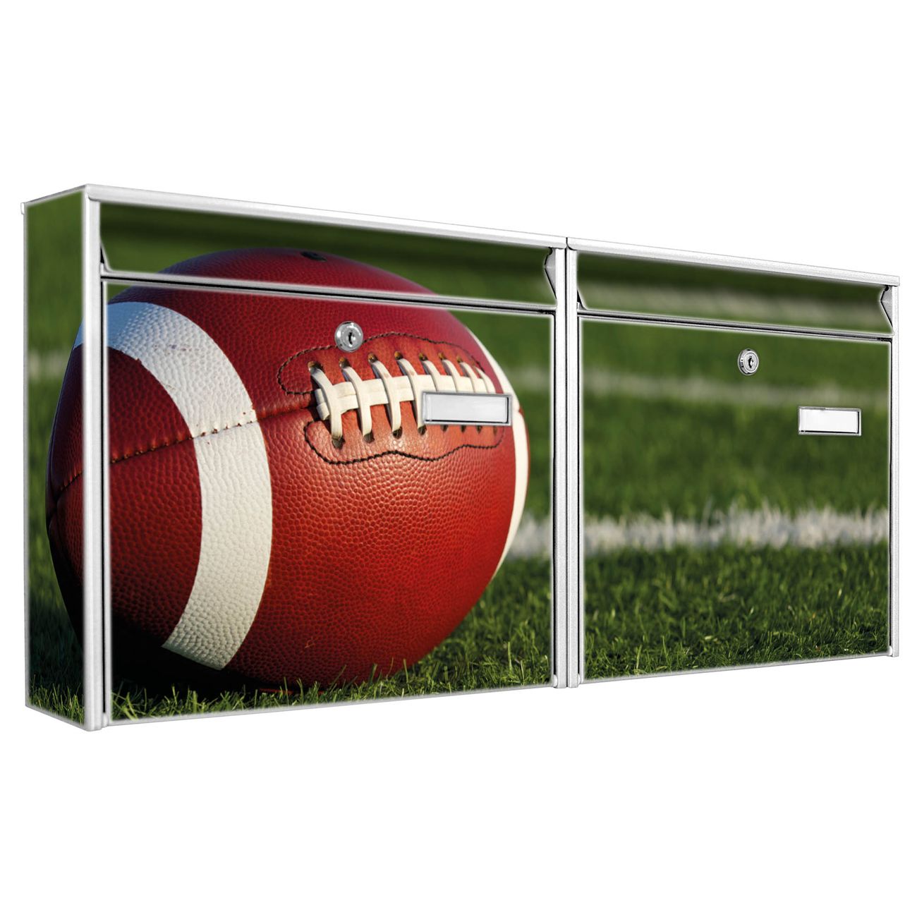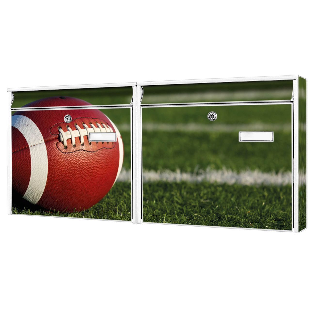 FUNKTION: Die Burg Wächter doppel Briefkastenanlage mit Motiv Football bietet Ihnen ein großes Fassungsvermögen, sodass auch A4 Sendungen eingeworfen werden können. Das Namensschild lässt sich individuell beschriften. DESIGN: Die 2 Briefkästen mit Football Motiv haben ein sehr ansprechendes und zeitloses Design. Heben Sie Sich von der tristen grauen Masse ab, ohne auf Funktionalität zu verzichten. Sie erhalten 2 Schlüssel sowie das Montagematerial. DETAILS: Der Doppelbriefkasten besteht aus verzinktem Stahl weiß. Er ist 72,5cm x 32,2cm x 10cm groß. Das Motiv besteht aus einer wetter- und UV-festen Folie, die Ihren Briefkasten zusätzlich vor Kratzern schützt. NUTZEN: Die stabile Bauart sowie die Wetterfestigkeit machen diese doppel Briefkästen zu einem zuverlässigen Begleiter im Alltag. Effektvoll in Reihe gehangen schmückt die Anlage jede Hauswand. BANJADO: Ihr Briefkasten wird in Sachsen in einer kleinen Manufaktur von Hand veredelt. Die Motivfolie ist lösungsmittelfrei und schutzlaminiert für einen langen Halt. Wir legen großen Wert auf die Verbindung von Funktionalität und Design. Sie erhalten Handarbeit aus Sachsen.
