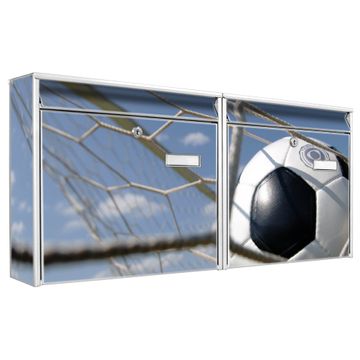 FUNKTION: Die Burg Wächter doppel Briefkastenanlage mit Motiv Fußball bietet Ihnen ein großes Fassungsvermögen, sodass auch A4 Sendungen eingeworfen werden können. Das Namensschild lässt sich individuell beschriften. DESIGN: Die 2 Briefkästen mit Fußball Motiv haben ein sehr ansprechendes und zeitloses Design. Heben Sie Sich von der tristen grauen Masse ab, ohne auf Funktionalität zu verzichten. Sie erhalten 2 Schlüssel sowie das Montagematerial. DETAILS: Der Doppelbriefkasten besteht aus verzinktem Stahl weiß. Er ist 72,5cm x 32,2cm x 10cm groß. Das Motiv besteht aus einer wetter- und UV-festen Folie, die Ihren Briefkasten zusätzlich vor Kratzern schützt. NUTZEN: Die stabile Bauart sowie die Wetterfestigkeit machen diese doppel Briefkästen zu einem zuverlässigen Begleiter im Alltag. Effektvoll in Reihe gehangen schmückt die Anlage jede Hauswand. BANJADO: Ihr Briefkasten wird in Sachsen in einer kleinen Manufaktur von Hand veredelt. Die Motivfolie ist lösungsmittelfrei und schutzlaminiert für einen langen Halt. Wir legen großen Wert auf die Verbindung von Funktionalität und Design. Sie erhalten Handarbeit aus Sachsen.