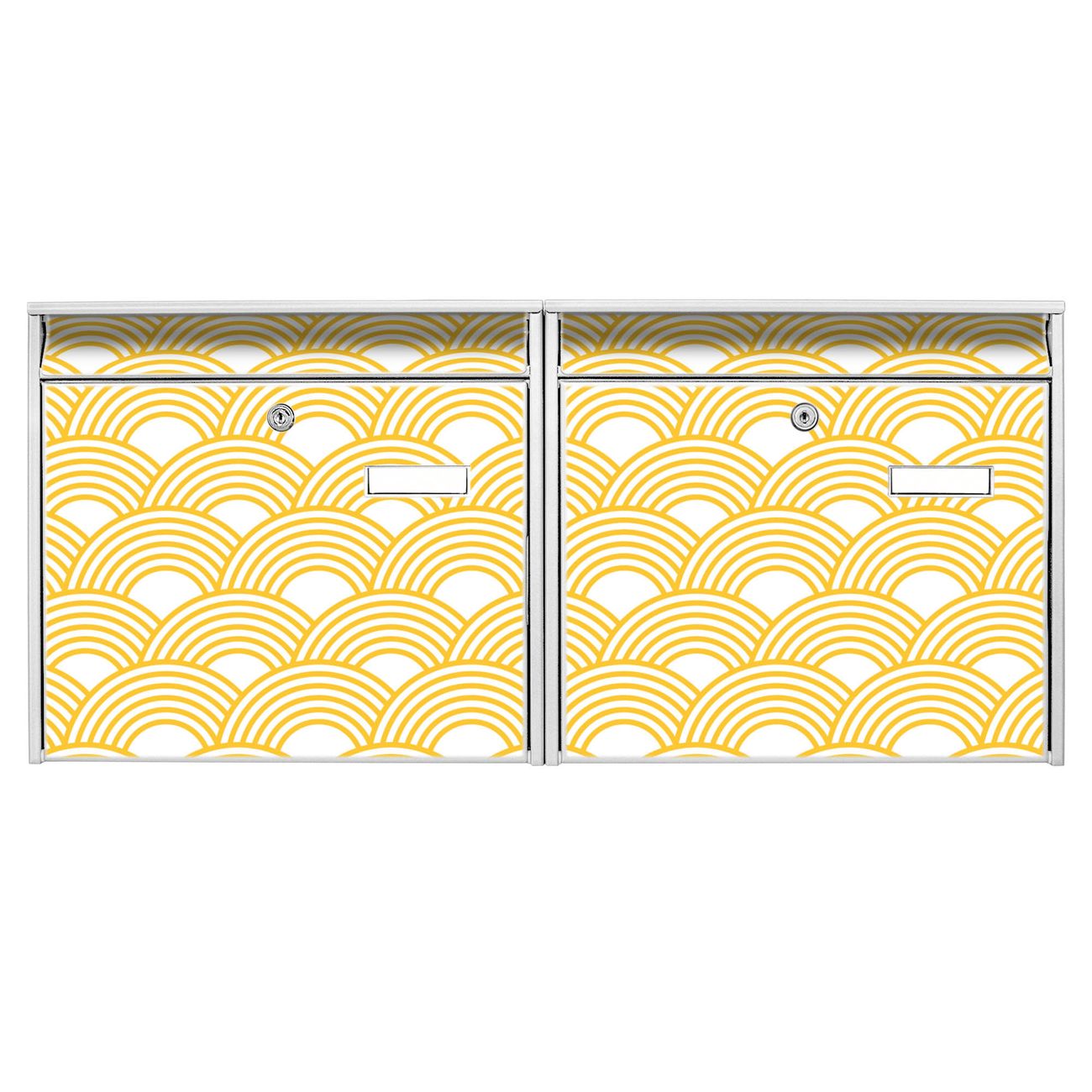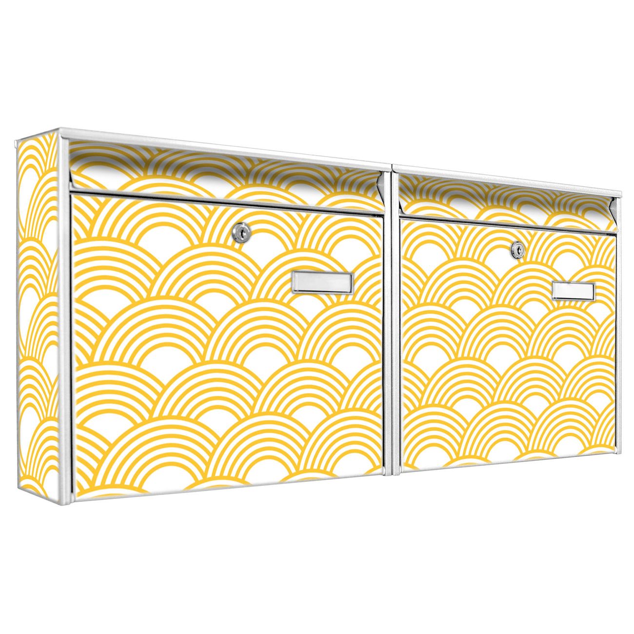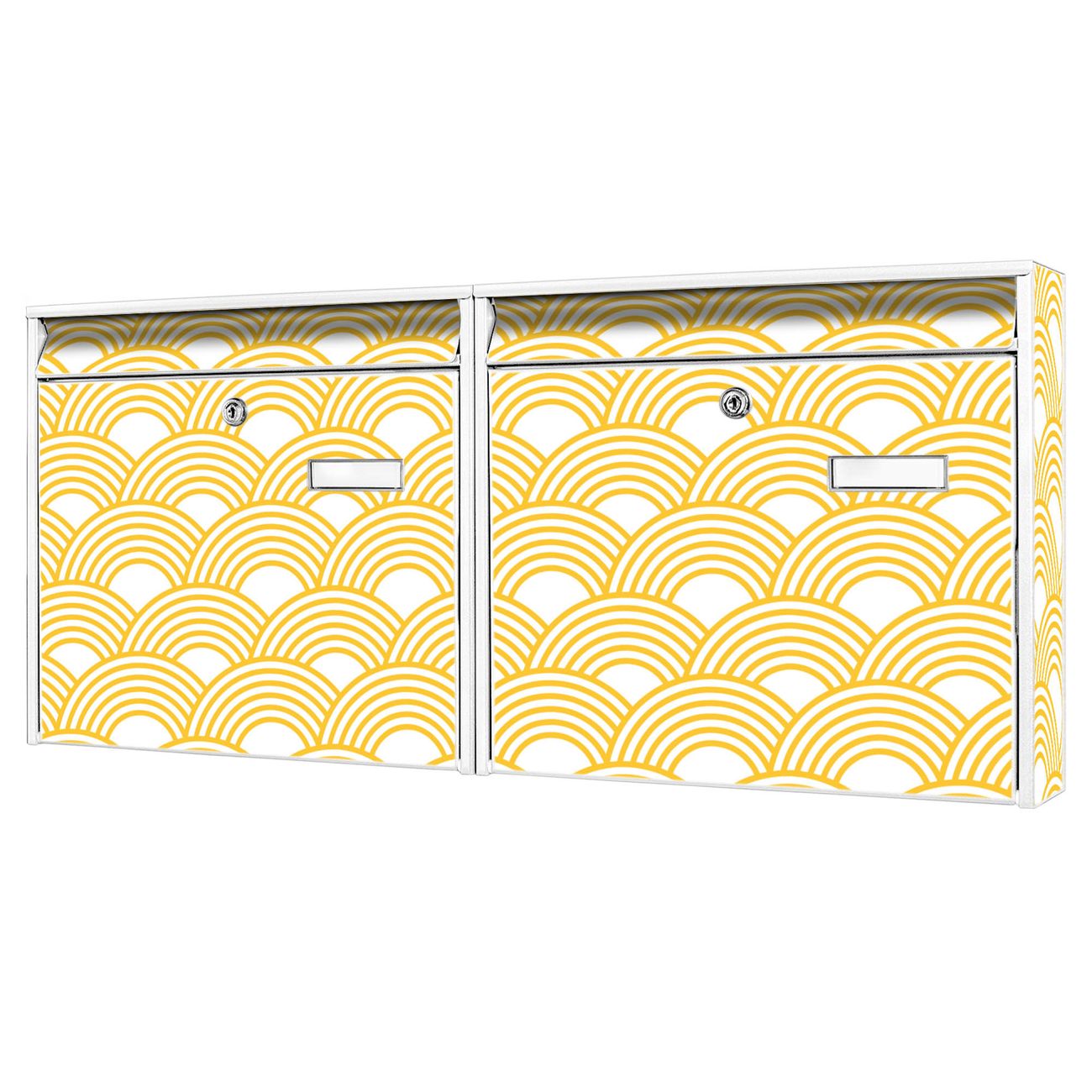 FUNKTION: Die Burg Wächter doppel Briefkastenanlage mit Motiv Gelbe Wellen bietet Ihnen ein großes Fassungsvermögen, sodass auch A4 Sendungen eingeworfen werden können. Das Namensschild lässt sich individuell beschriften. DESIGN: Die 2 Briefkästen mit Gelbe Wellen Motiv haben ein sehr ansprechendes und zeitloses Design. Heben Sie Sich von der tristen grauen Masse ab, ohne auf Funktionalität zu verzichten. Sie erhalten 2 Schlüssel sowie das Montagematerial. DETAILS: Der Doppelbriefkasten besteht aus verzinktem Stahl weiß. Er ist 72,5cm x 32,2cm x 10cm groß. Das Motiv besteht aus einer wetter- und UV-festen Folie, die Ihren Briefkasten zusätzlich vor Kratzern schützt. NUTZEN: Die stabile Bauart sowie die Wetterfestigkeit machen diese doppel Briefkästen zu einem zuverlässigen Begleiter im Alltag. Effektvoll in Reihe gehangen schmückt die Anlage jede Hauswand. BANJADO: Ihr Briefkasten wird in Sachsen in einer kleinen Manufaktur von Hand veredelt. Die Motivfolie ist lösungsmittelfrei und schutzlaminiert für einen langen Halt. Wir legen großen Wert auf die Verbindung von Funktionalität und Design. Sie erhalten Handarbeit aus Sachsen.