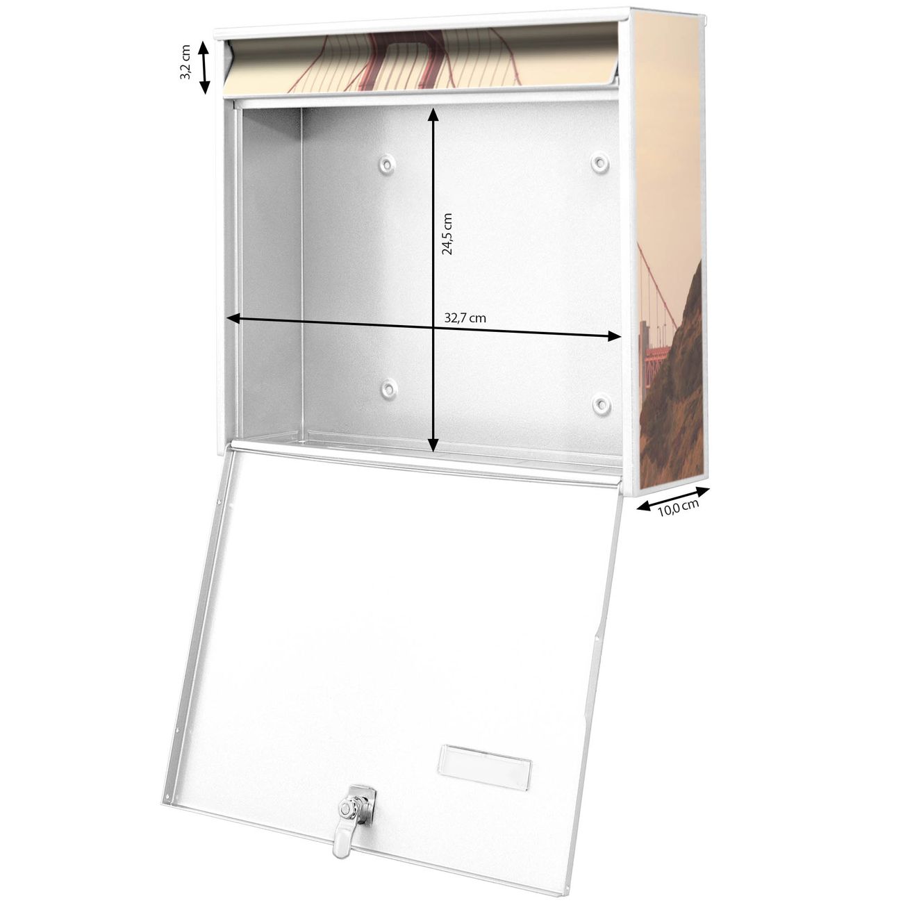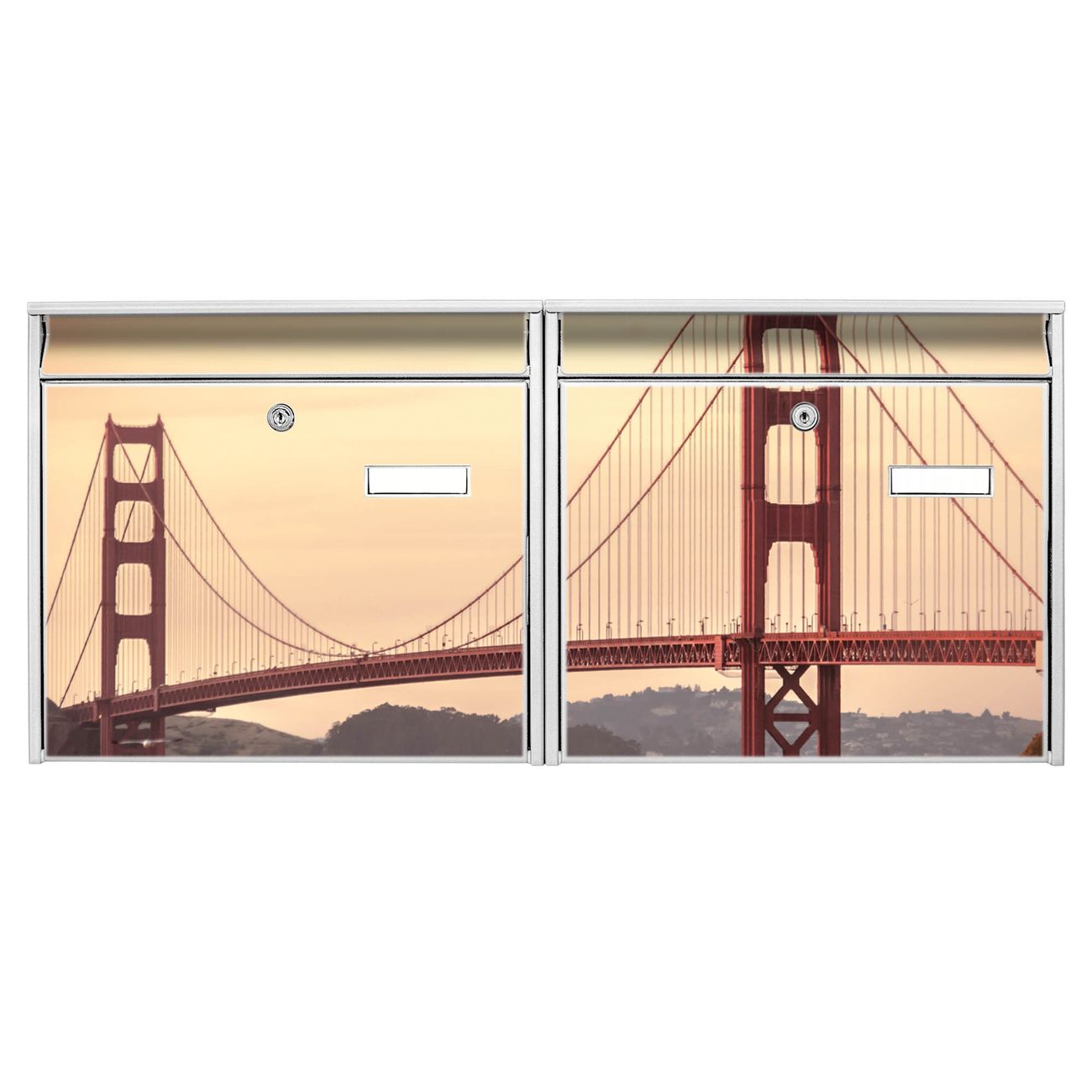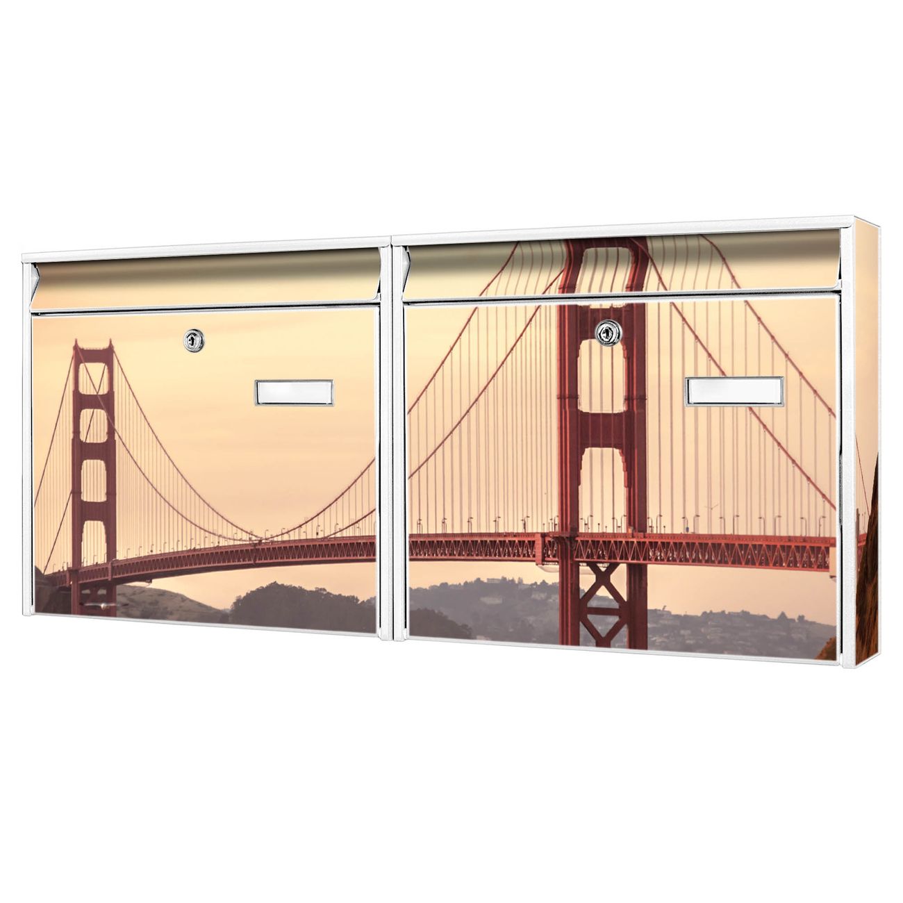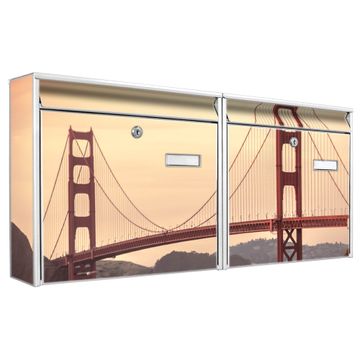 FUNKTION: Die Burg Wächter doppel Briefkastenanlage mit Motiv Golden Gate Bridge 2 bietet Ihnen ein großes Fassungsvermögen, sodass auch A4 Sendungen eingeworfen werden können. Das Namensschild lässt sich individuell beschriften. DESIGN: Die 2 Briefkästen mit Golden Gate Bridge 2 Motiv haben ein sehr ansprechendes und zeitloses Design. Heben Sie Sich von der tristen grauen Masse ab, ohne auf Funktionalität zu verzichten. Sie erhalten 2 Schlüssel sowie das Montagematerial. DETAILS: Der Doppelbriefkasten besteht aus verzinktem Stahl weiß. Er ist 72,5cm x 32,2cm x 10cm groß. Das Motiv besteht aus einer wetter- und UV-festen Folie, die Ihren Briefkasten zusätzlich vor Kratzern schützt. NUTZEN: Die stabile Bauart sowie die Wetterfestigkeit machen diese doppel Briefkästen zu einem zuverlässigen Begleiter im Alltag. Effektvoll in Reihe gehangen schmückt die Anlage jede Hauswand. BANJADO: Ihr Briefkasten wird in Sachsen in einer kleinen Manufaktur von Hand veredelt. Die Motivfolie ist lösungsmittelfrei und schutzlaminiert für einen langen Halt. Wir legen großen Wert auf die Verbindung von Funktionalität und Design. Sie erhalten Handarbeit aus Sachsen.