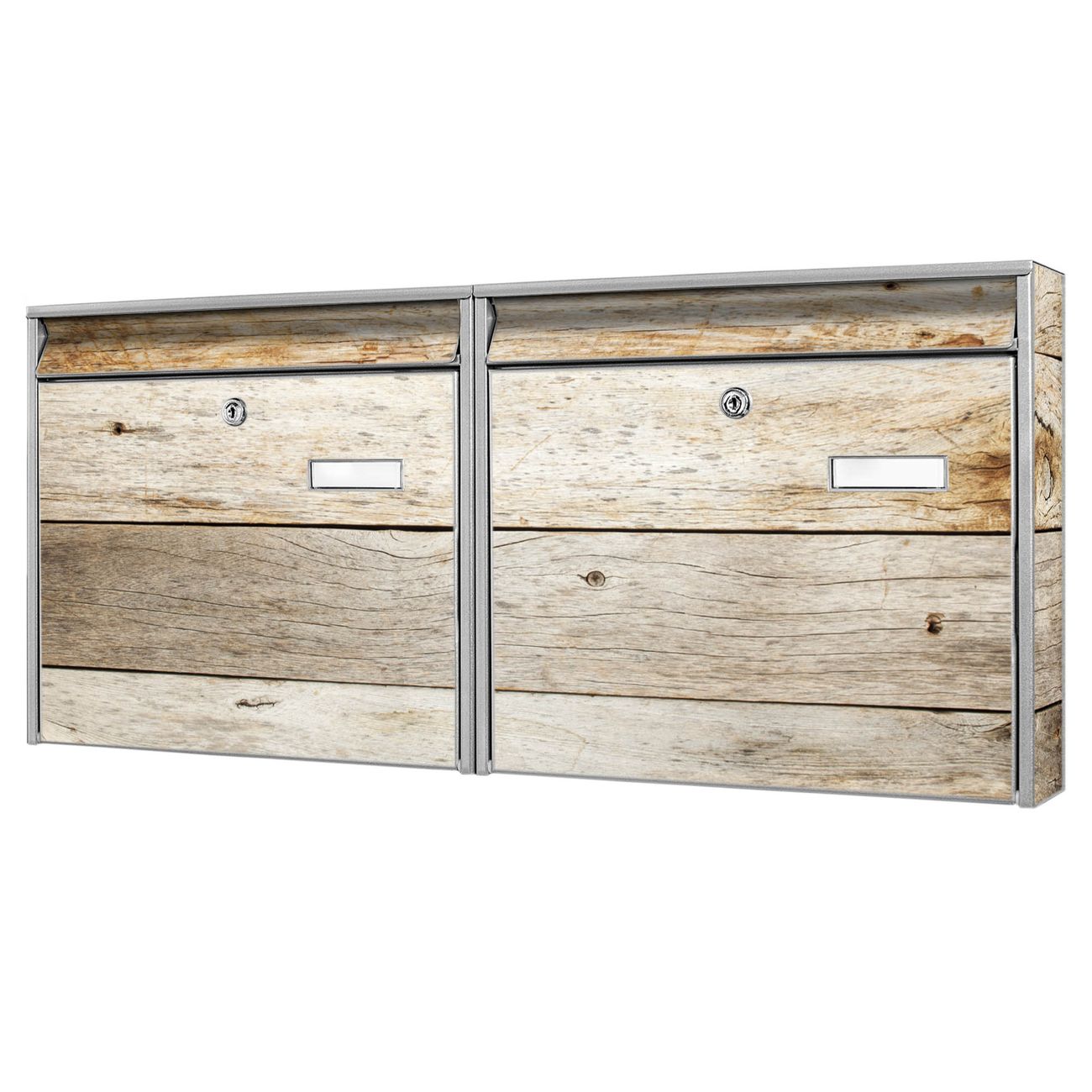 FUNKTION: Die Burg Wächter doppel Briefkastenanlage mit Motiv Graues Holz bietet Ihnen ein großes Fassungsvermögen, sodass auch A4 Sendungen eingeworfen werden können. Das Namensschild lässt sich individuell beschriften. DESIGN: Die 2 Briefkästen mit Graues Holz Motiv haben ein sehr ansprechendes und zeitloses Design. Heben Sie Sich von der tristen grauen Masse ab, ohne auf Funktionalität zu verzichten. Sie erhalten 2 Schlüssel sowie das Montagematerial. DETAILS: Der Doppelbriefkasten besteht aus verzinktem Stahl weiß. Er ist 72,5cm x 32,2cm x 10cm groß. Das Motiv besteht aus einer wetter- und UV-festen Folie, die Ihren Briefkasten zusätzlich vor Kratzern schützt. NUTZEN: Die stabile Bauart sowie die Wetterfestigkeit machen diese doppel Briefkästen zu einem zuverlässigen Begleiter im Alltag. Effektvoll in Reihe gehangen schmückt die Anlage jede Hauswand. BANJADO: Ihr Briefkasten wird in Sachsen in einer kleinen Manufaktur von Hand veredelt. Die Motivfolie ist lösungsmittelfrei und schutzlaminiert für einen langen Halt. Wir legen großen Wert auf die Verbindung von Funktionalität und Design. Sie erhalten Handarbeit aus Sachsen.