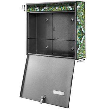 FUNKTION: Die Burg Wächter doppel Briefkastenanlage mit Motiv Grünes Muster bietet Ihnen ein großes Fassungsvermögen, sodass auch A4 Sendungen eingeworfen werden können. Das Namensschild lässt sich individuell beschriften. DESIGN: Die 2 Briefkästen mit Grünes Muster Motiv haben ein sehr ansprechendes und zeitloses Design. Heben Sie Sich von der tristen grauen Masse ab, ohne auf Funktionalität zu verzichten. Sie erhalten 2 Schlüssel sowie das Montagematerial. DETAILS: Der Doppelbriefkasten besteht aus verzinktem Stahl weiß. Er ist 72,5cm x 32,2cm x 10cm groß. Das Motiv besteht aus einer wetter- und UV-festen Folie, die Ihren Briefkasten zusätzlich vor Kratzern schützt. NUTZEN: Die stabile Bauart sowie die Wetterfestigkeit machen diese doppel Briefkästen zu einem zuverlässigen Begleiter im Alltag. Effektvoll in Reihe gehangen schmückt die Anlage jede Hauswand. BANJADO: Ihr Briefkasten wird in Sachsen in einer kleinen Manufaktur von Hand veredelt. Die Motivfolie ist lösungsmittelfrei und schutzlaminiert für einen langen Halt. Wir legen großen Wert auf die Verbindung von Funktionalität und Design. Sie erhalten Handarbeit aus Sachsen.