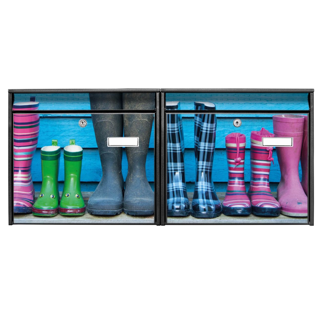 FUNKTION: Die Burg Wächter doppel Briefkastenanlage mit Motiv Gummistiefel bietet Ihnen ein großes Fassungsvermögen, sodass auch A4 Sendungen eingeworfen werden können. Das Namensschild lässt sich individuell beschriften. DESIGN: Die 2 Briefkästen mit Gummistiefel Motiv haben ein sehr ansprechendes und zeitloses Design. Heben Sie Sich von der tristen grauen Masse ab, ohne auf Funktionalität zu verzichten. Sie erhalten 2 Schlüssel sowie das Montagematerial. DETAILS: Der Doppelbriefkasten besteht aus verzinktem Stahl weiß. Er ist 72,5cm x 32,2cm x 10cm groß. Das Motiv besteht aus einer wetter- und UV-festen Folie, die Ihren Briefkasten zusätzlich vor Kratzern schützt. NUTZEN: Die stabile Bauart sowie die Wetterfestigkeit machen diese doppel Briefkästen zu einem zuverlässigen Begleiter im Alltag. Effektvoll in Reihe gehangen schmückt die Anlage jede Hauswand. BANJADO: Ihr Briefkasten wird in Sachsen in einer kleinen Manufaktur von Hand veredelt. Die Motivfolie ist lösungsmittelfrei und schutzlaminiert für einen langen Halt. Wir legen großen Wert auf die Verbindung von Funktionalität und Design. Sie erhalten Handarbeit aus Sachsen.